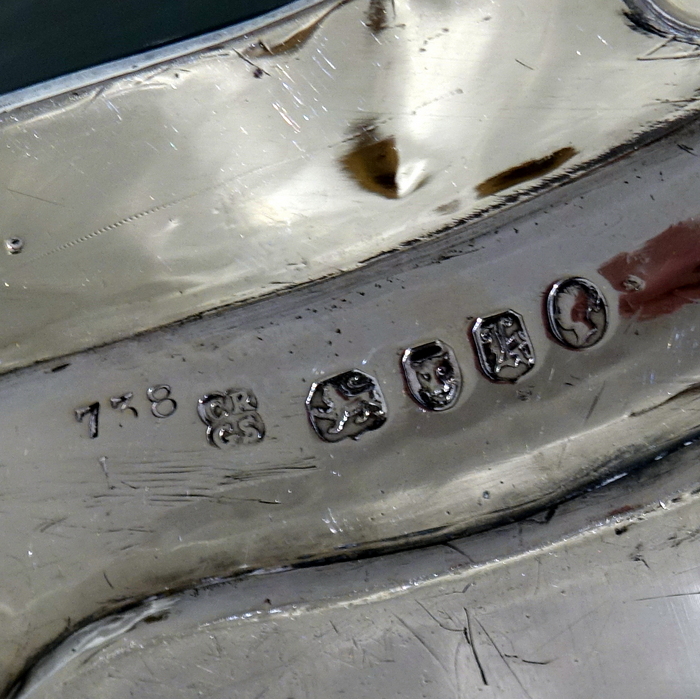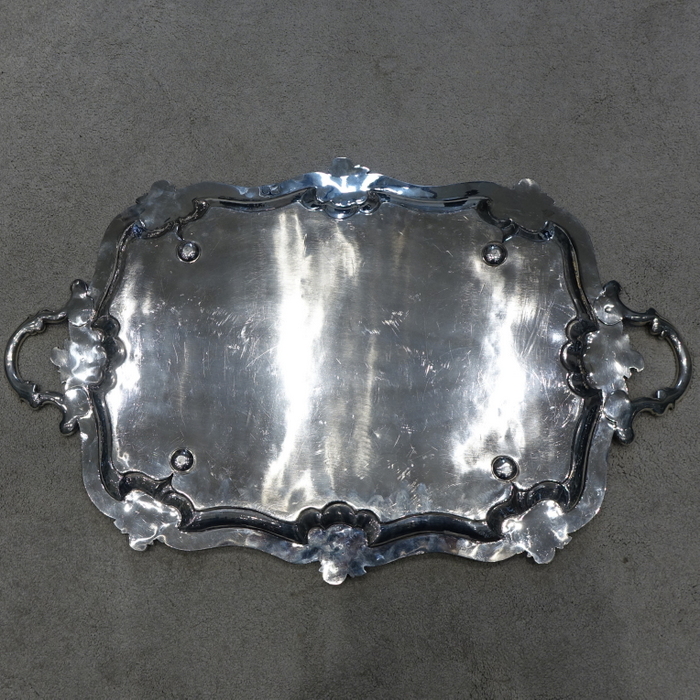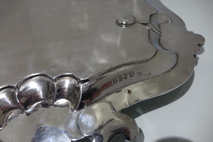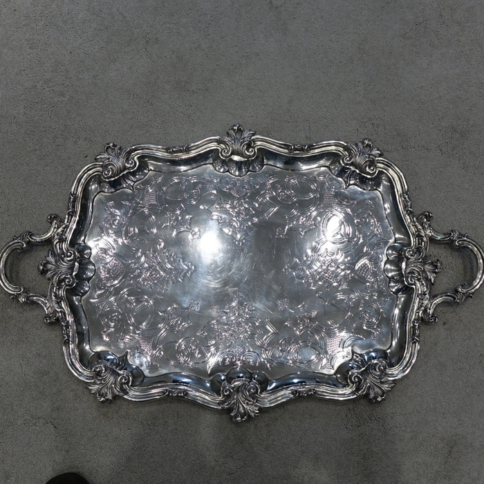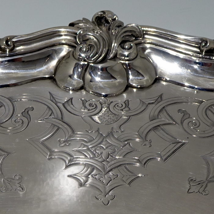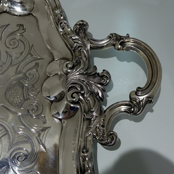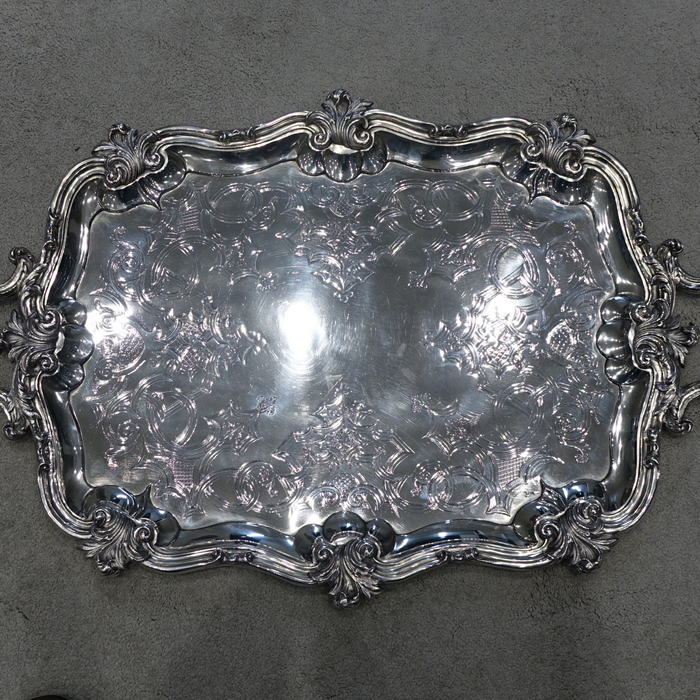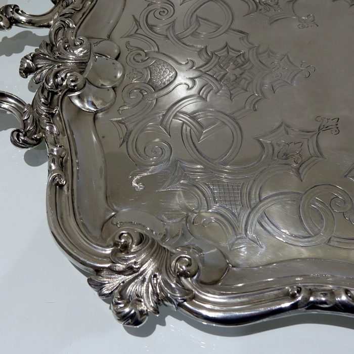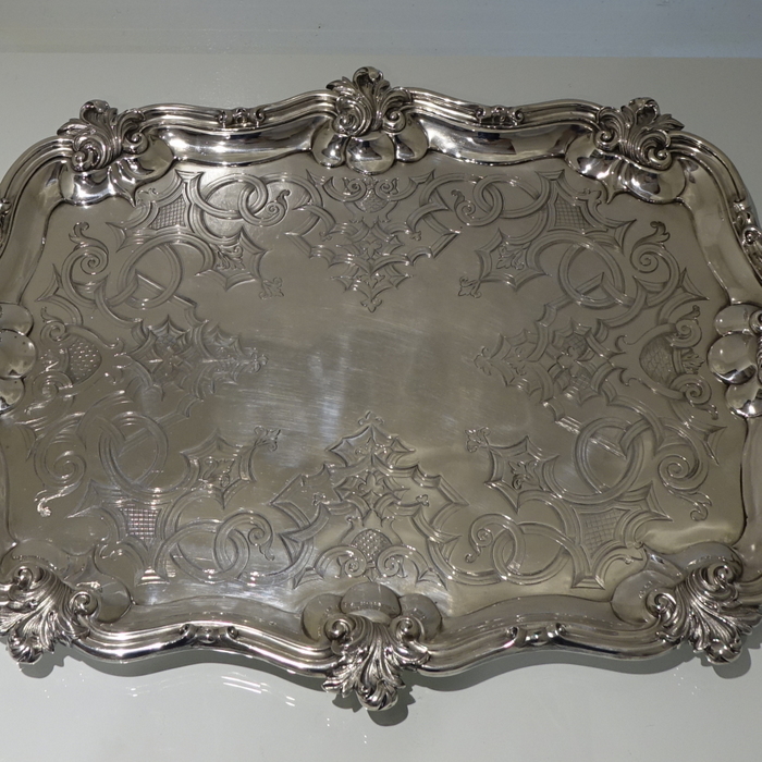 A very stylish large 19th century silver rectangular shaped tray with interspaced floral motifs for highlights on the border. Â The centre of the tray has stylish gothic engraving which elegantly forms a cartouche.