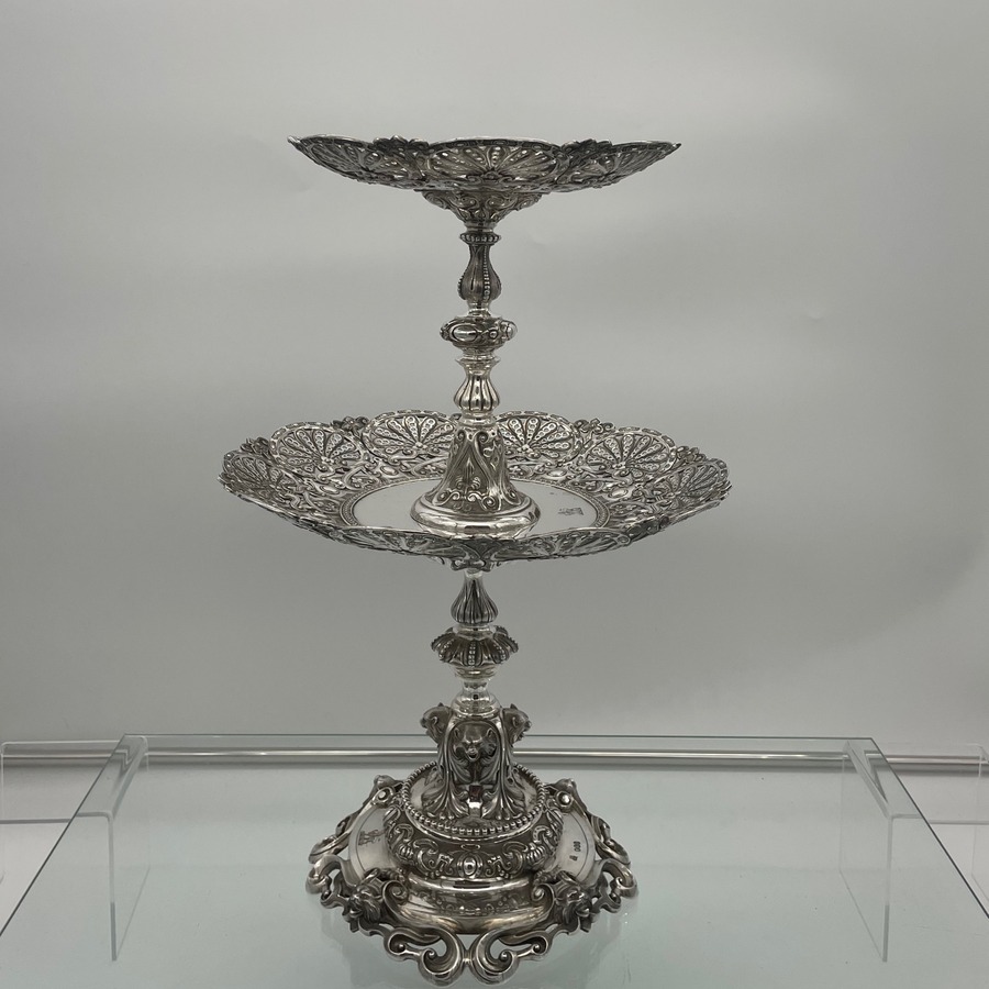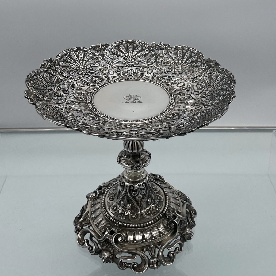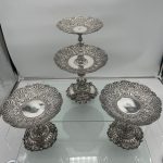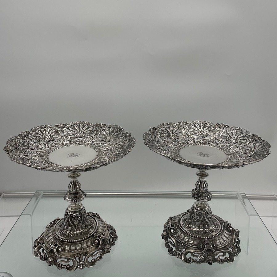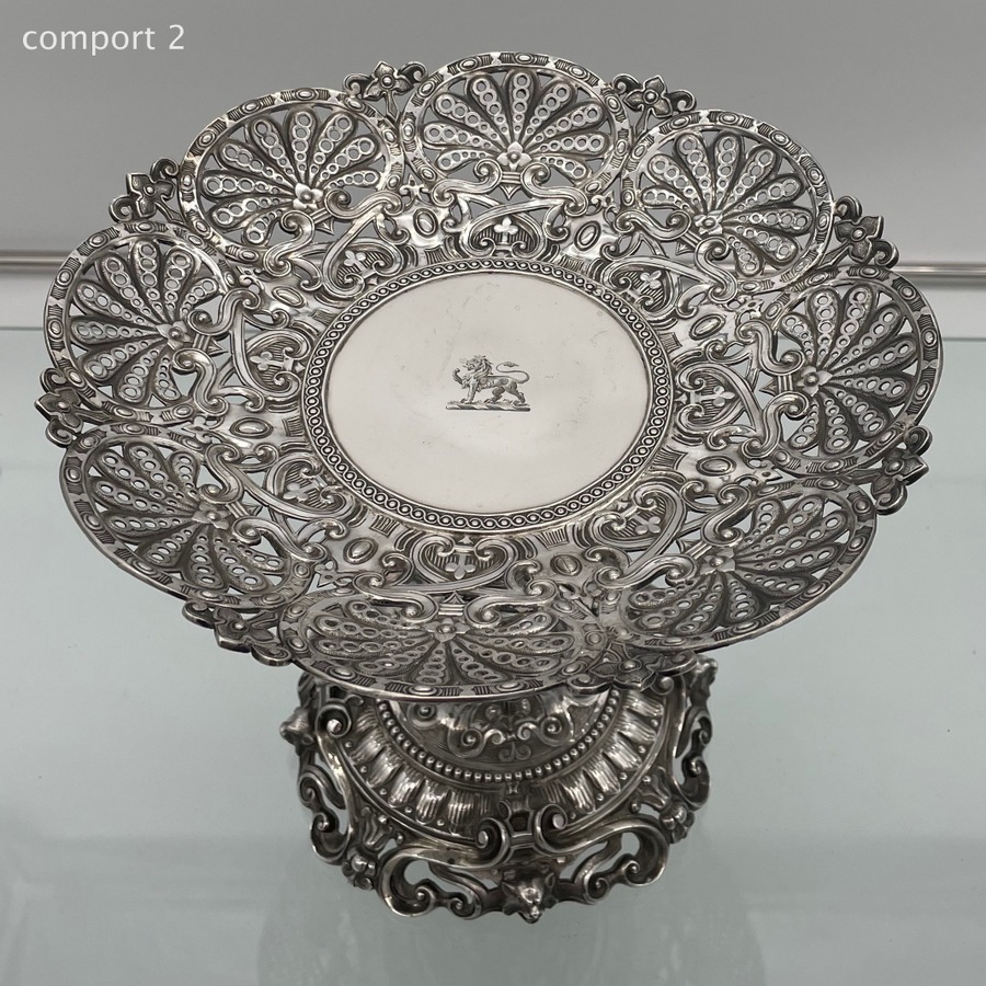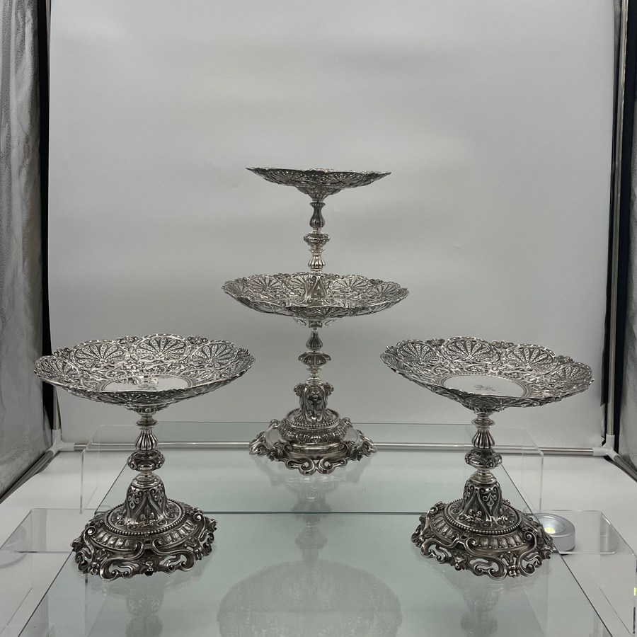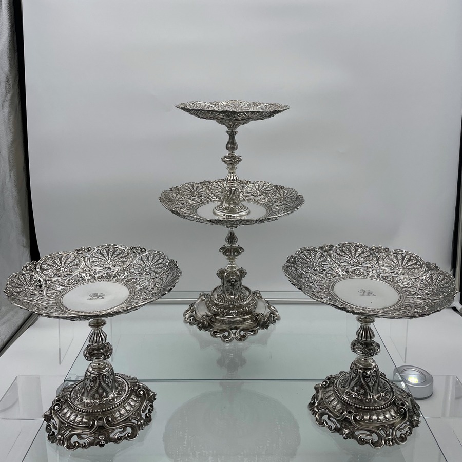 A very important suite of silver comports made by the highly renowned Victorian silversmith Robert Garrard. Â The larger central comport has two tiers which have superb floral hand pierced outer edges. Â The smaller pair of comports have matching plates (tiers) and elaborate cast stems for lowlights. Â There are hand engraved contemporary crests for importance.