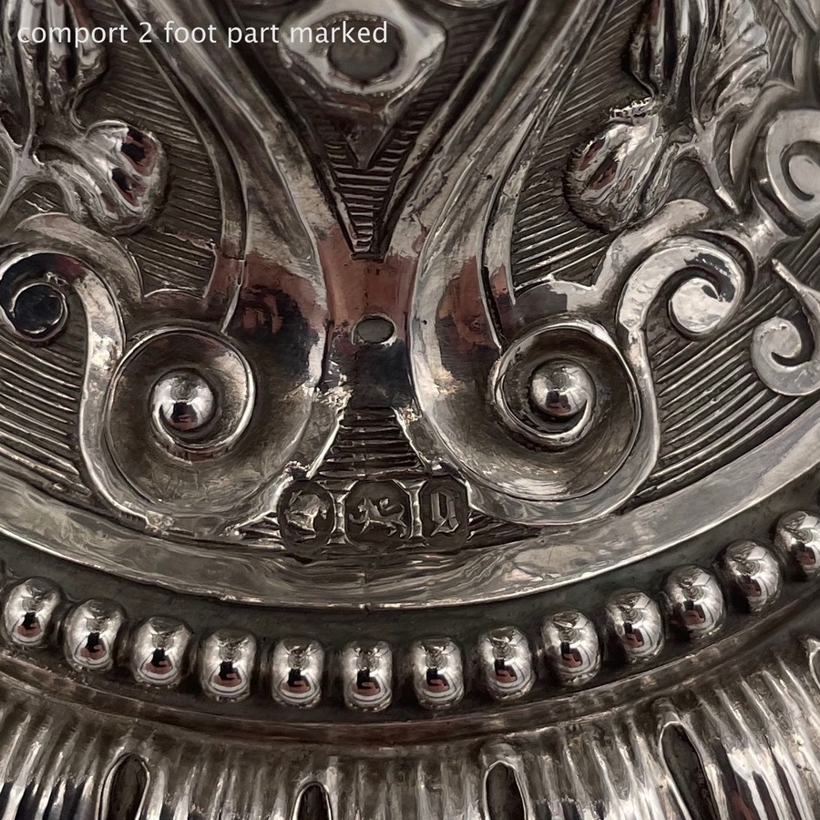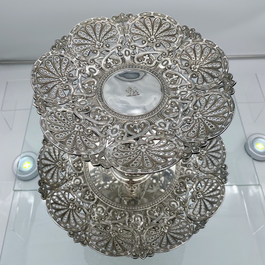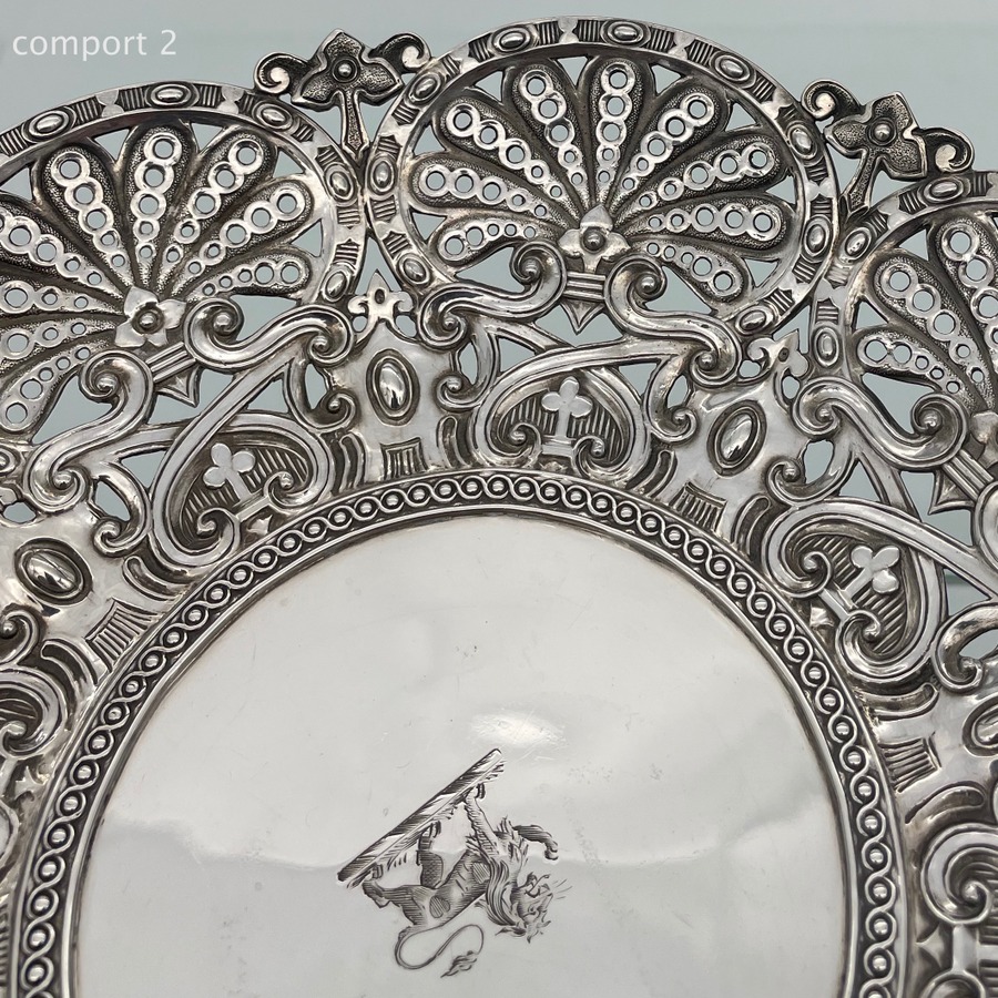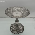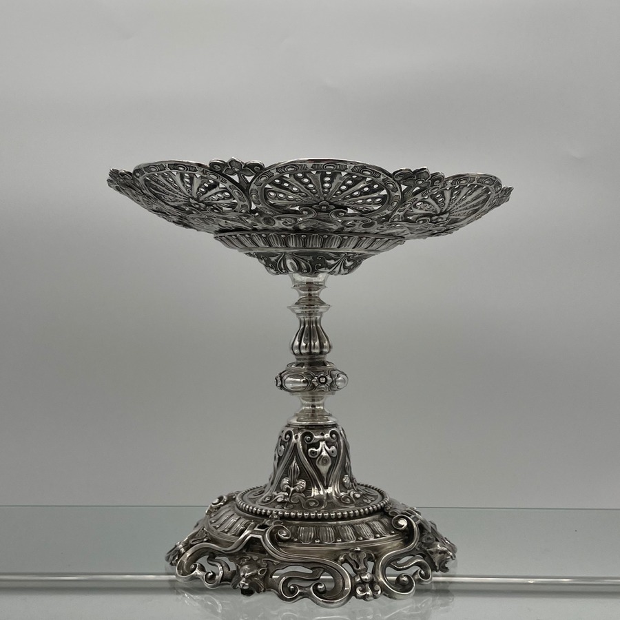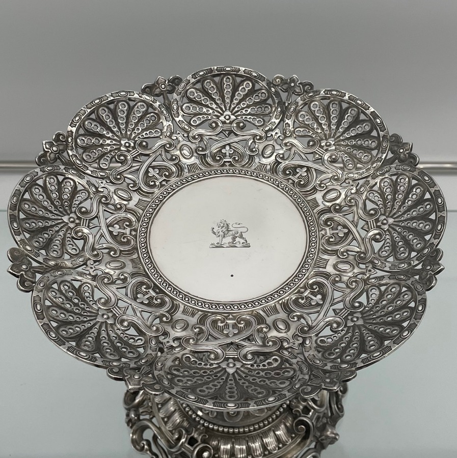 A very important suite of silver comports made by the highly renowned Victorian silversmith Robert Garrard. Â The larger central comport has two tiers which have superb floral hand pierced outer edges. Â The smaller pair of comports have matching plates (tiers) and elaborate cast stems for lowlights. Â There are hand engraved contemporary crests for importance.