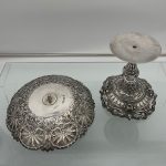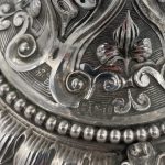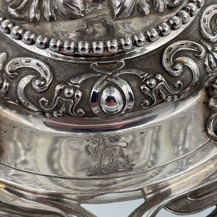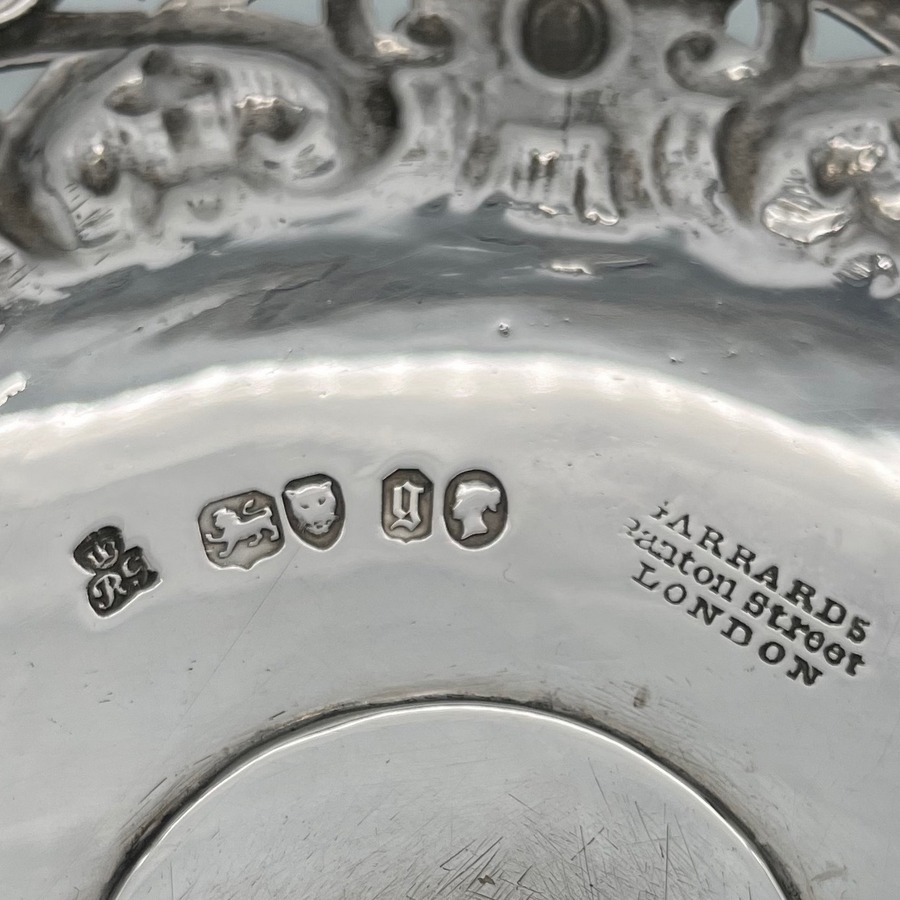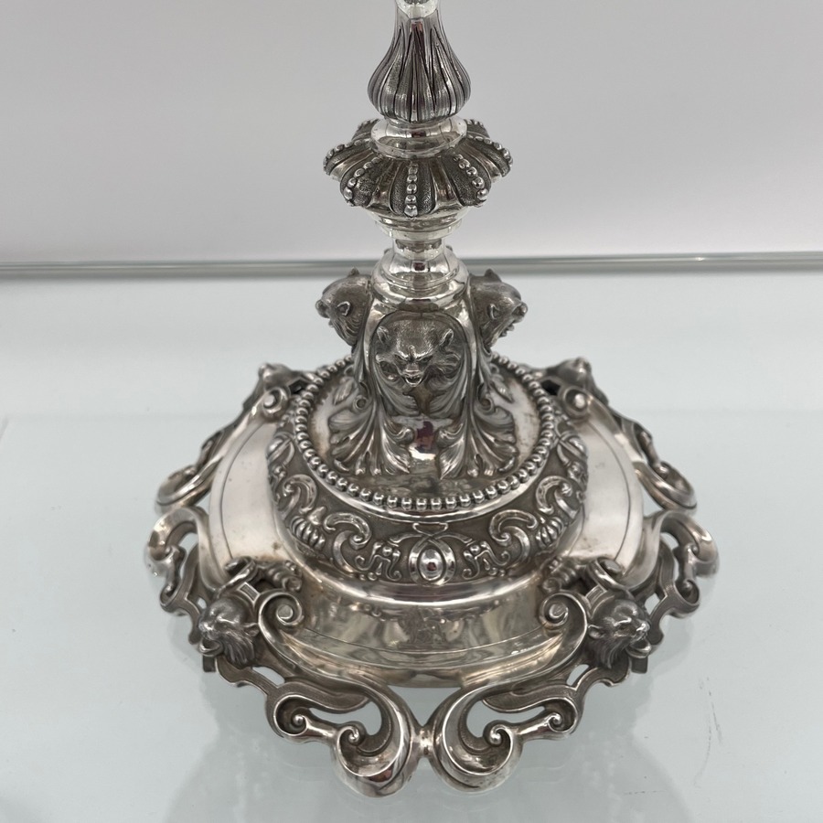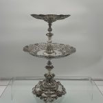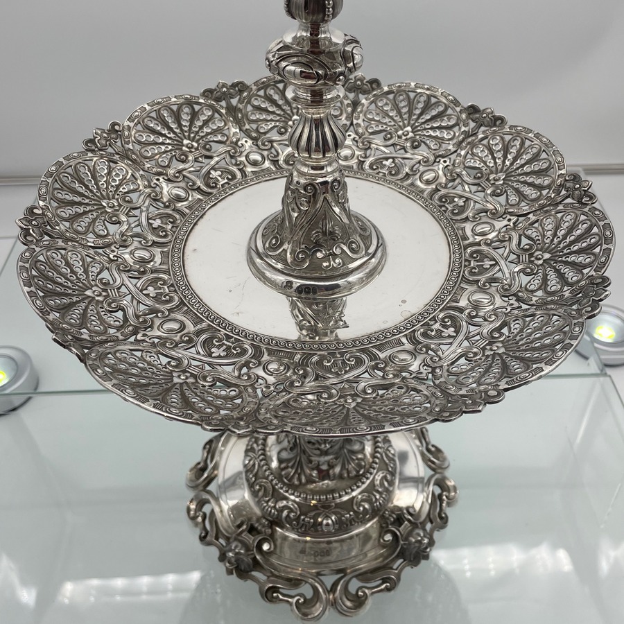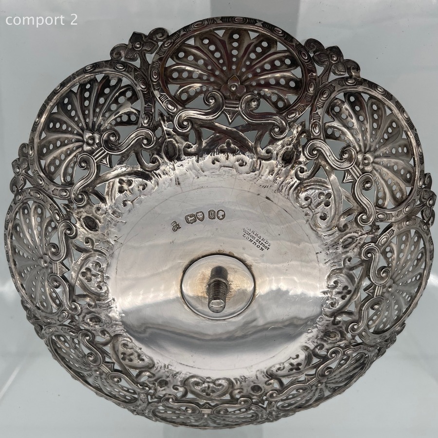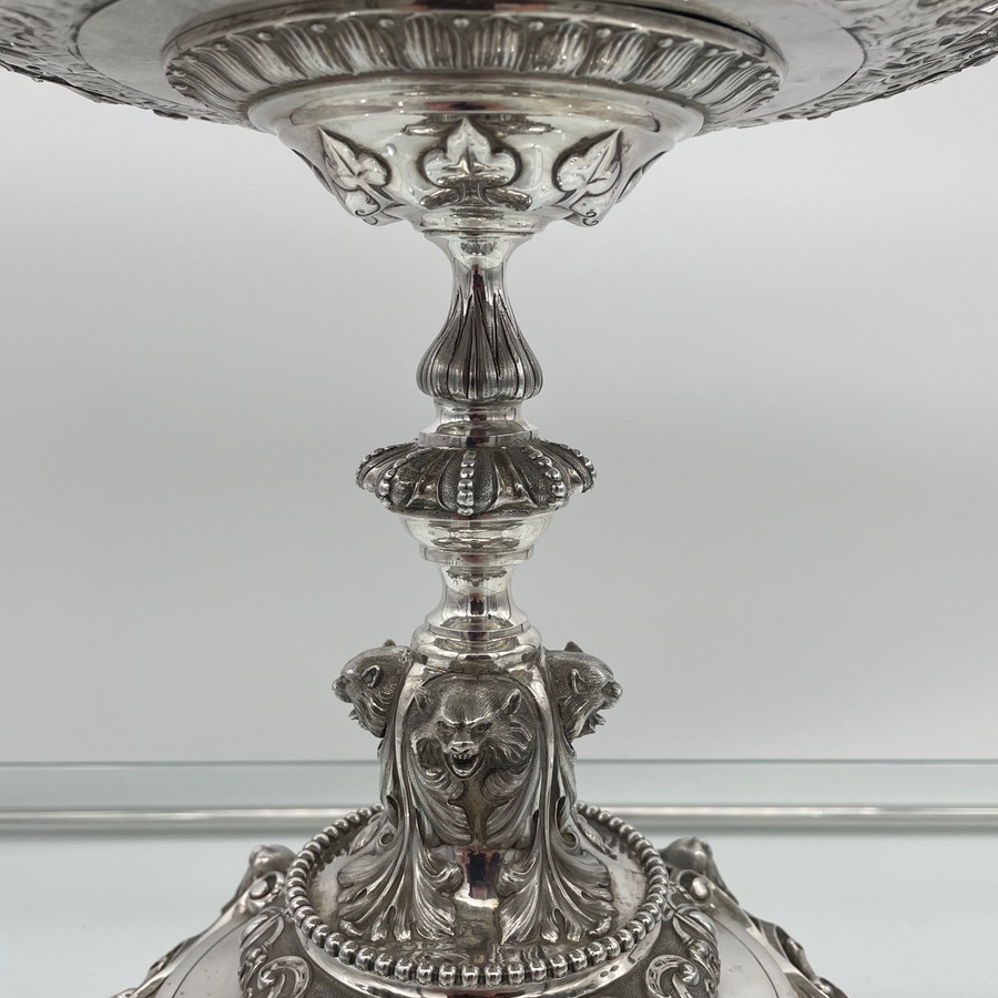 A very important suite of silver comports made by the highly renowned Victorian silversmith Robert Garrard. Â The larger central comport has two tiers which have superb floral hand pierced outer edges. Â The smaller pair of comports have matching plates (tiers) and elaborate cast stems for lowlights. Â There are hand engraved contemporary crests for importance.