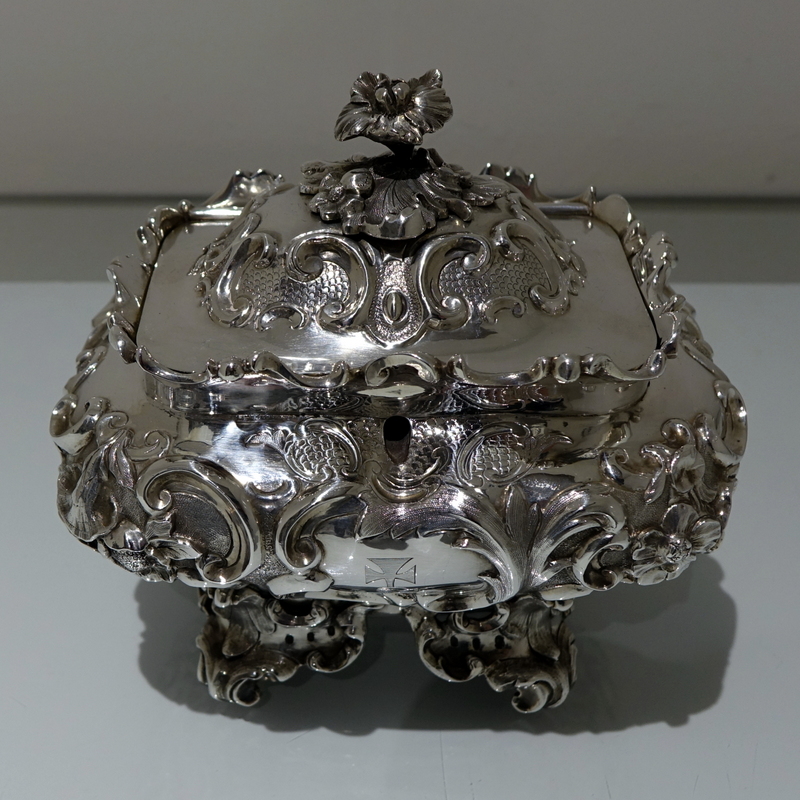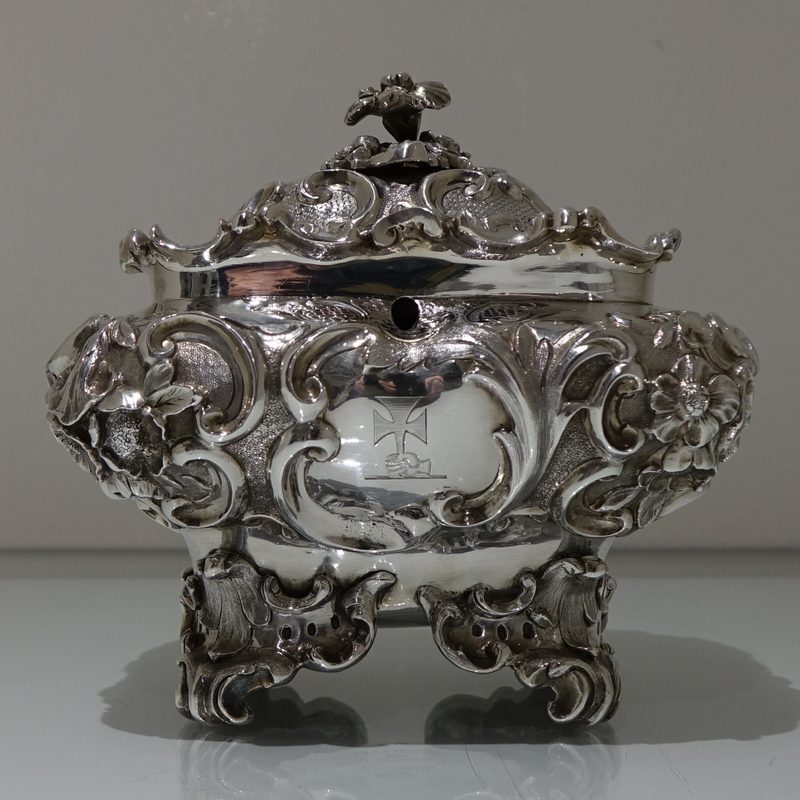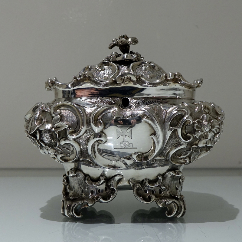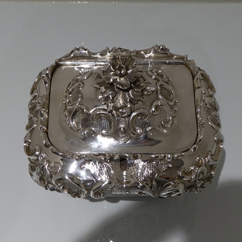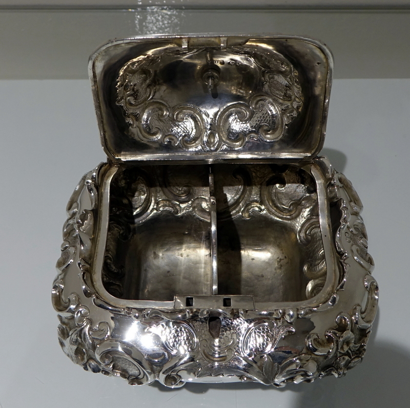 A Â truly stunning and incredibly rare floral embossed locking tea caddy. Â The embossing is set on a matt background for decorative contrast. Â The centre front has an elegant contemporary crest inside its cartouche for importance. Â The lid is hinged and there is a detachable divider insert set inside the inner bowl.