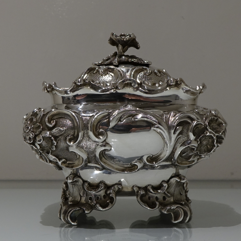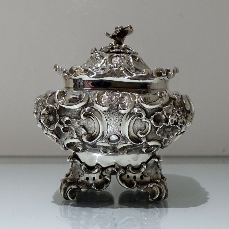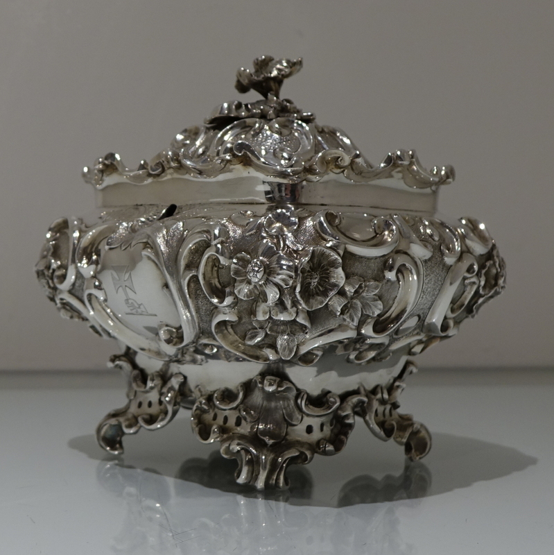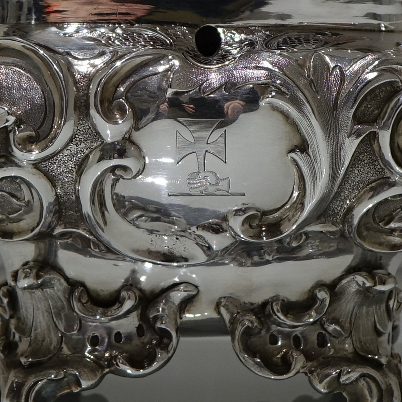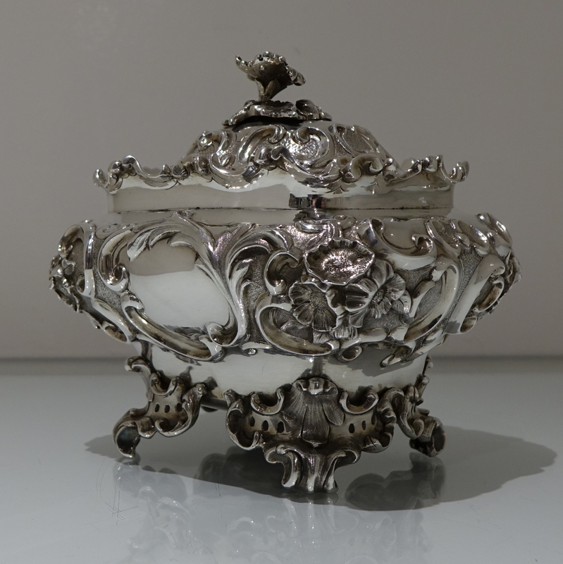 A Â truly stunning and incredibly rare floral embossed locking tea caddy. Â The embossing is set on a matt background for decorative contrast. Â The centre front has an elegant contemporary crest inside its cartouche for importance. Â The lid is hinged and there is a detachable divider insert set inside the inner bowl.