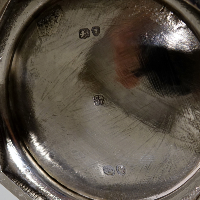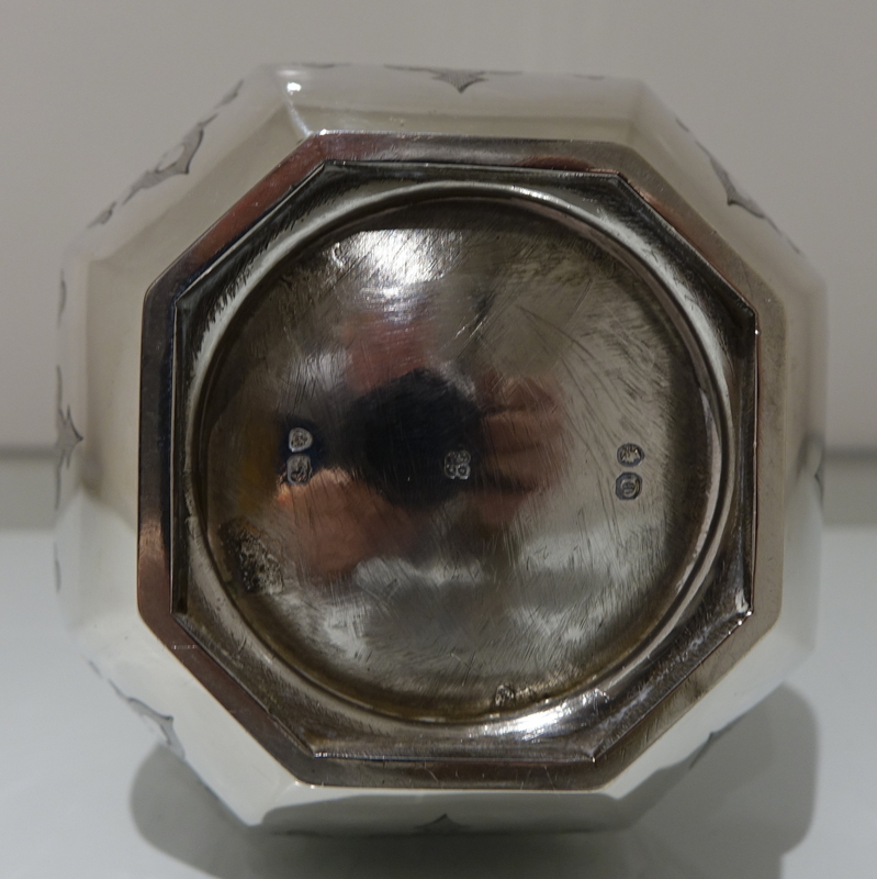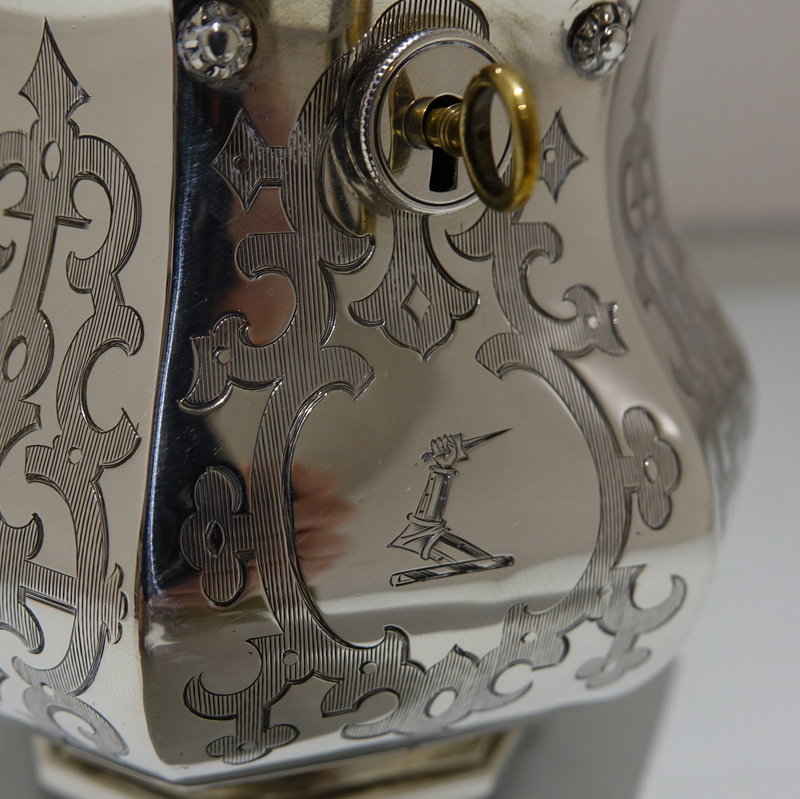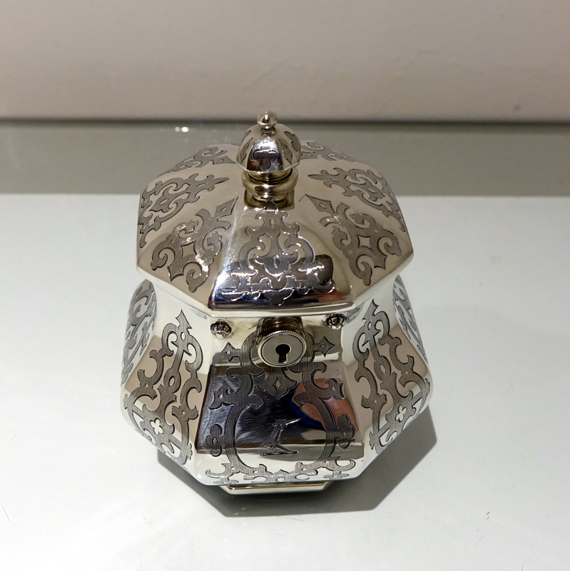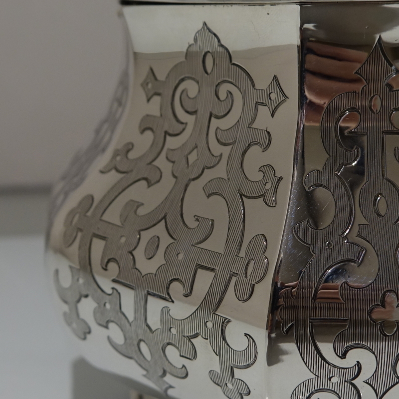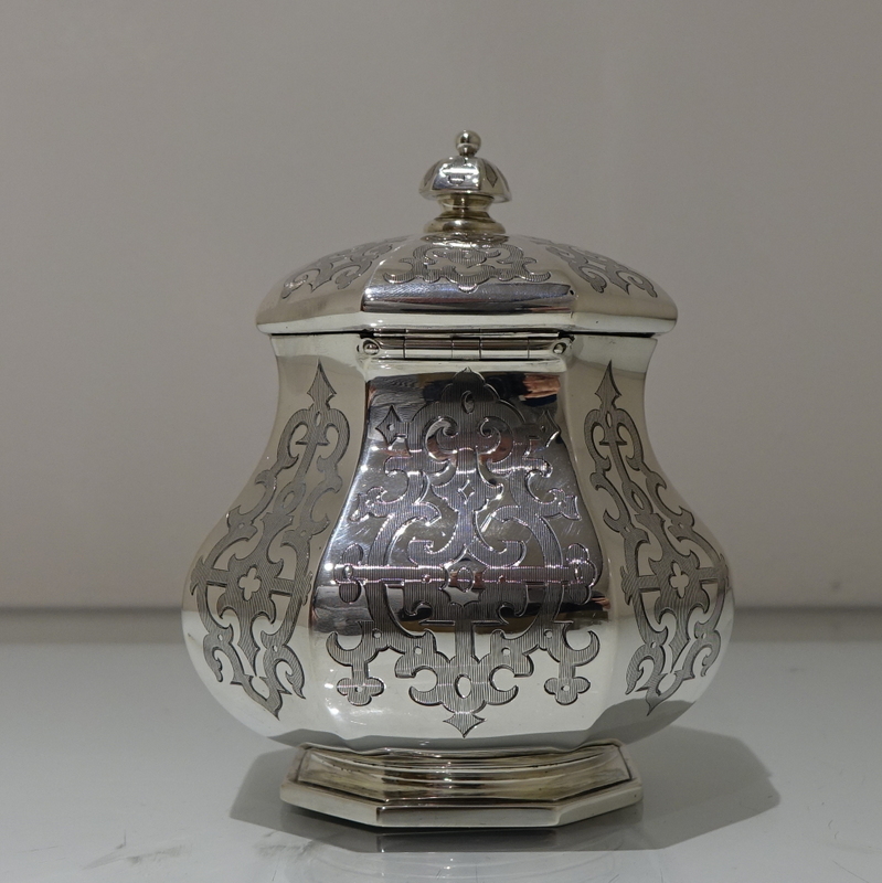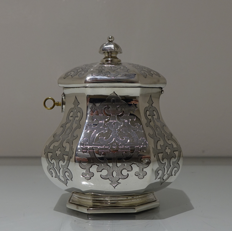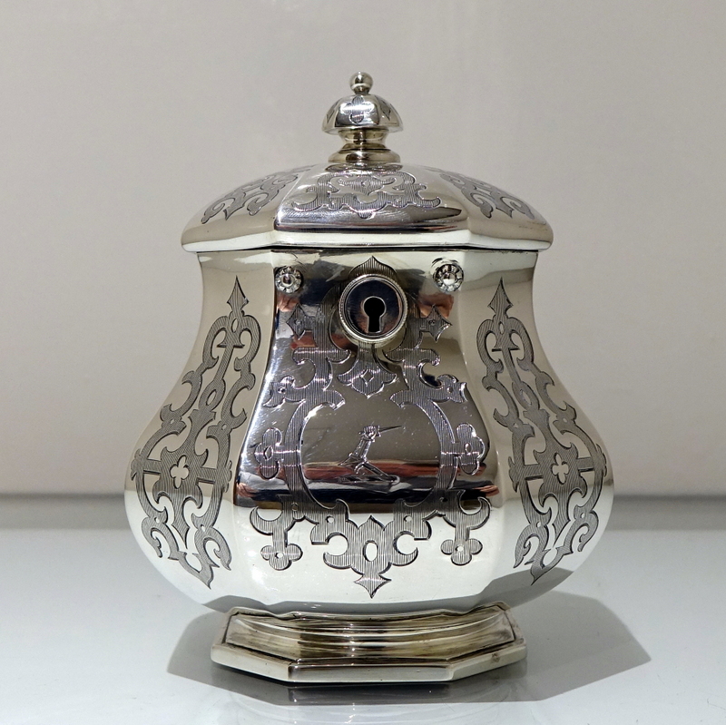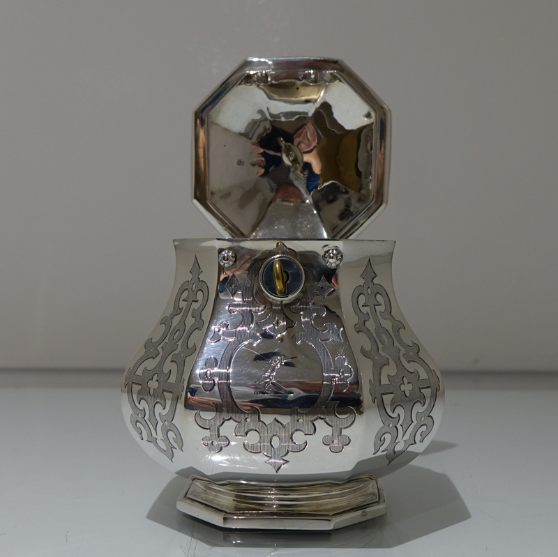 A beautiful and extremely elegant mid 19th century panelled locking tea caddy decorated with intricate “gothic” style bright cut engraving. The lid is hinged and has additional bright cut engraving for highlights. The centre front has a contemporary engraved crest for importance.