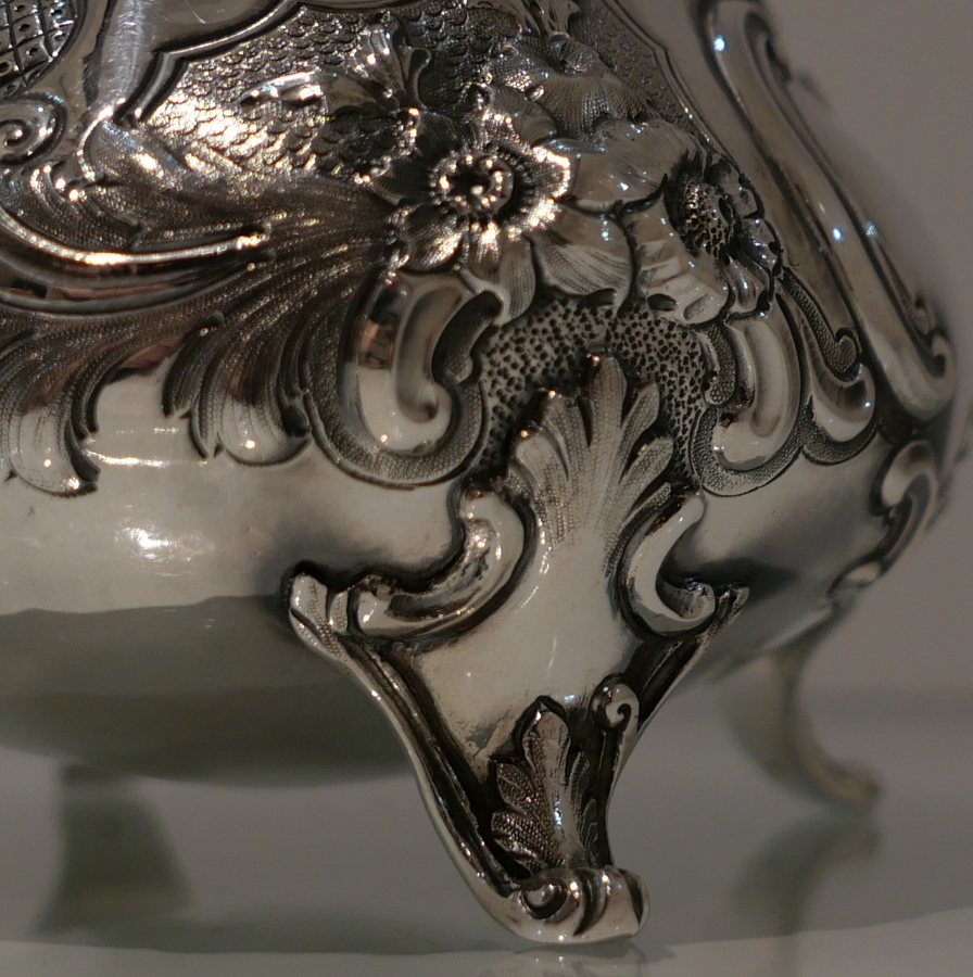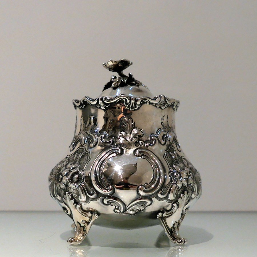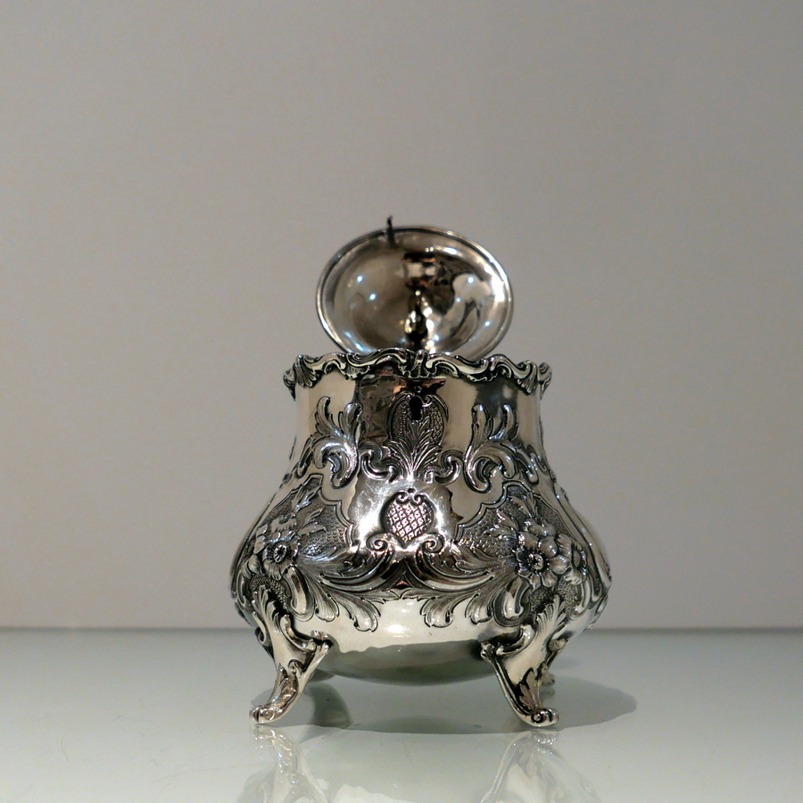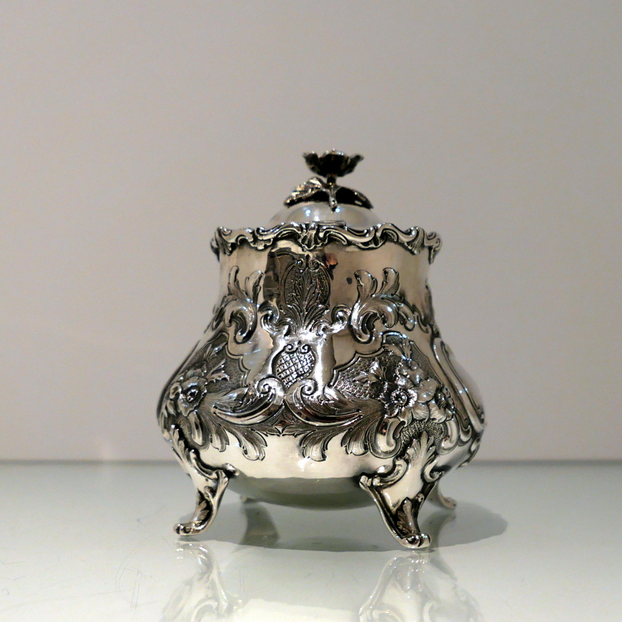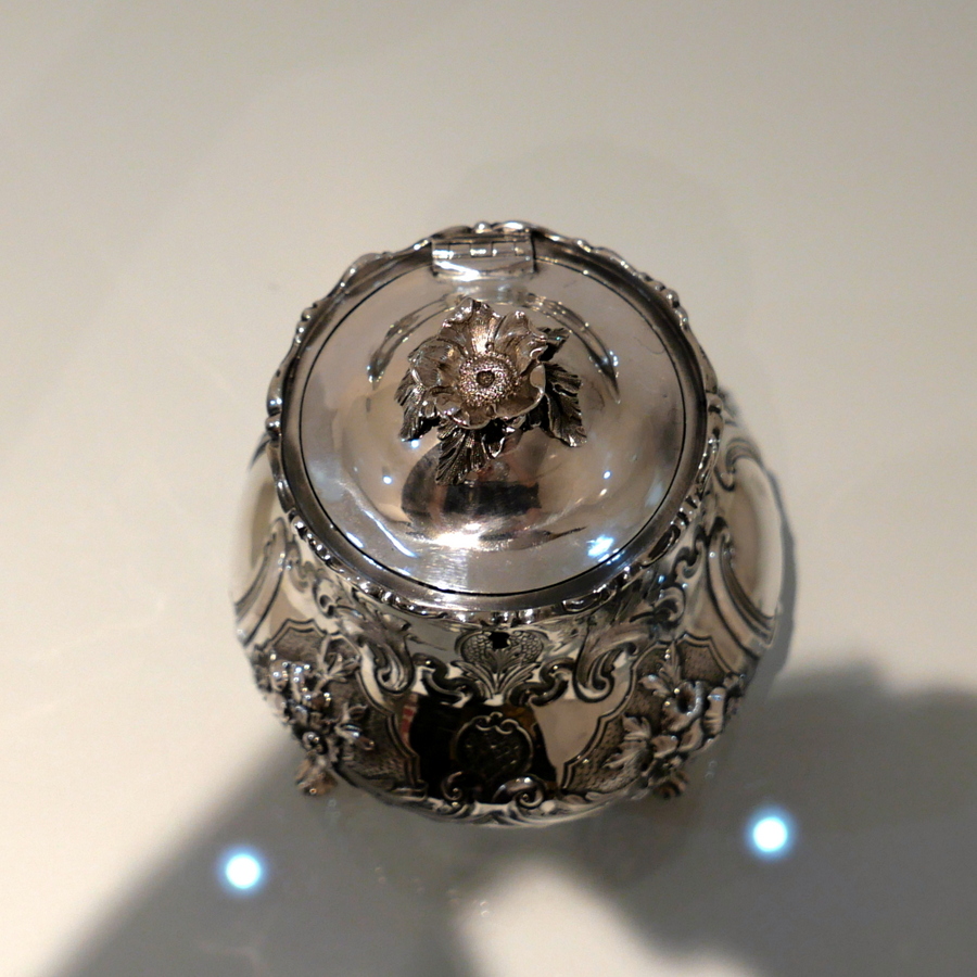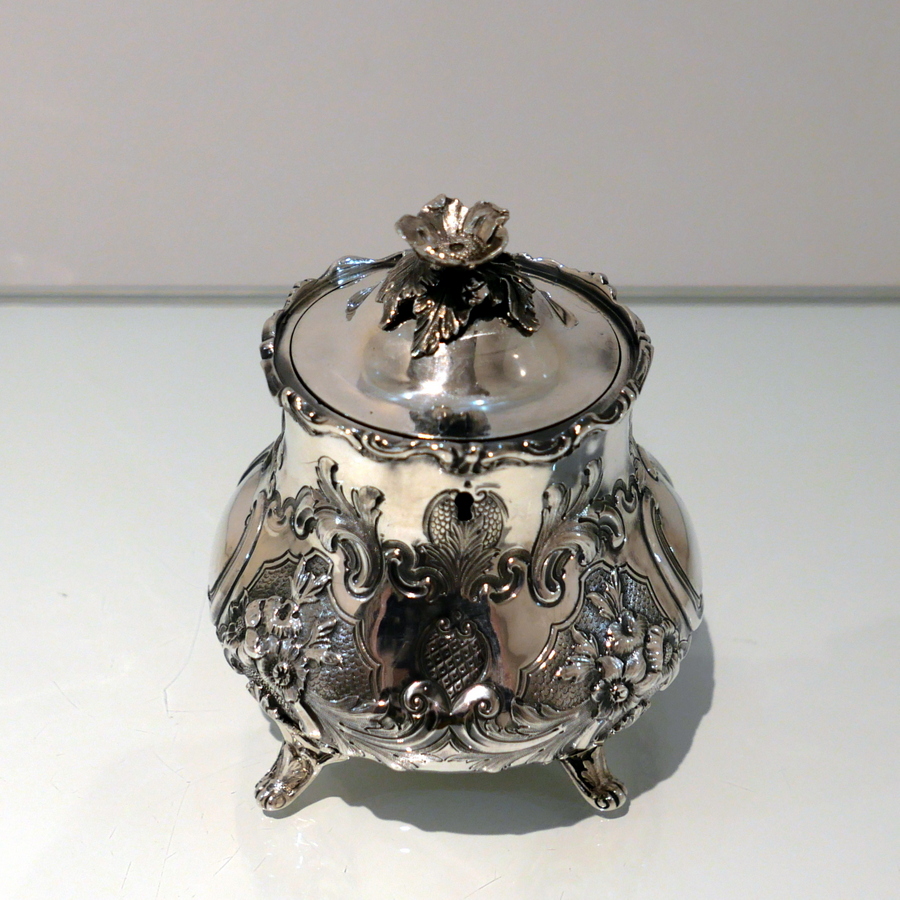 A fine and very unusual Victorian silver circular tea caddy decorated with beautiful floral embossing. Â The caddy sits on four stylish naturalistic feet and the hinged lid is crowned with an elegant finial.