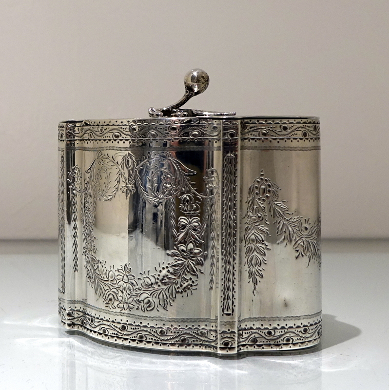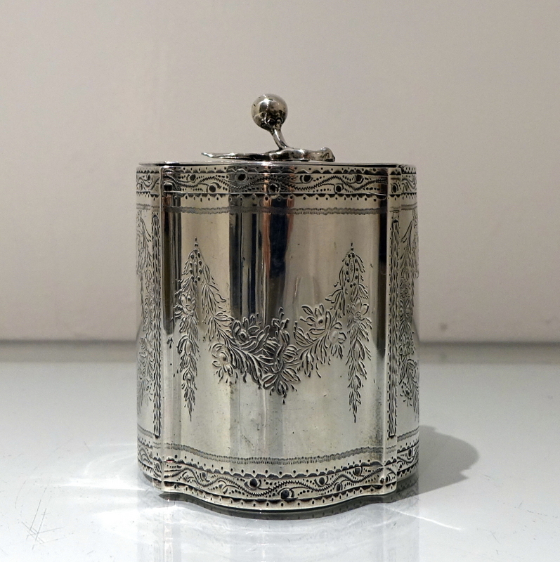 A stylish Victorian shaped oval bright cut engraved tea caddy decorated with elegant double cartouches and intricate upper and lower engraved borders. Â The lid is hinged and crowned with a stylish fruit finial.