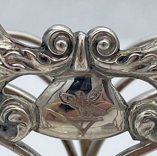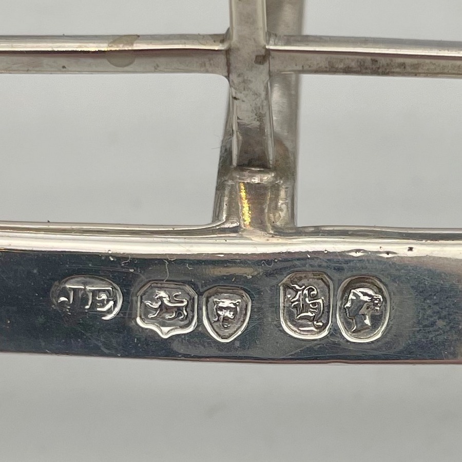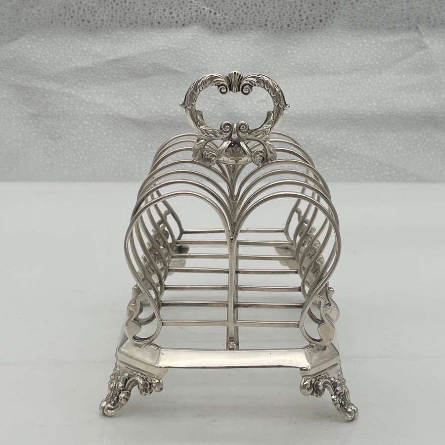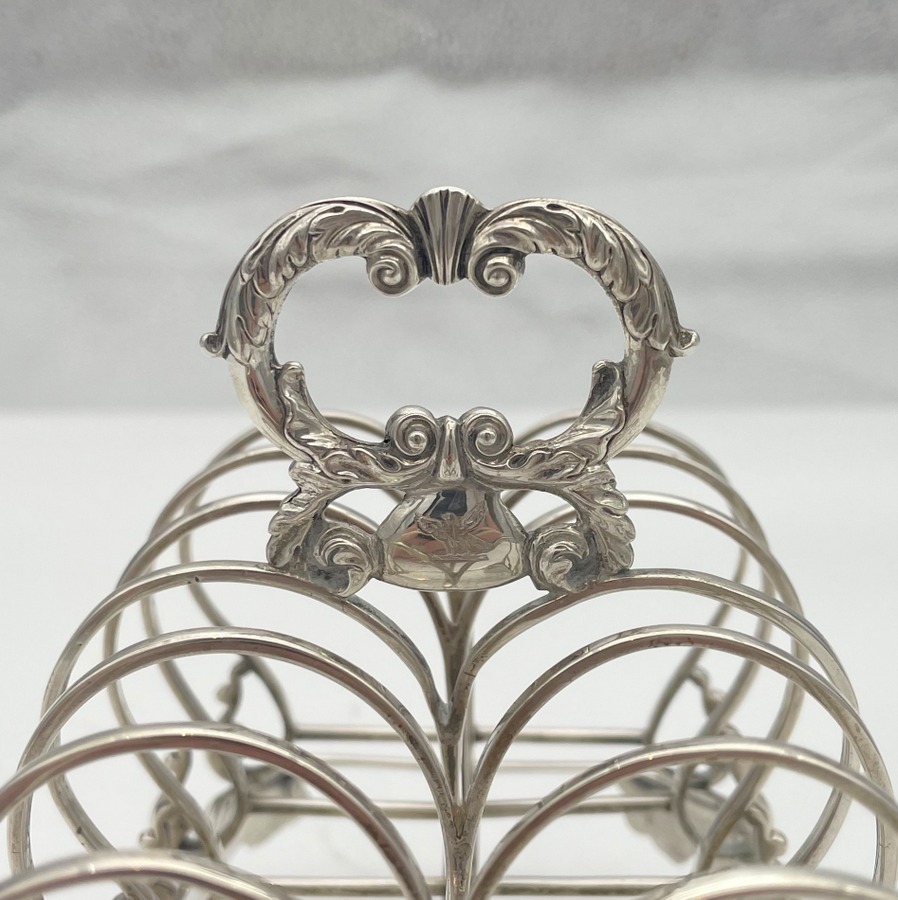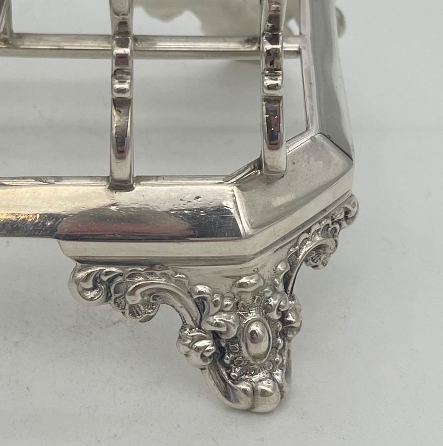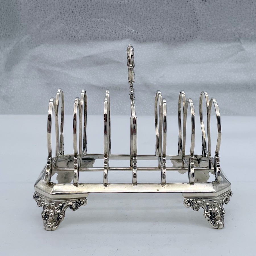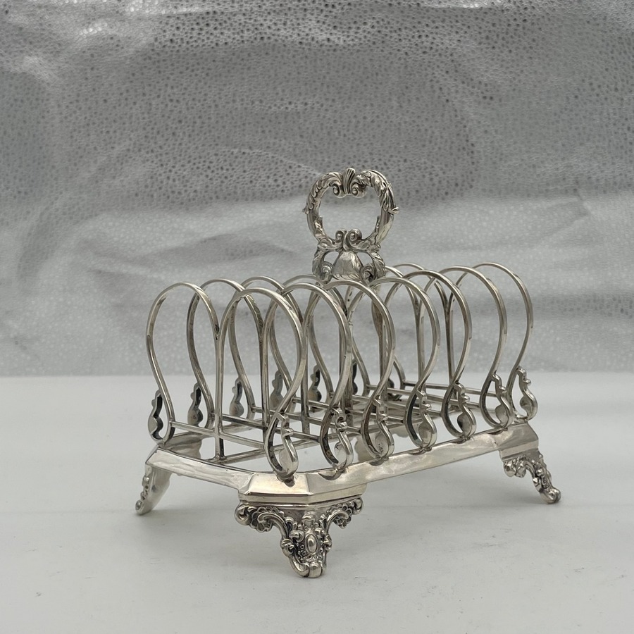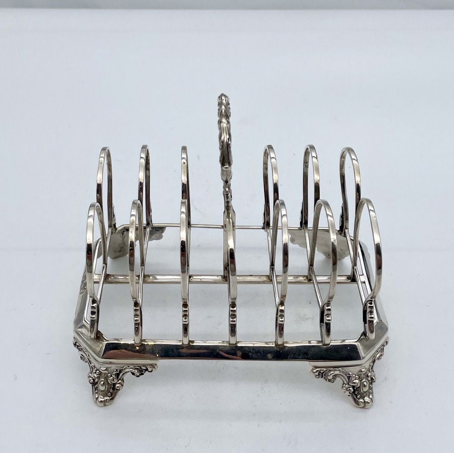 A beautiful shaped rectangular cut cornered toast rack designed with fabulous curvaceous wire bars and an elegant mounted floral wreath themed handle. Â There are four stylish ornate feet and wonderful contemporary hand engraved crests engraved below the handle for importance.