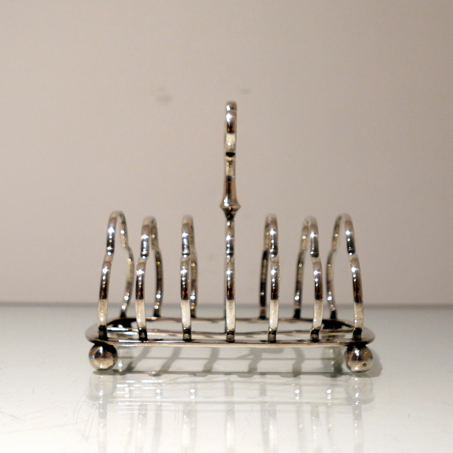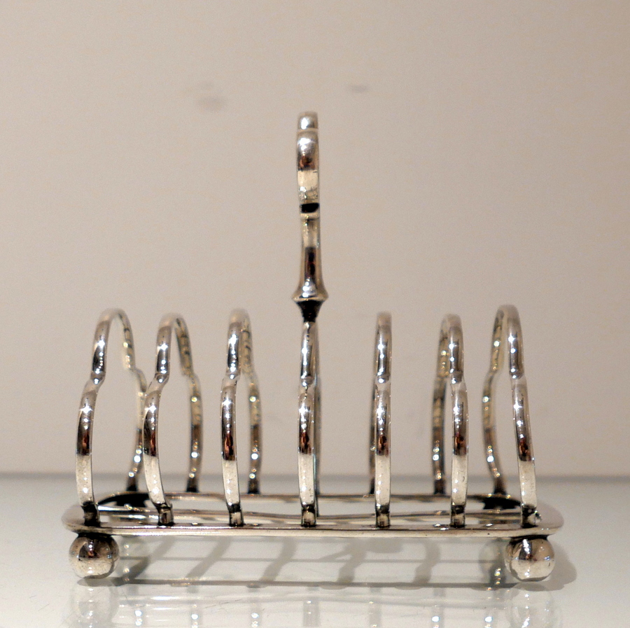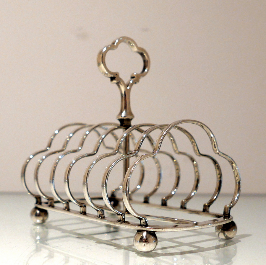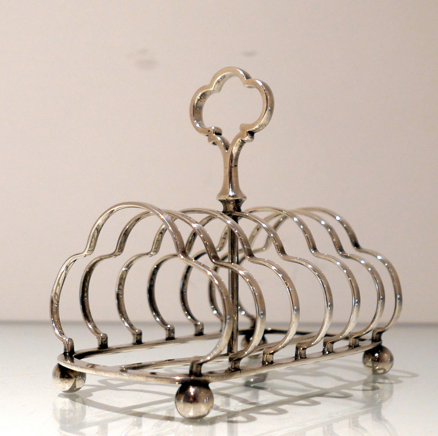 A very elegant sterling silver six place setting early Victorian toast rack made by the highly renowned silversmith Robert Garrard. Â The oblong shaped wire work frame and scroll style central bars create a delightful and highly usable object.
