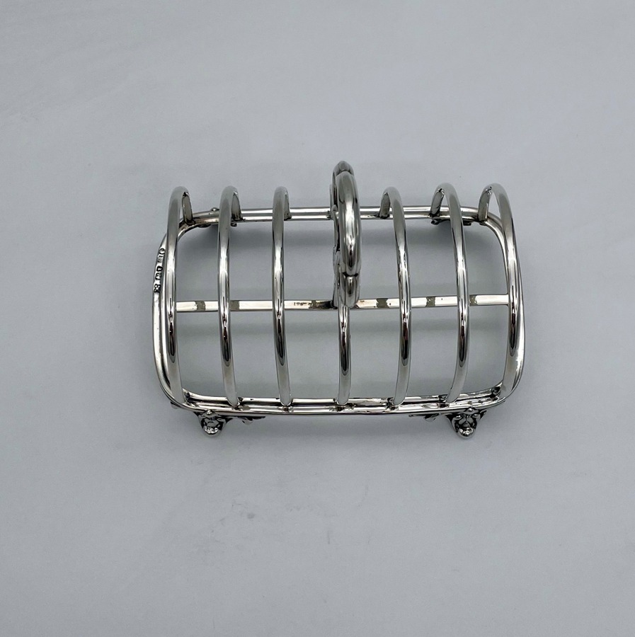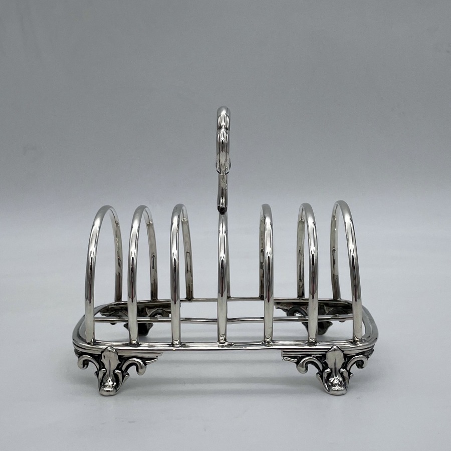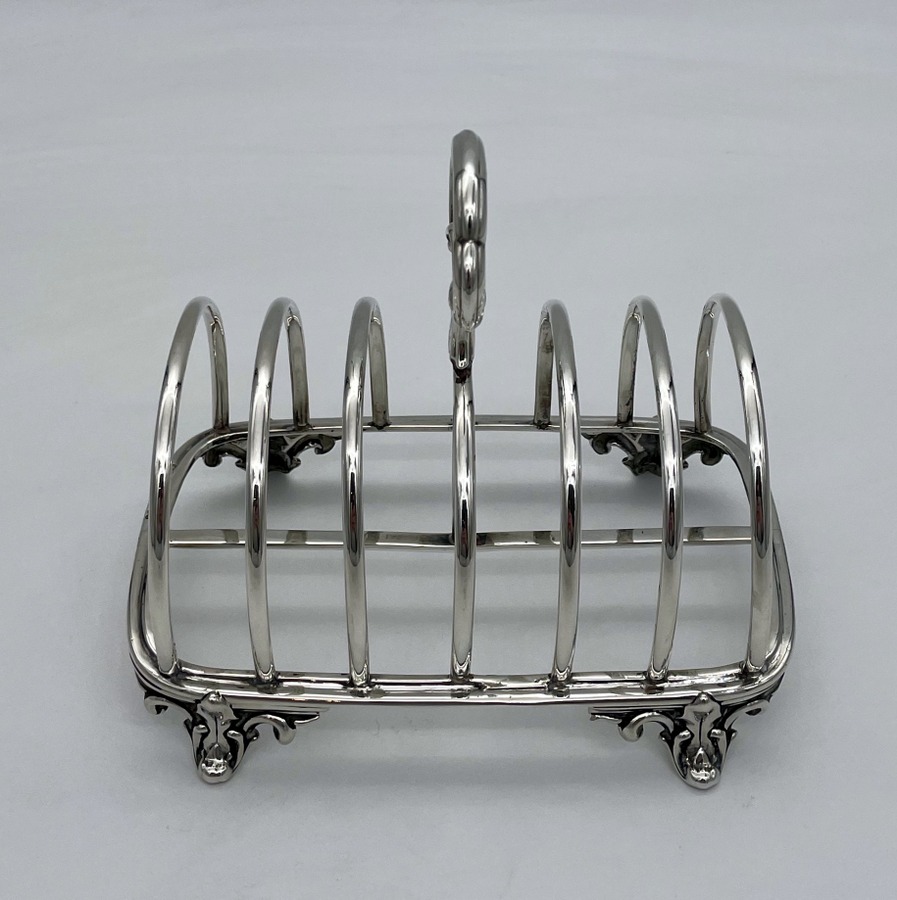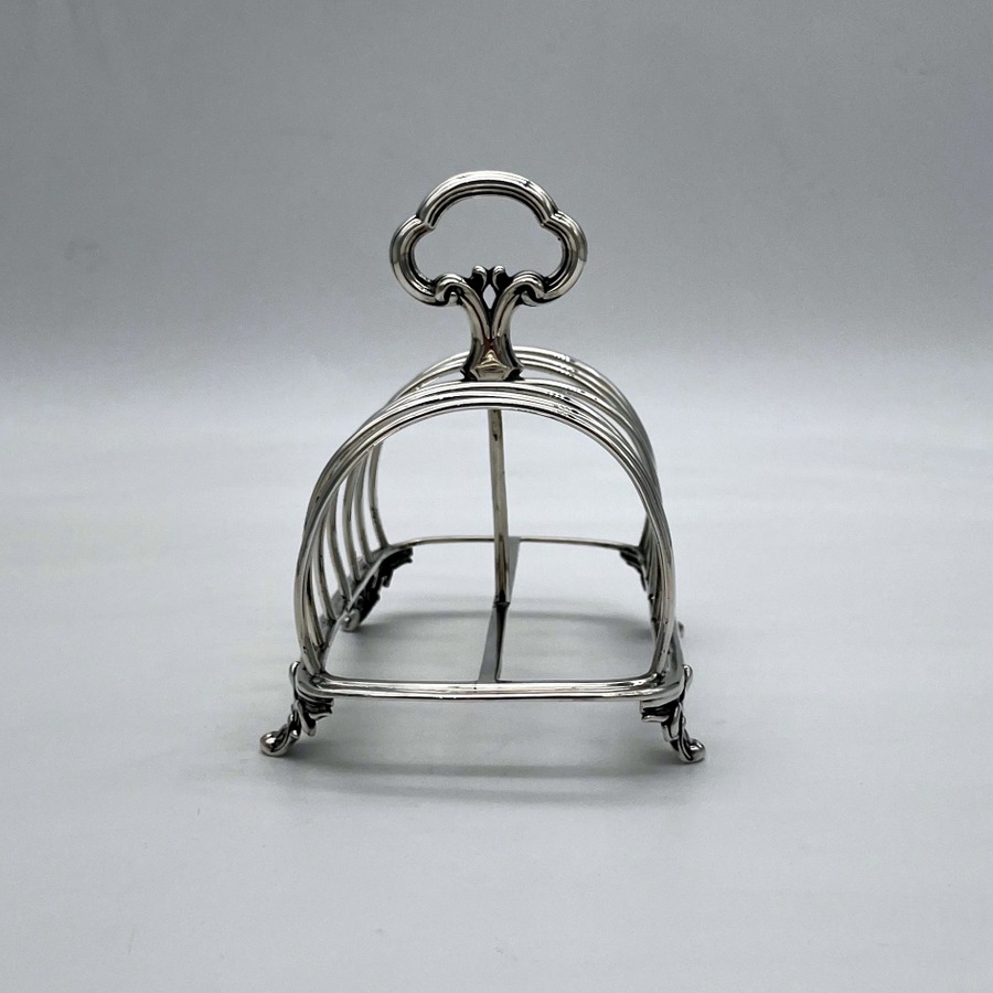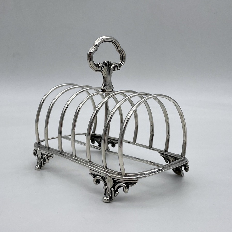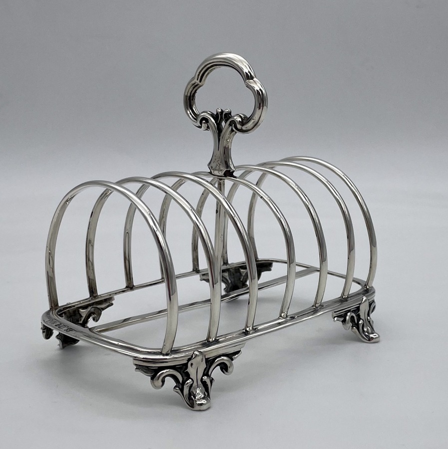 Victorian silver toast rack designed with stylish arched wire place dividers and an elegant central mast mounted floating handle.