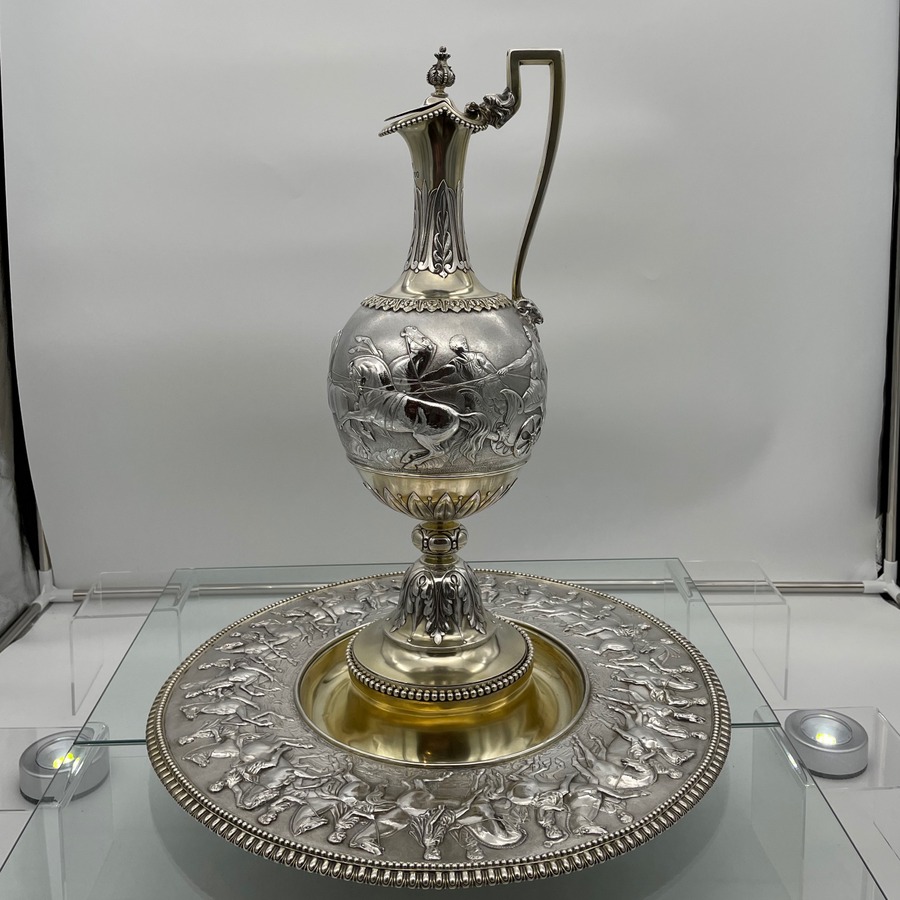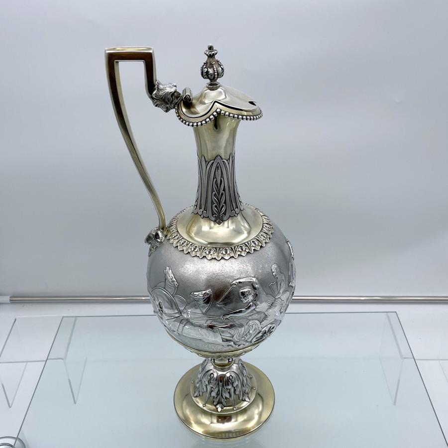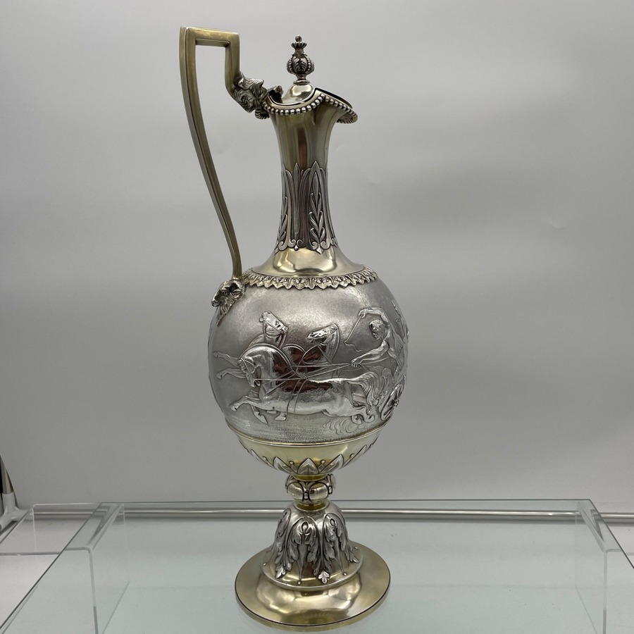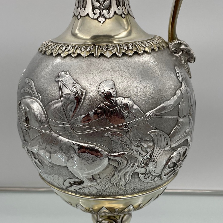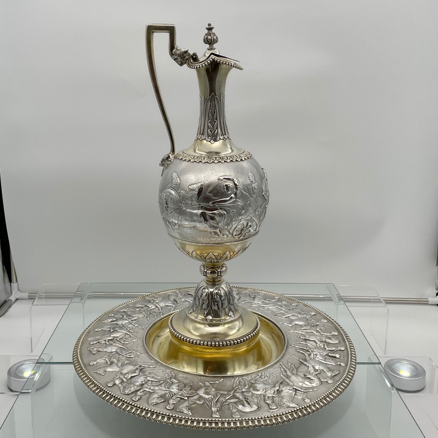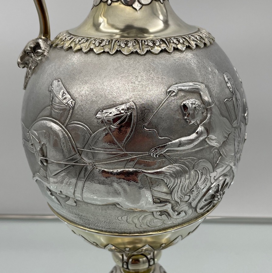A truly fabulous large Victorian partial gilt sterling silver wine ewer on stand (charger) decorated with impressive Roman themed scenes. Â The ewer has a stunning bulbous embellished bowl and stylish trefoil designed spout.
