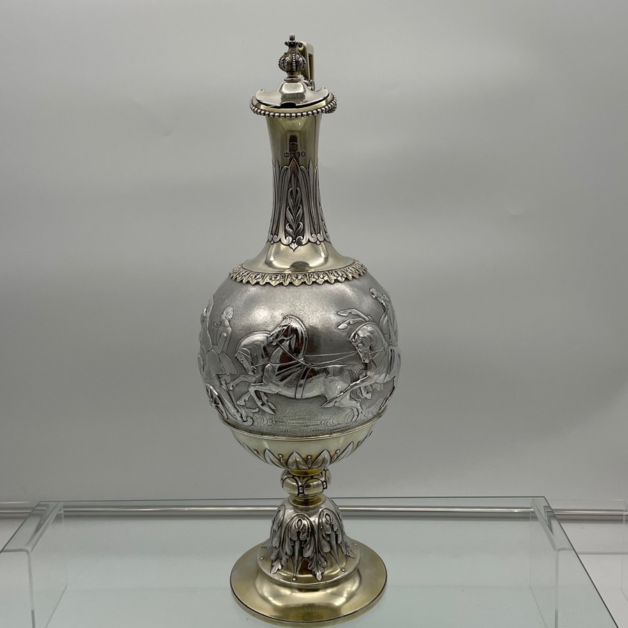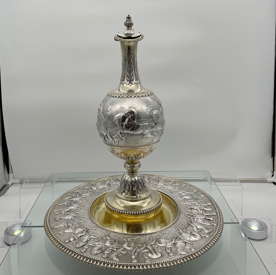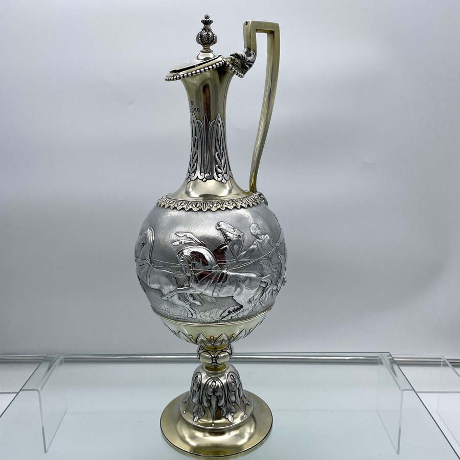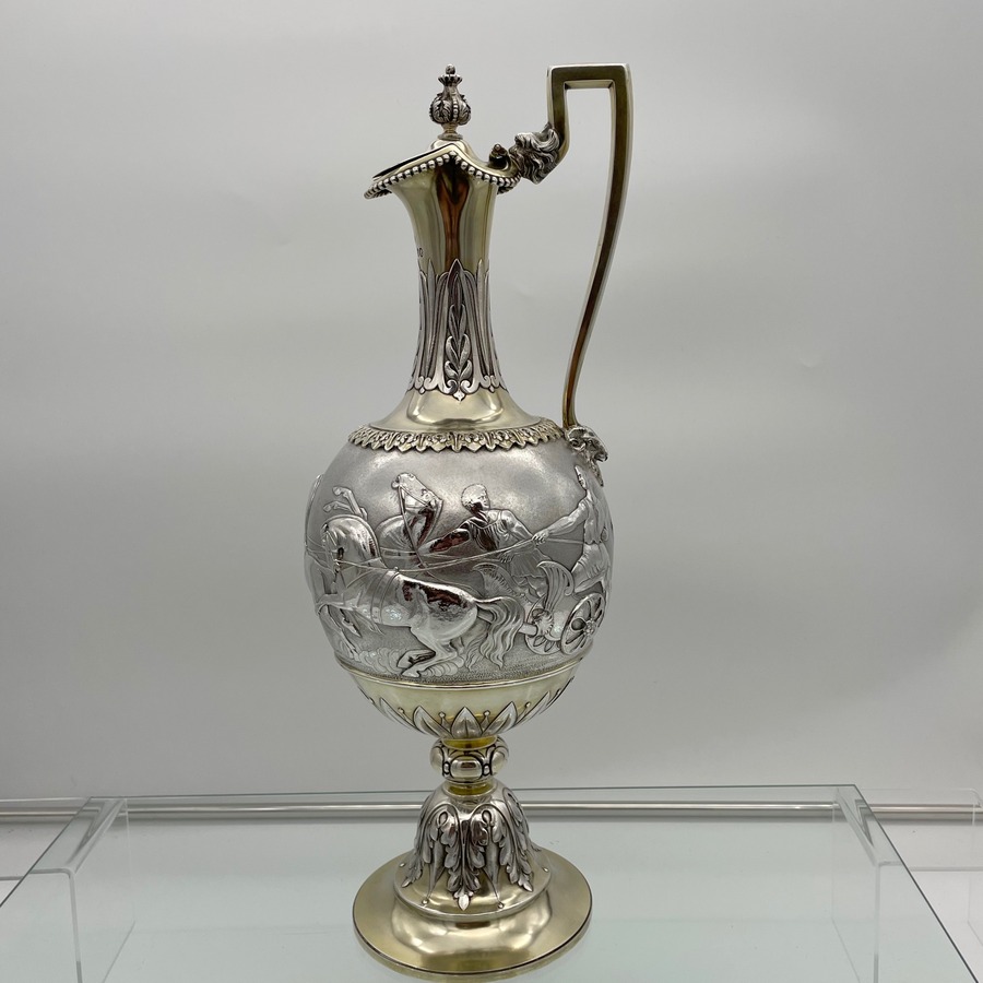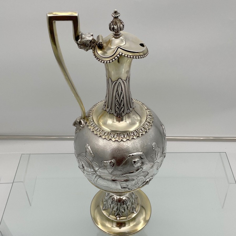 A truly fabulous large Victorian partial gilt sterling silver wine ewer on stand (charger) decorated with impressive Roman themed scenes. Â The ewer has a stunning bulbous embellished bowl and stylish trefoil designed spout.