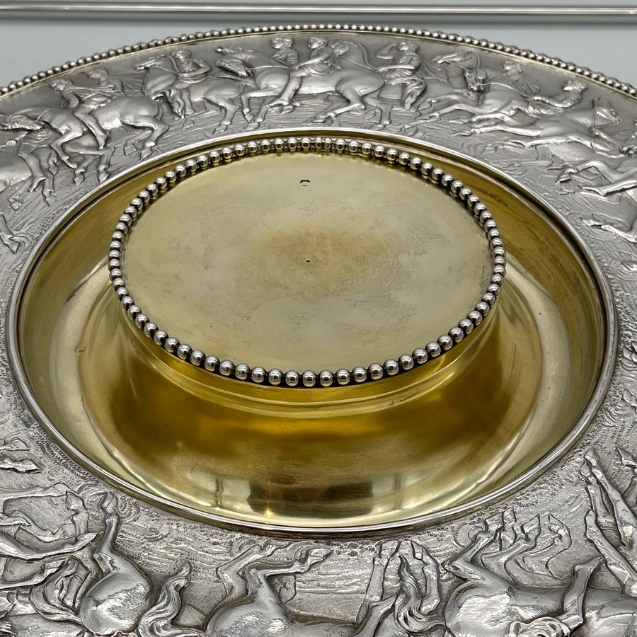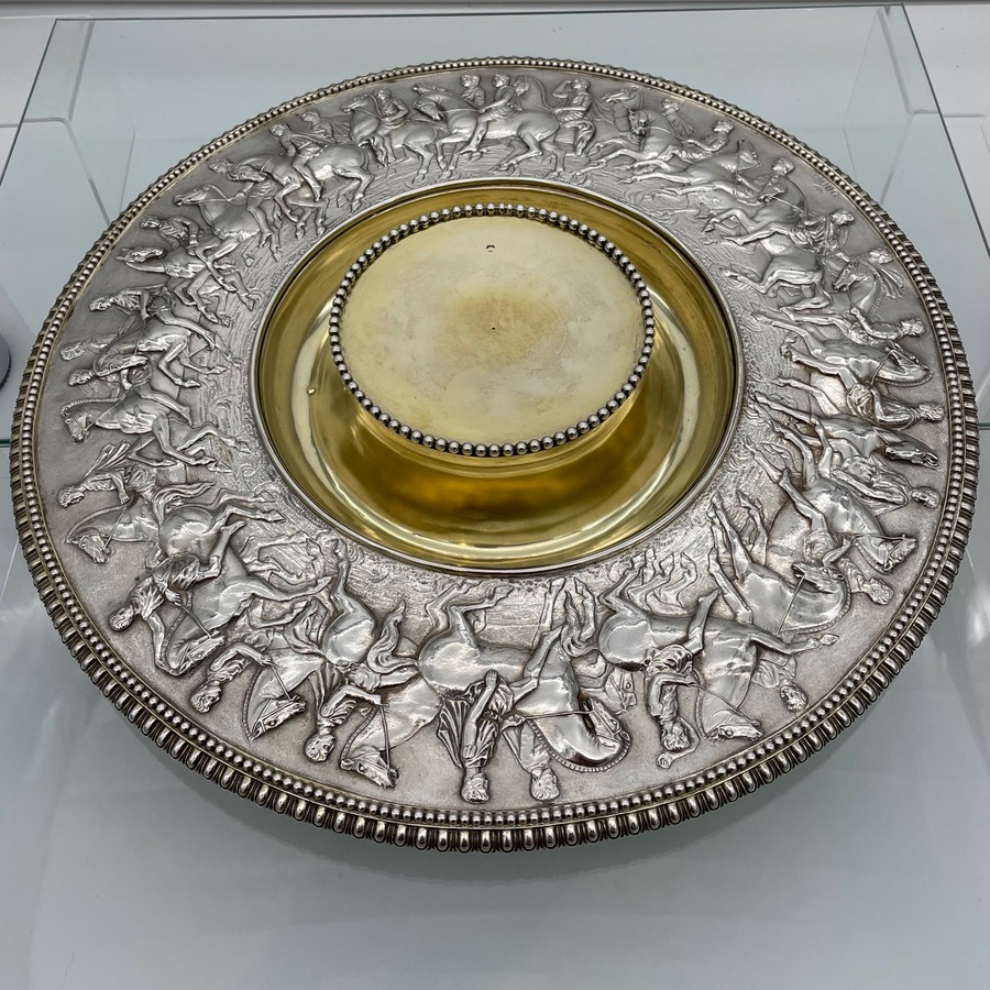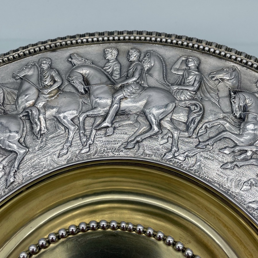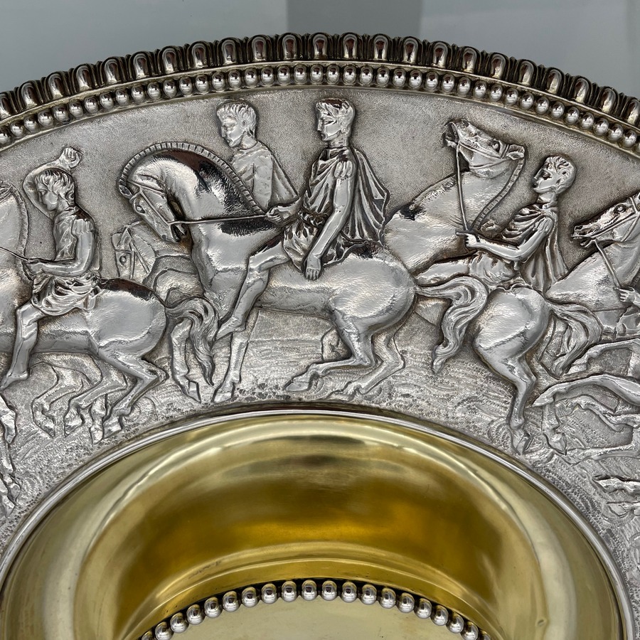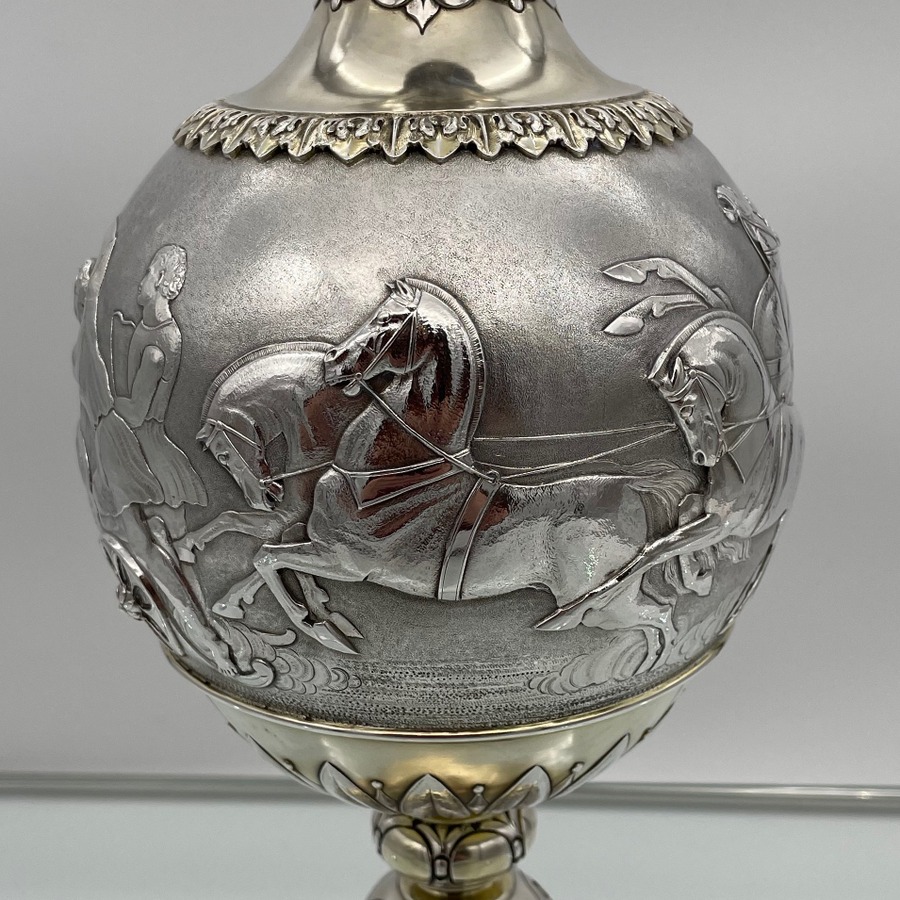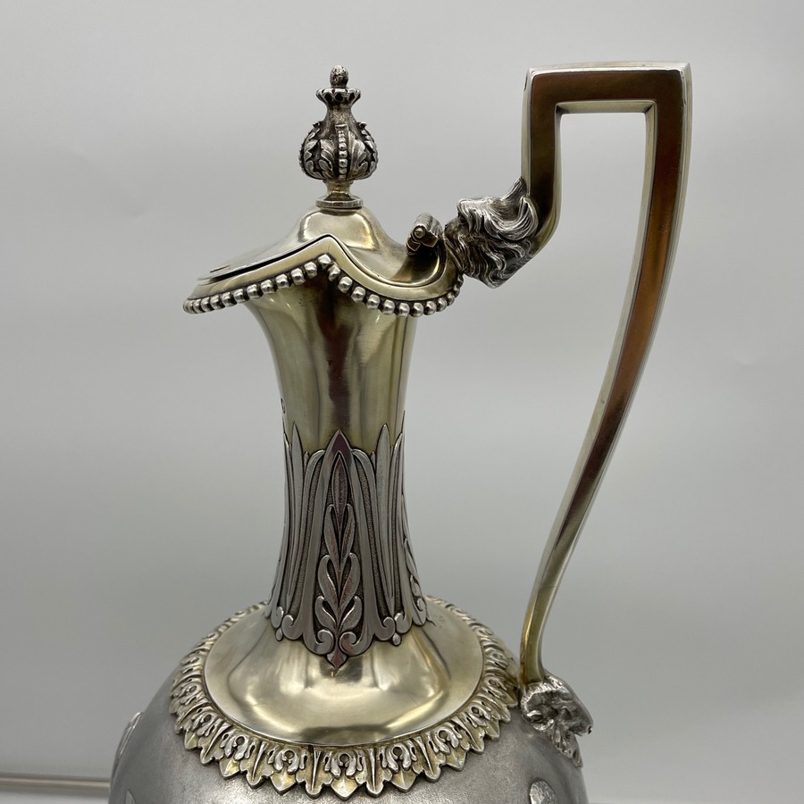 A truly fabulous large Victorian partial gilt sterling silver wine ewer on stand (charger) decorated with impressive Roman themed scenes. Â The ewer has a stunning bulbous embellished bowl and stylish trefoil designed spout.