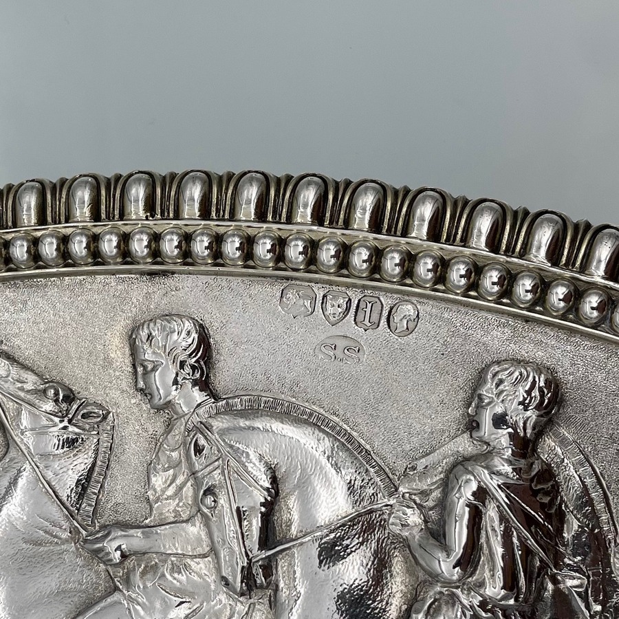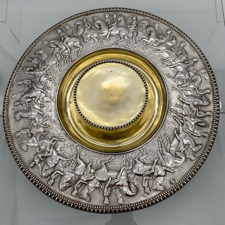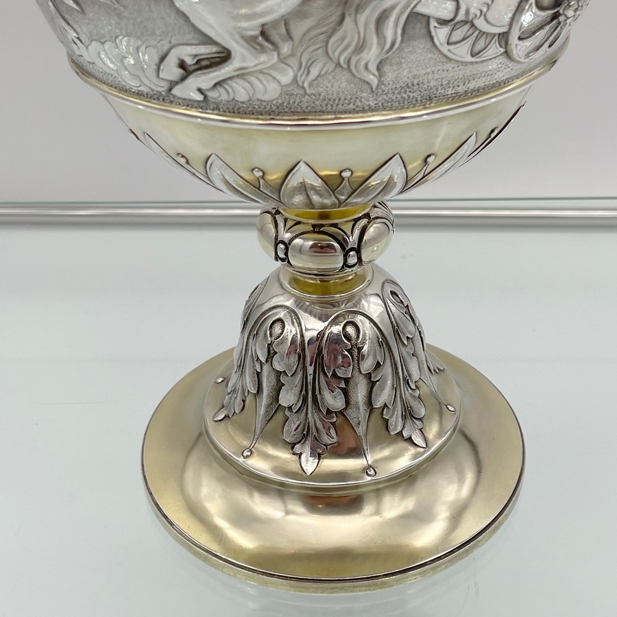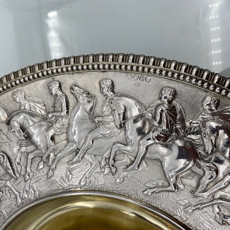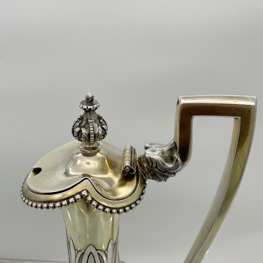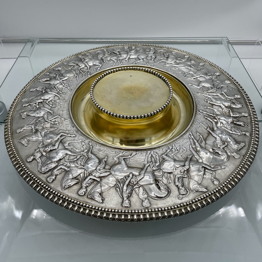 A truly fabulous large Victorian partial gilt sterling silver wine ewer on stand (charger) decorated with impressive Roman themed scenes. Â The ewer has a stunning bulbous embellished bowl and stylish trefoil designed spout.