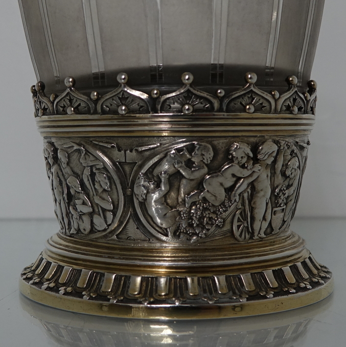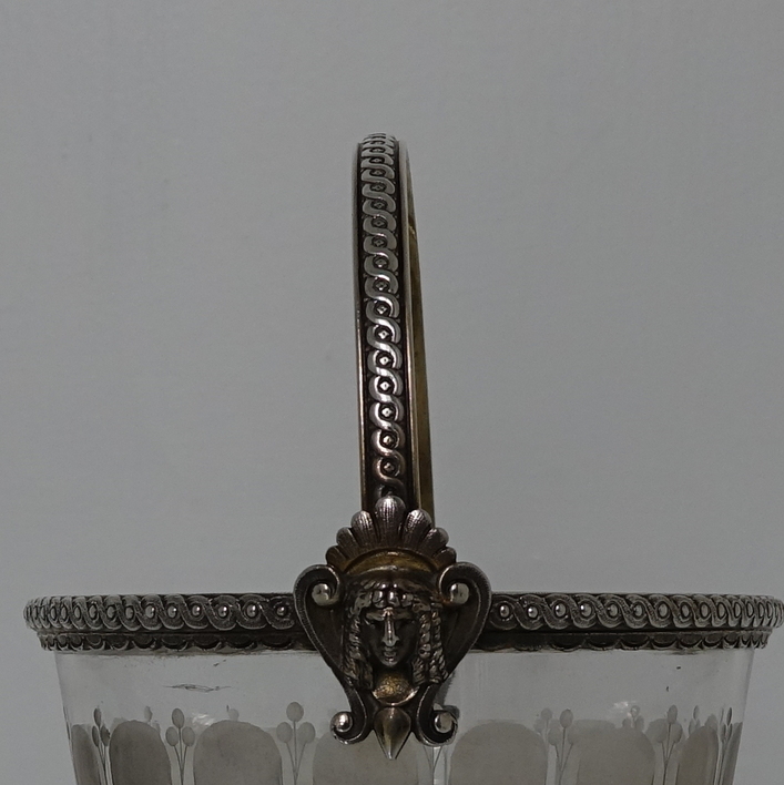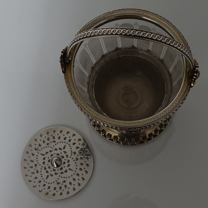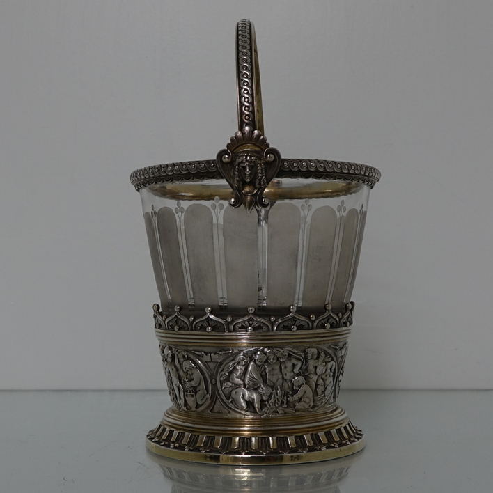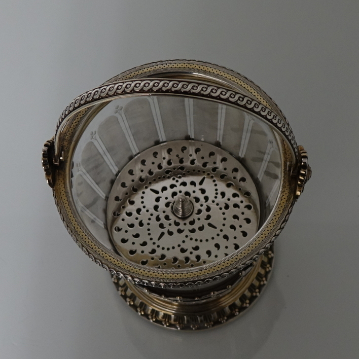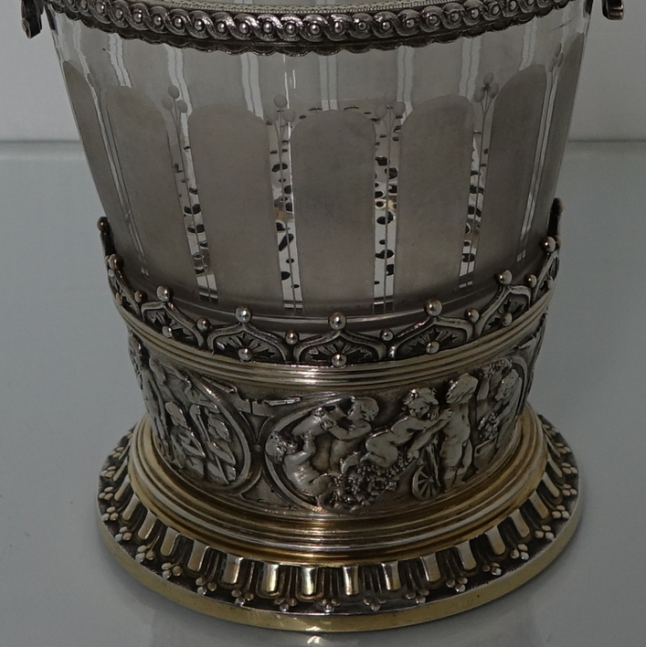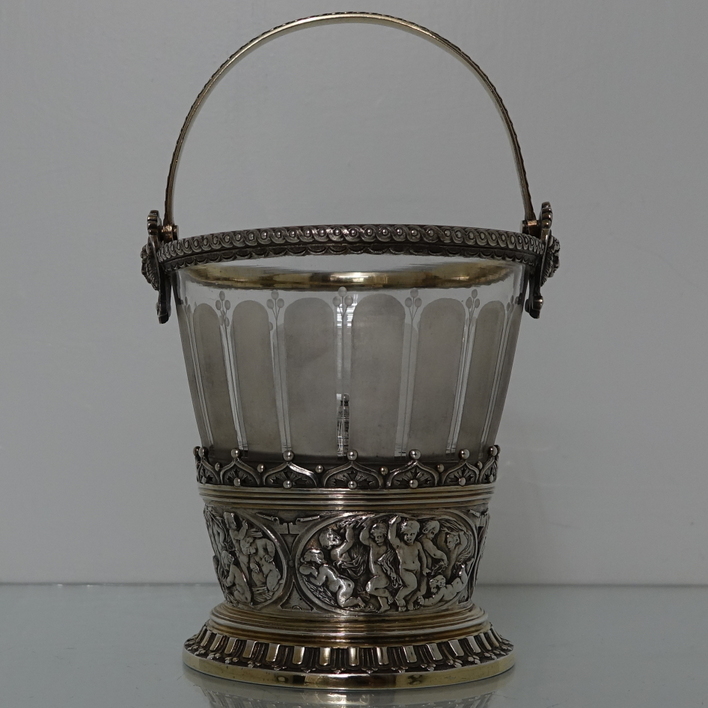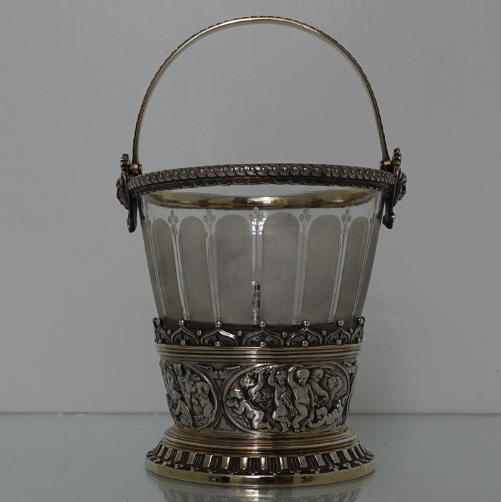A quite stunning and incredibly rare partial gilt electro formed 19th century Victorian ice bucket with a decorative frosted glass liner. Â The base of the bucket has cherubs and elegant gadroon as lowlights. The rim of the bucket is ornately decorated with two red indian motifs set either side of the hinged swing handle.