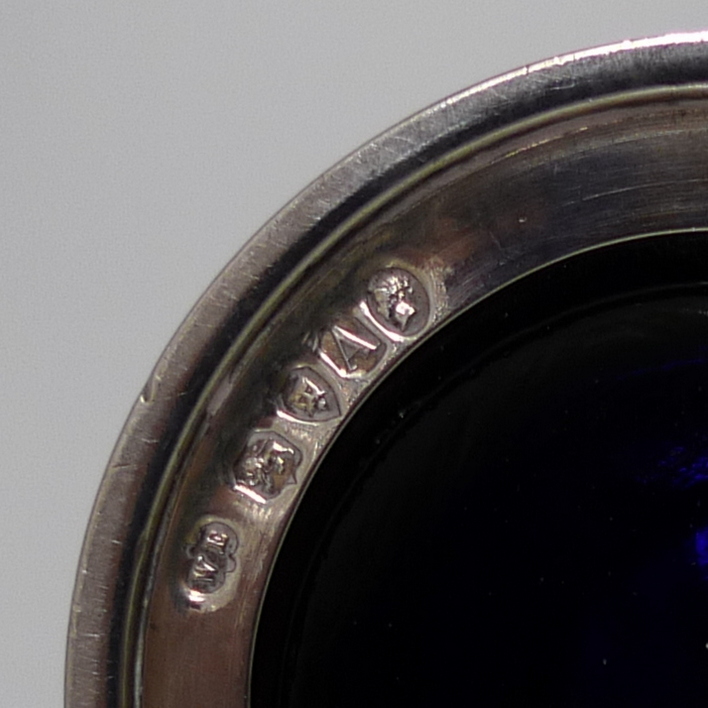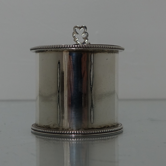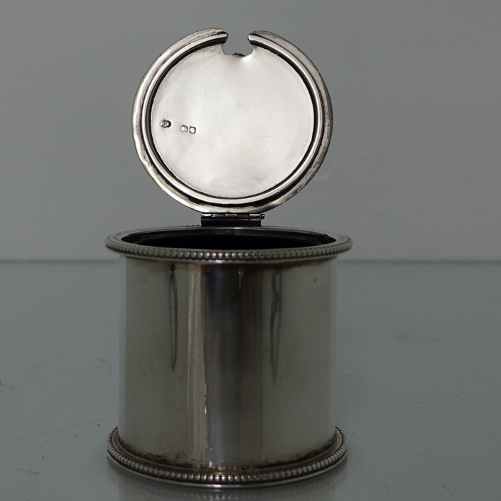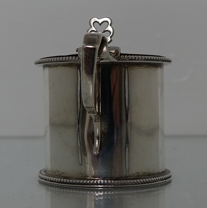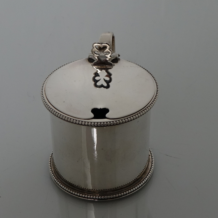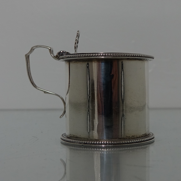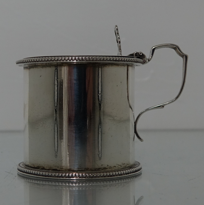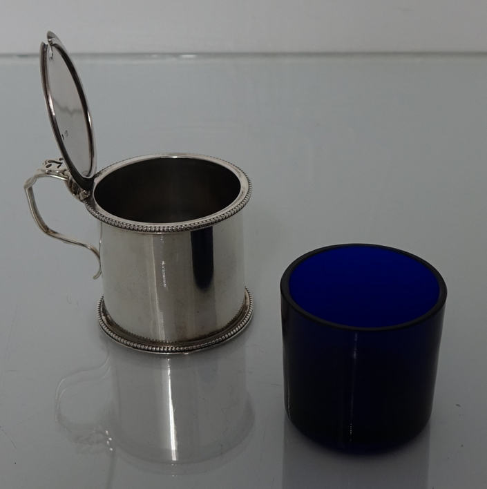 Very elegant 19th century drum mustard pot with upper and lower bead border for highlights. Â The lid of the mustard is hinged and has an ornate thumb piece. Â The handle is scroll designed and there is a detachable blue glass liner.