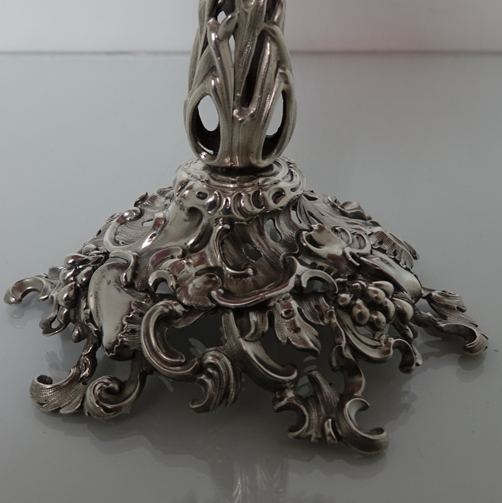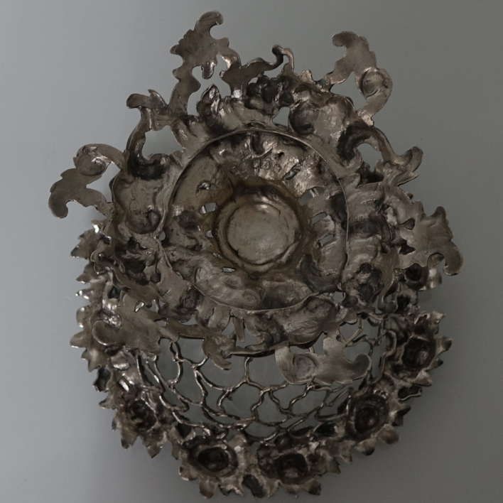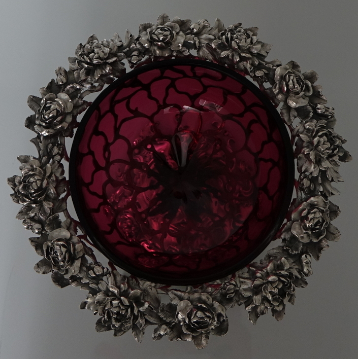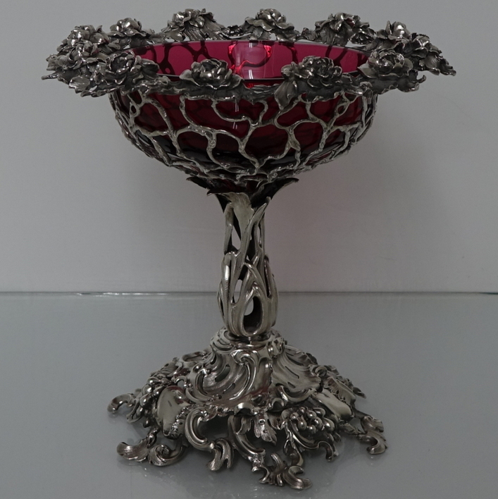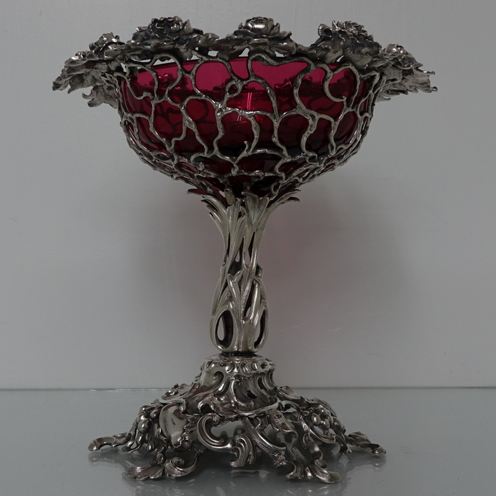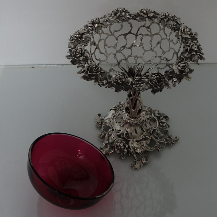 A very fine and ornately designed 19th century cast centrepiece with detachable cranberry glass liner. Â The bowl of the centrepiece is naturalistically designed with a stunning floral border. Â The foot and the stem mirrors the craftsmanship of the bowl, which overall completes a truly stunning item.