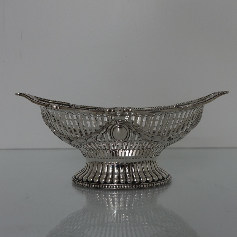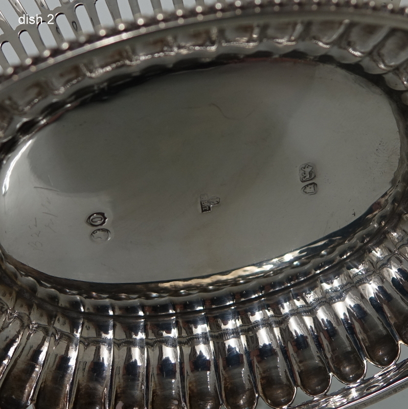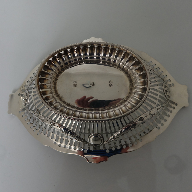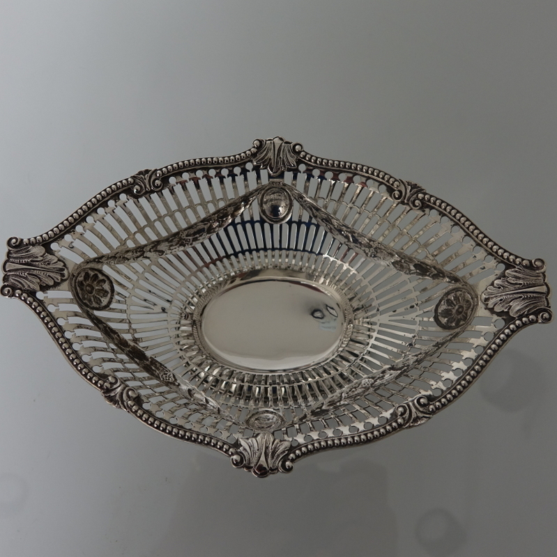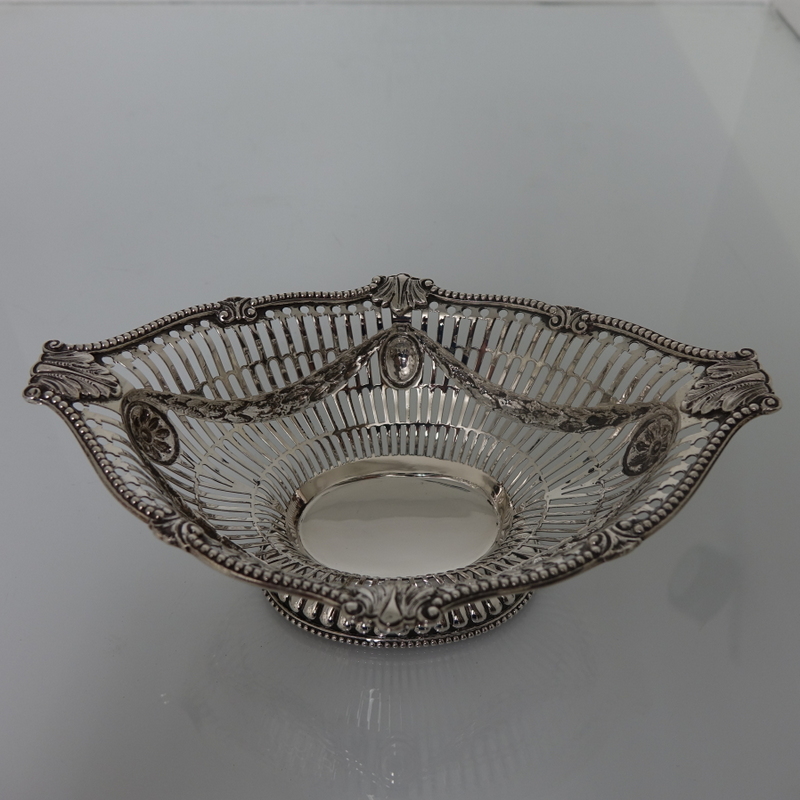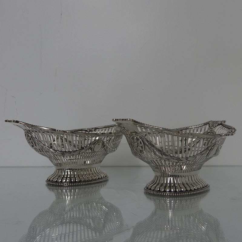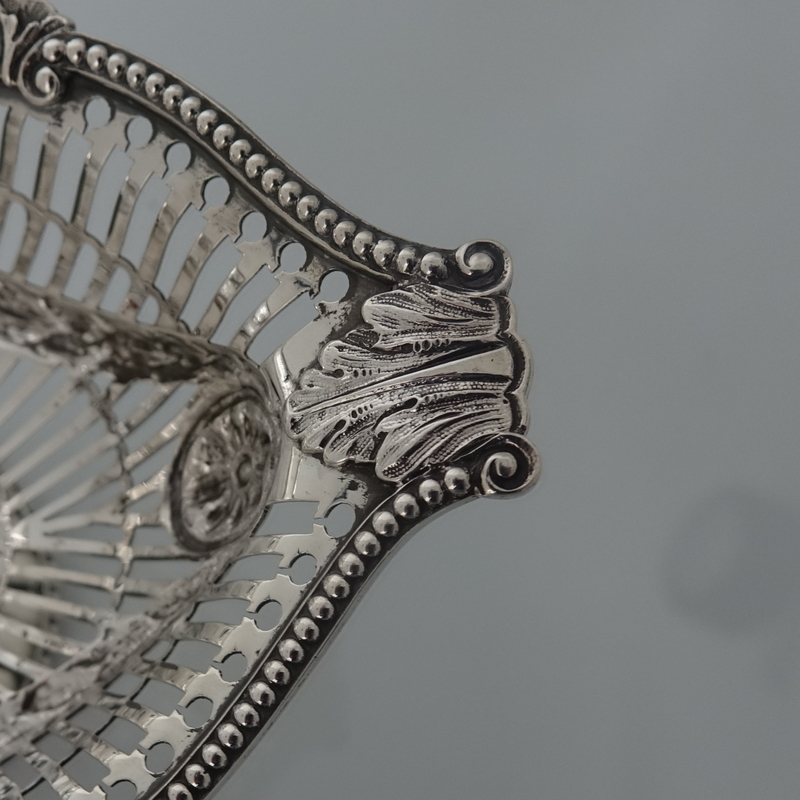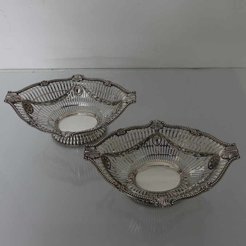 A delightful pair of 19th century pierced silver dishes with decorative acanthus leaf and bead borders. The centre of dishes has an ornate apron of foliate festoons for added decoration, which crowns a double oval cartouche. The foot of the dishes are fluted with an applied bead wire for low lights.