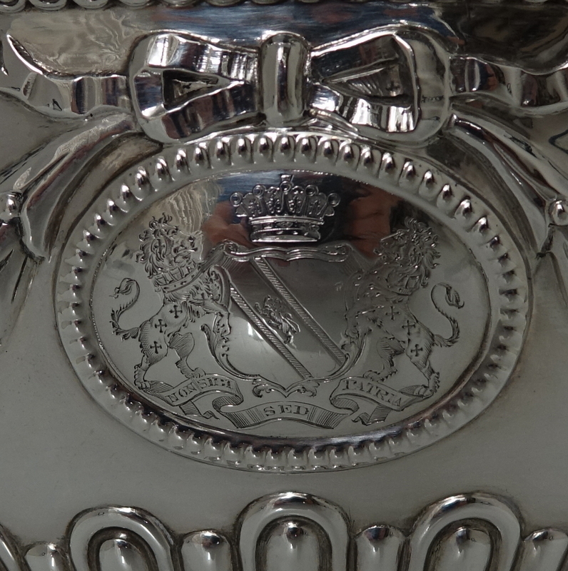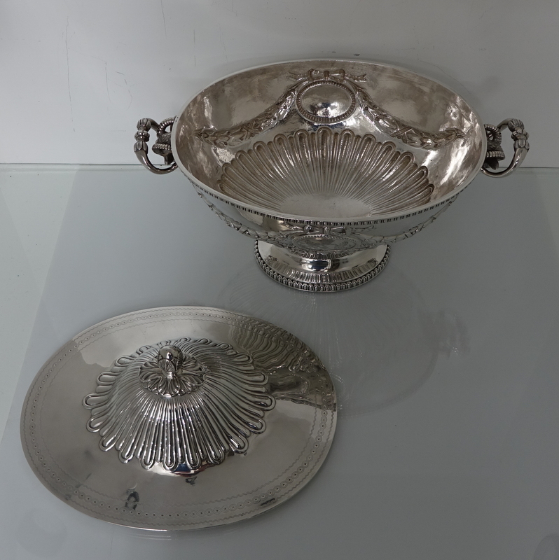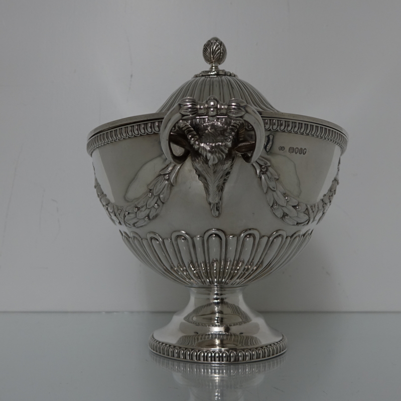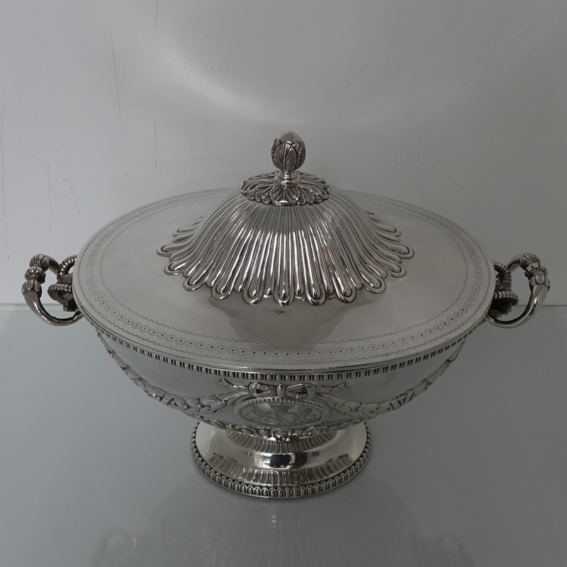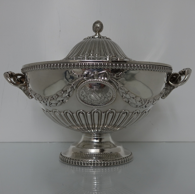 A very impressive 19th century soup tureen with an upper and lower tongue border for highlights. The body of the tureen is half fluted with an ornate apron of foliate festoons for decoration above.  The tureen has a double cartouche in which sits an elegant armorial. Above the cartouches sits a ribboned bow and the tureen itself sits on an oval raised pedestal foot. The handles of the tureen are designed as rams heads. The outer edge of the lid of the tureen has an elegant band of engraving and the lid is half fluted and is crowned with a acorn finial.