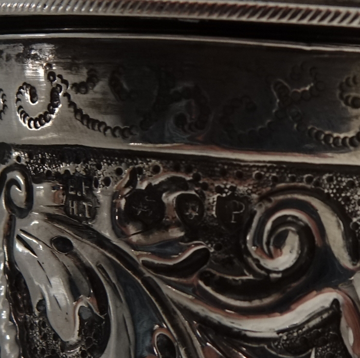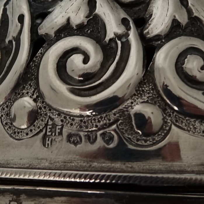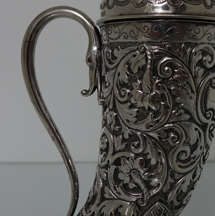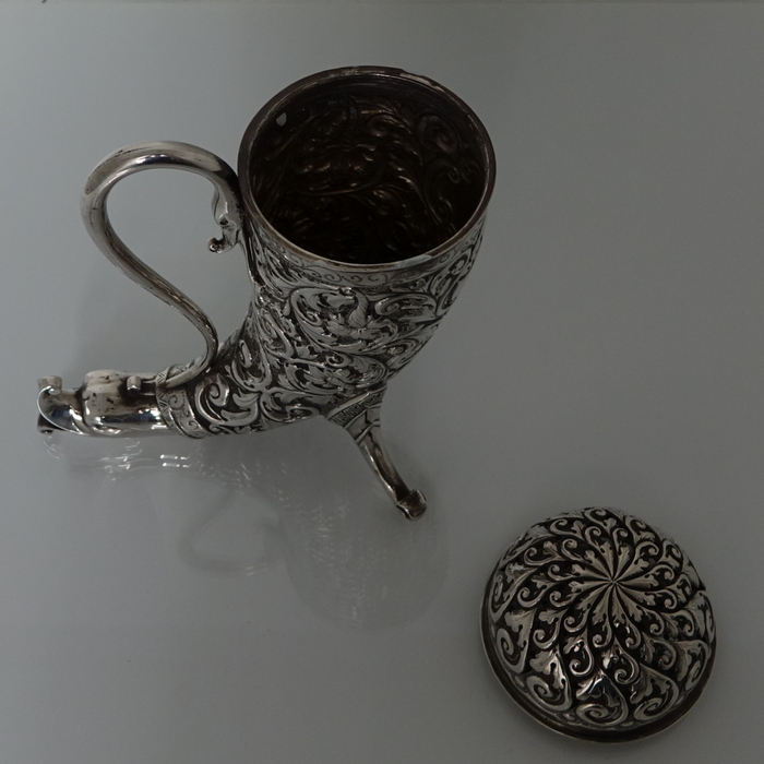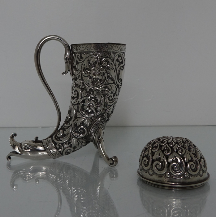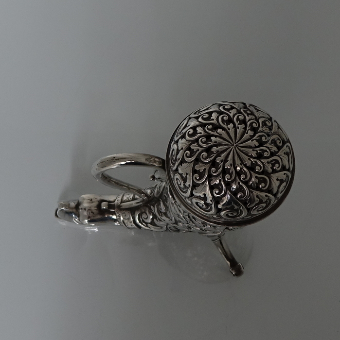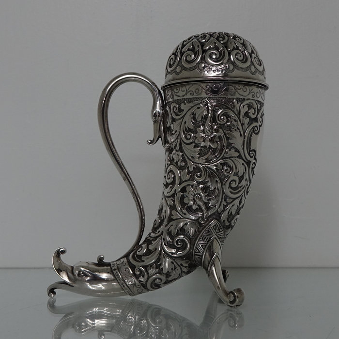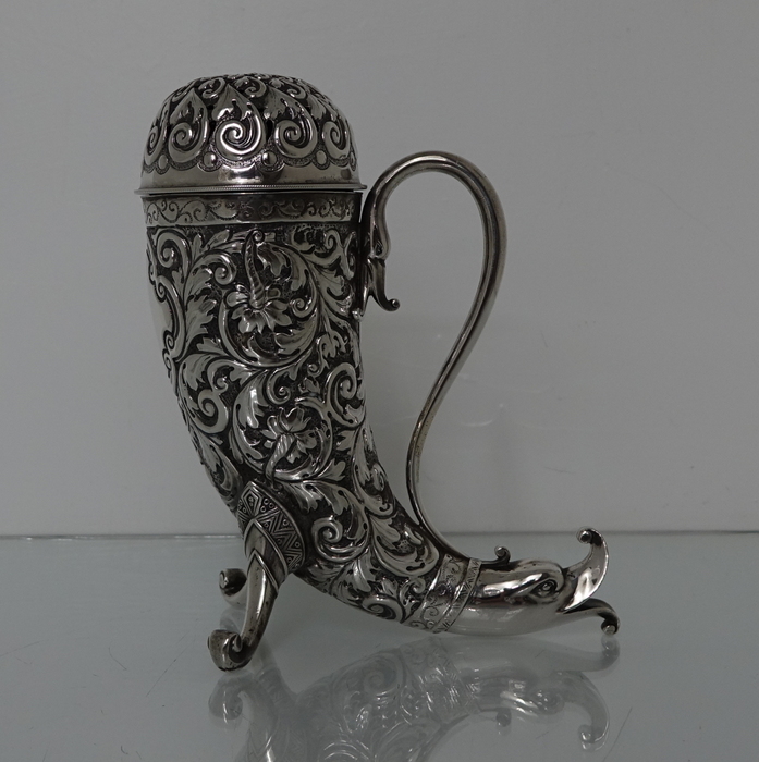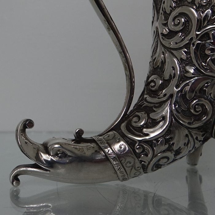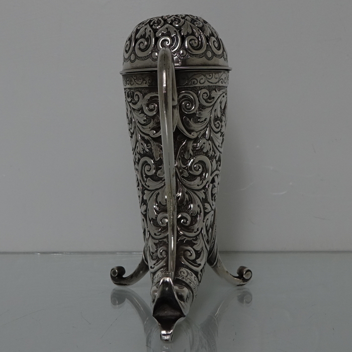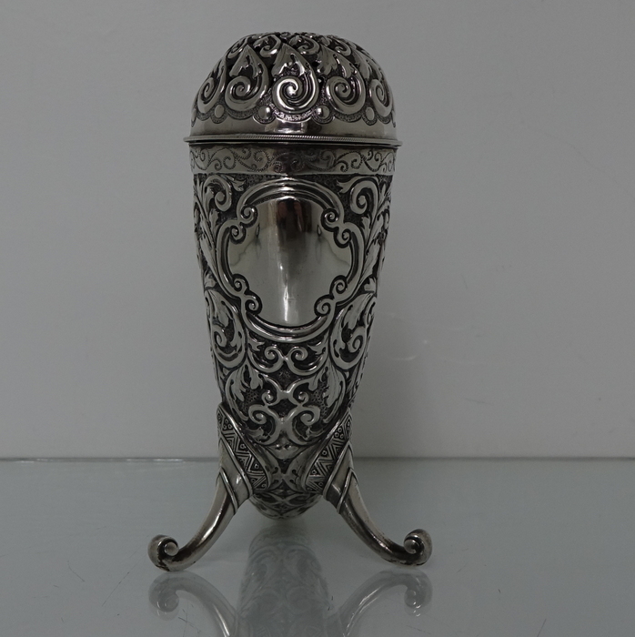 A very large sterling silver trumpet formed Victorian muffineer/sugar caster. Â The muffineer is handsomely embossed throughout and sits on two stylish peg feet. Â The lid is detachable and has a screw fit action. Â Beautiful and rare item.