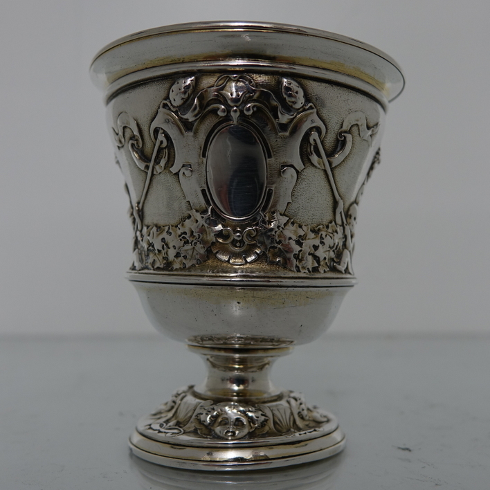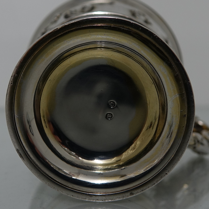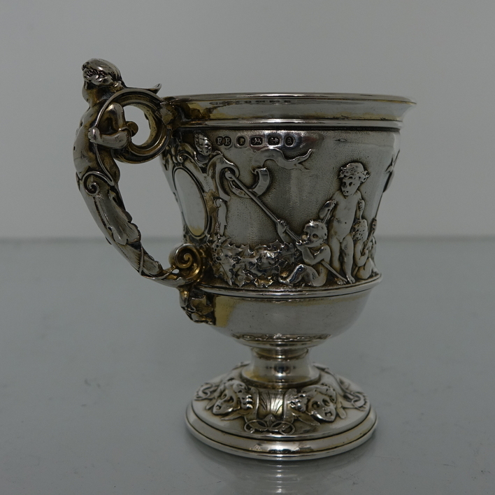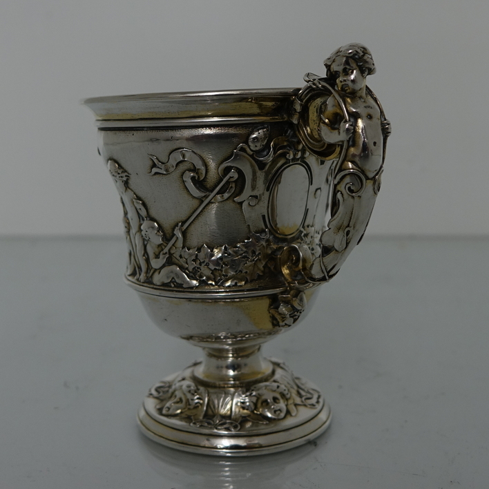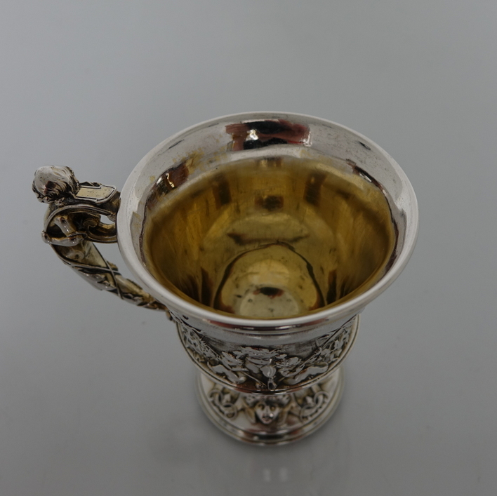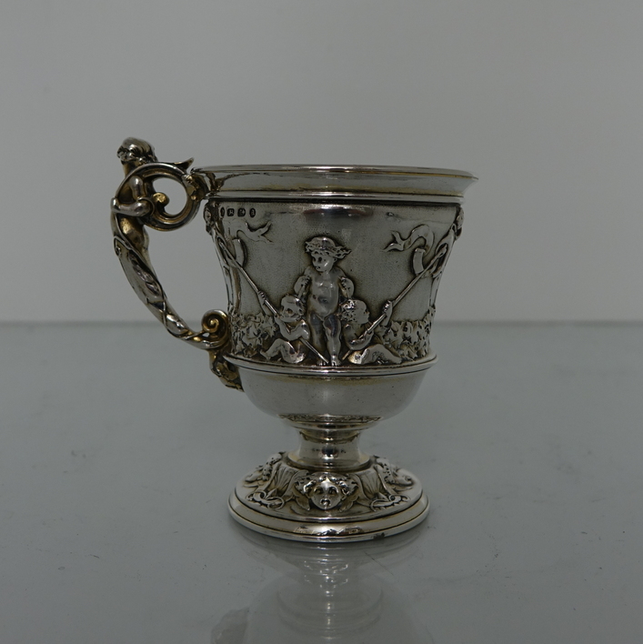 A magnificent quality christening mug decorated with a cherub theme and boasting floral craftsmanship. The inside of the bowl is silver gilt and with partial gilding echoed throughout.  The foot of the mug is a raised, pedestal style and the handle of the mug is ornately cast.