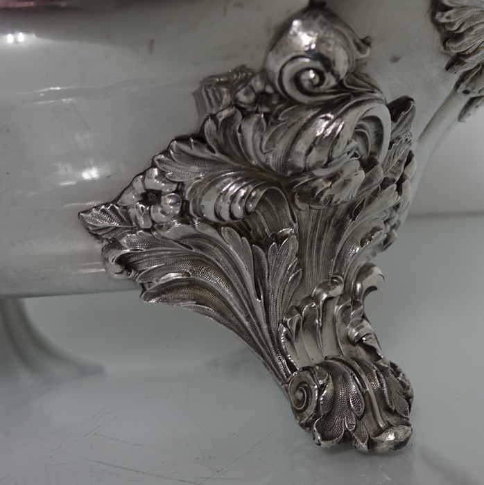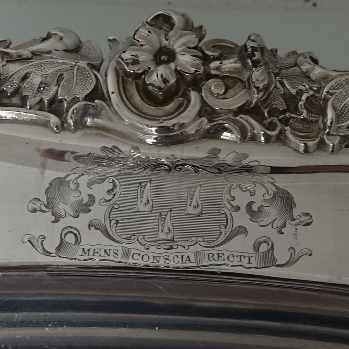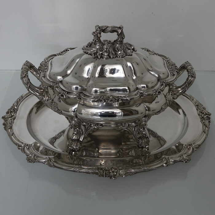 A beautiful oval shaped Old sheffield soup tureen on stand with stunning floral applied borders for decoration. Â The handles and feet are all beautiful acanthus leaf design. Â The stand has a contemporary crest and coat of arms for importance.