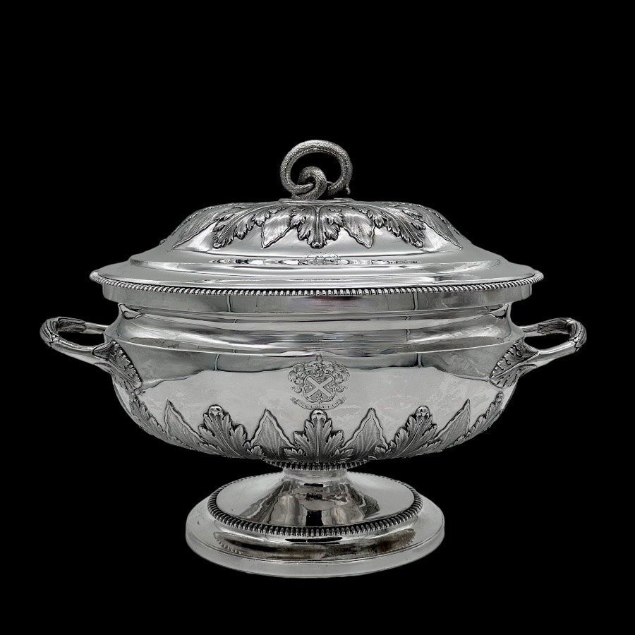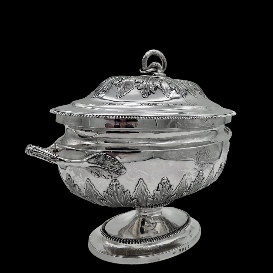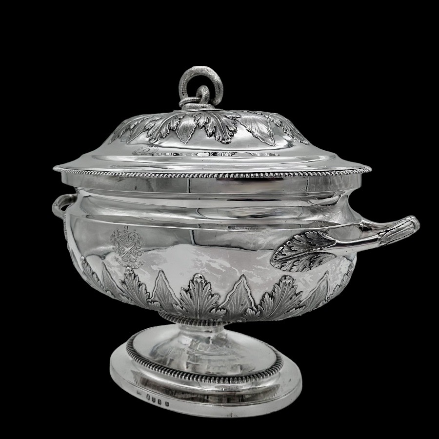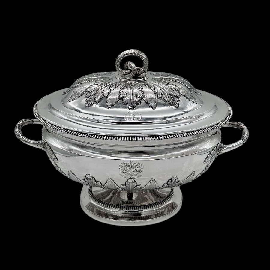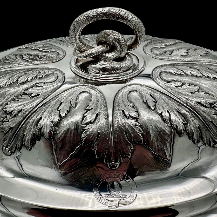 Incredibly quality large oval Scottish silver soup tureen decorated with acanthus leaf workmanship and gadroon borders for high/lowlights. The lid has additional acanthus leaf workmanship and a delightful scrolling serpent handle. There are stylish hand engraved original crest and armorials for importance.