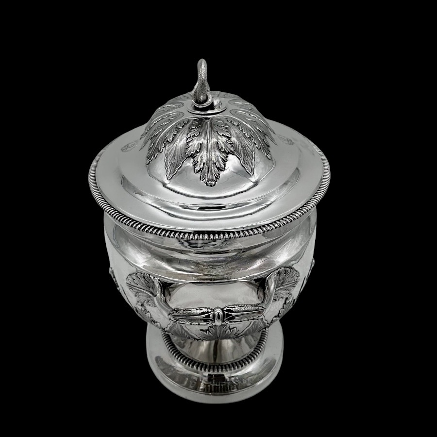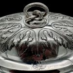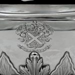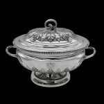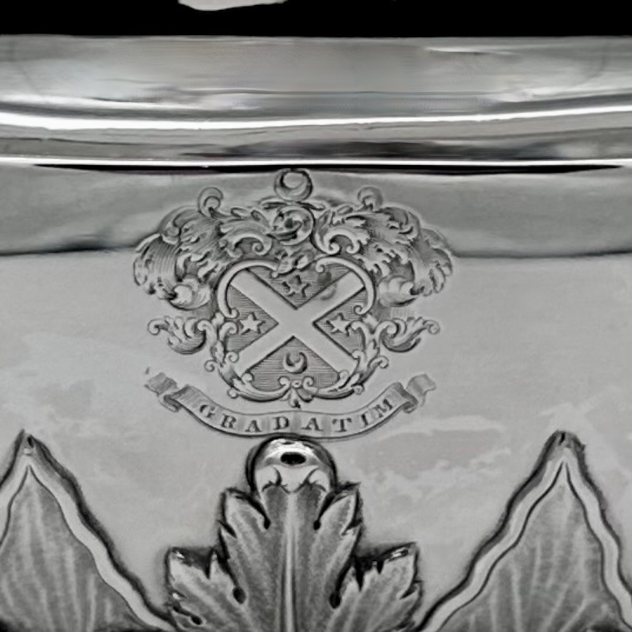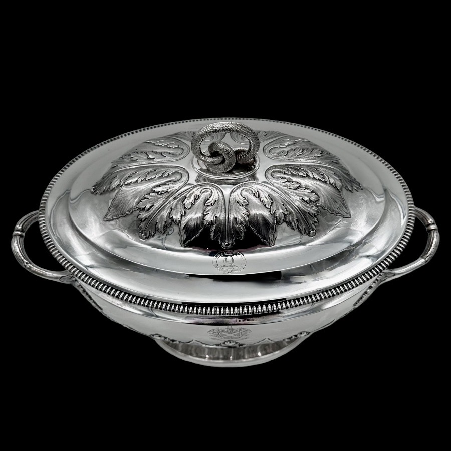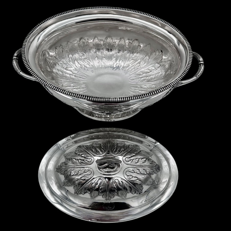 Incredibly quality large oval Scottish silver soup tureen decorated with acanthus leaf workmanship and gadroon borders for high/lowlights. The lid has additional acanthus leaf workmanship and a delightful scrolling serpent handle. There are stylish hand engraved original crest and armorials for importance.
