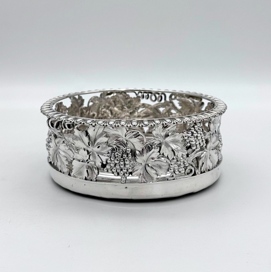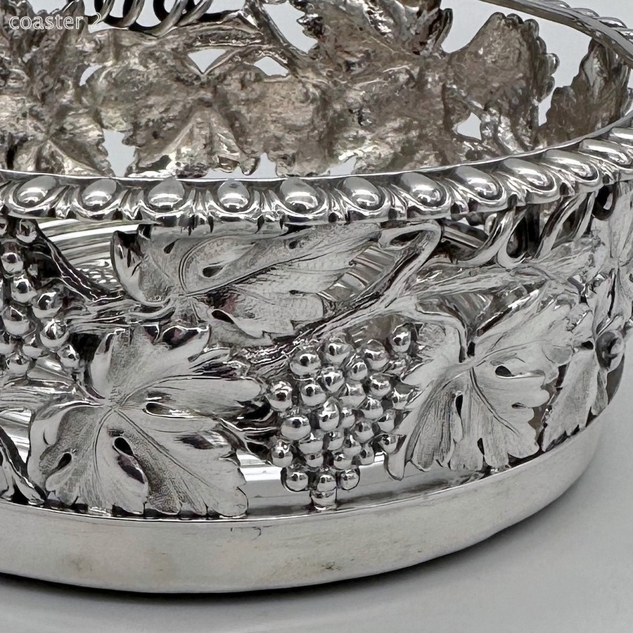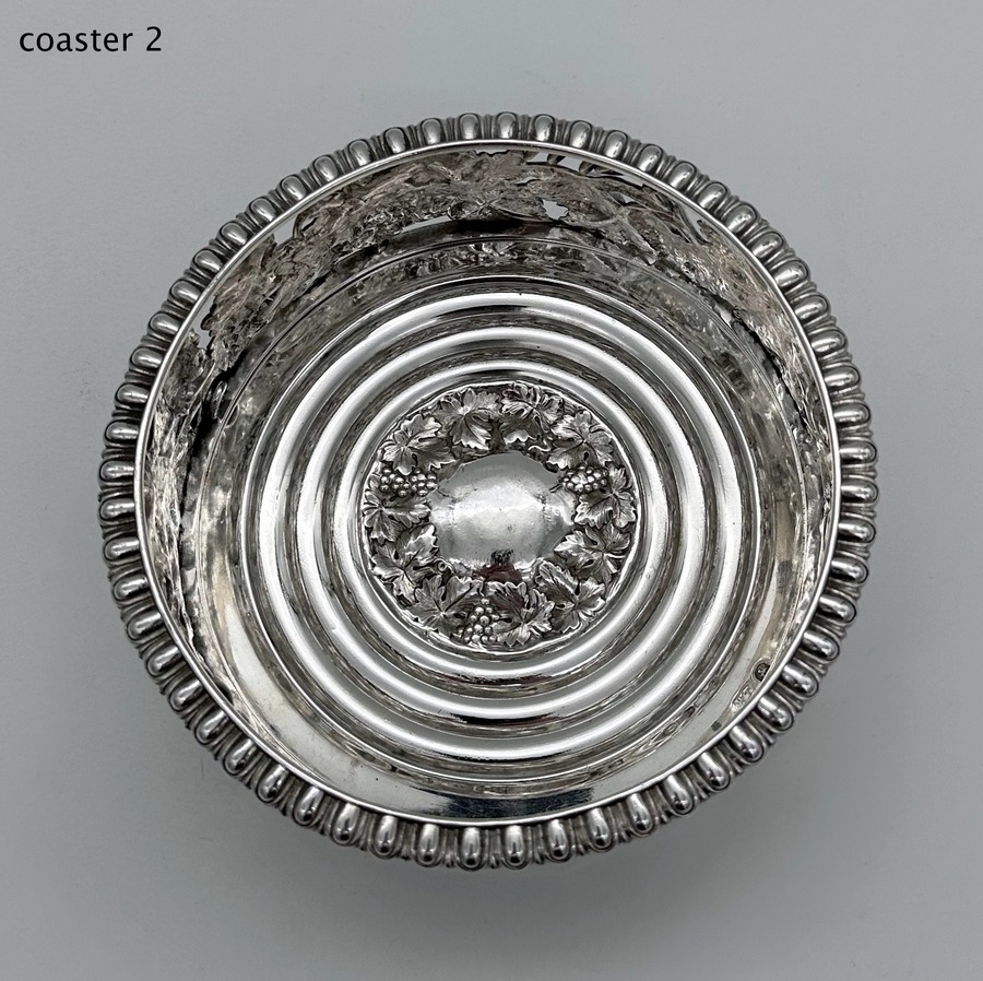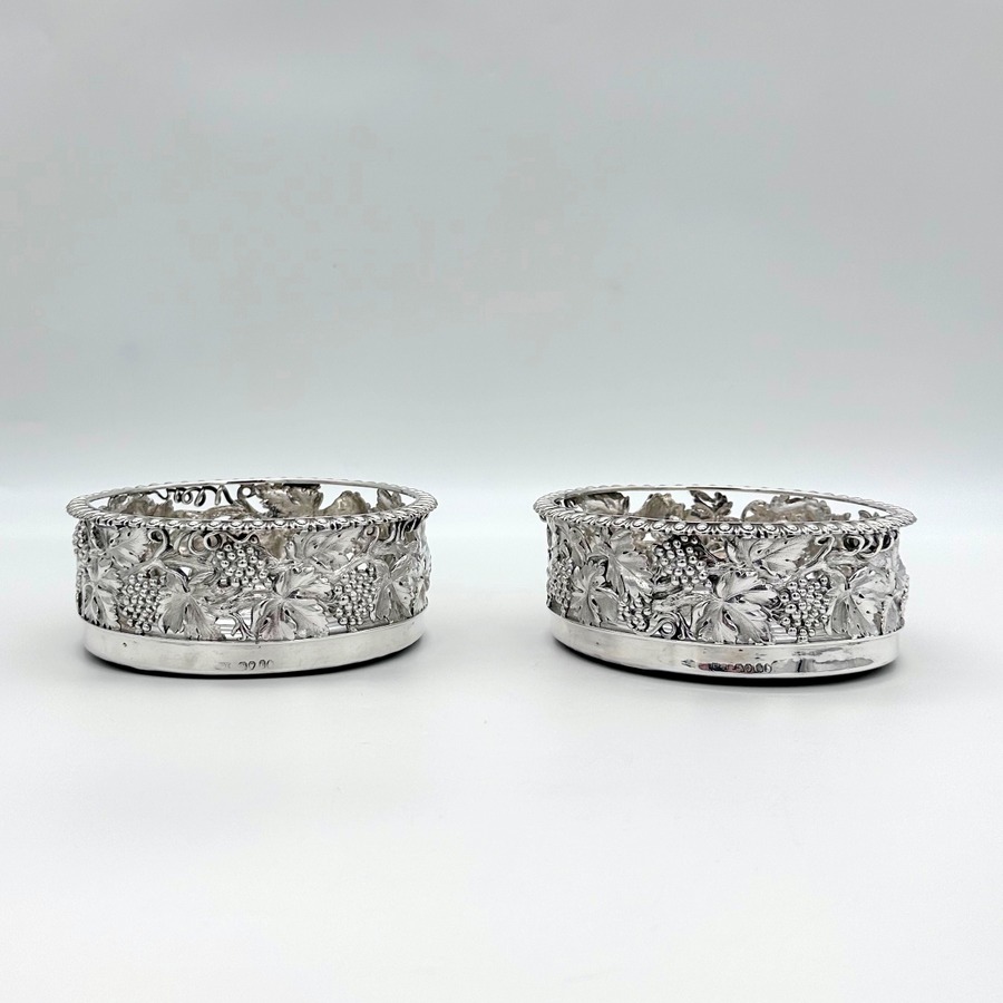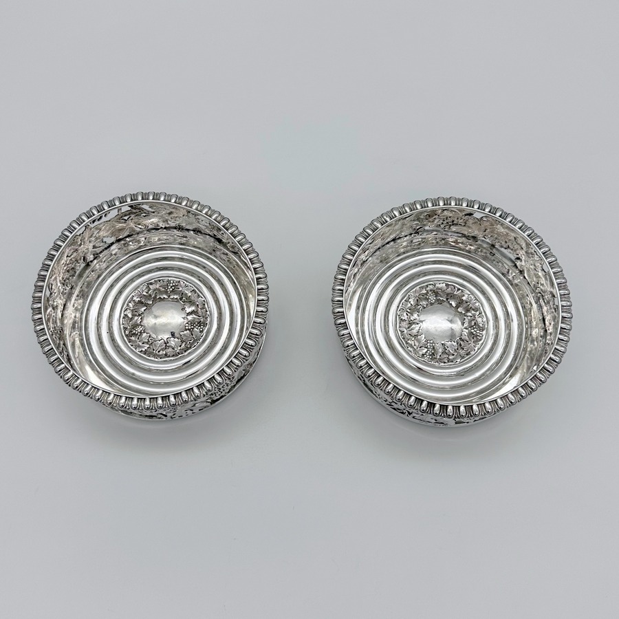 Incredibly fine pair of early 19th century cast sterling silver coasters decorated with elegant grape and vine walls and upper applied tongue borders. The inner circular wooden bases have been stylishly covered with a decorative silver sheets which has an additional grape and vine theme and beautiful outer turnings.