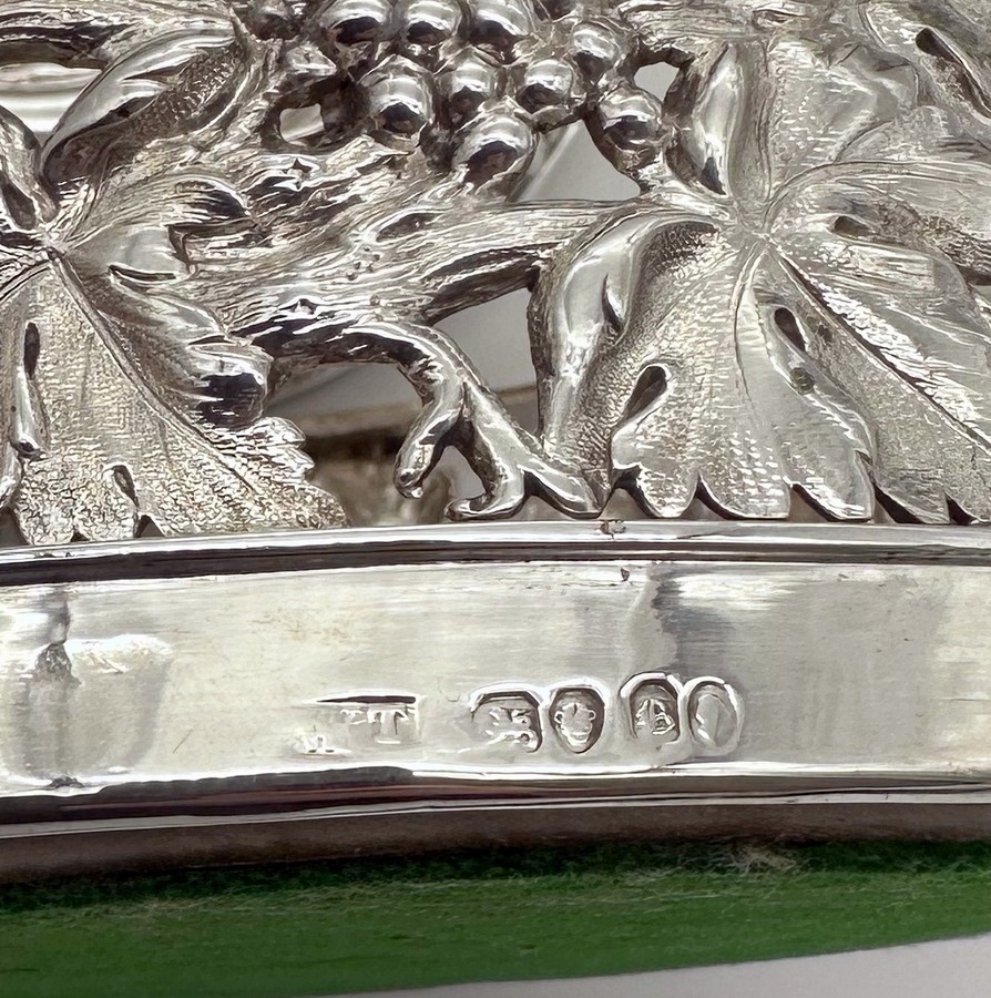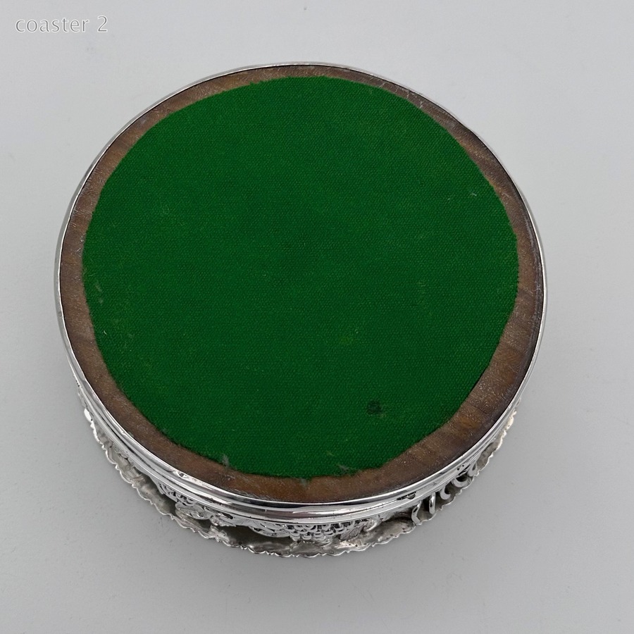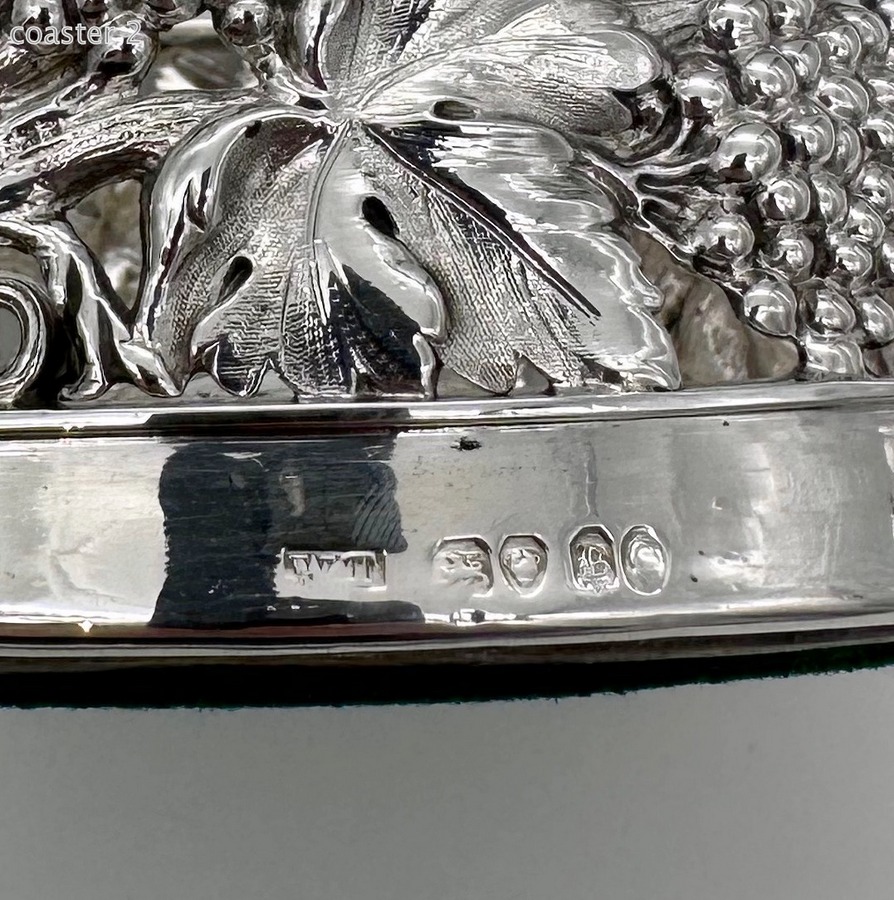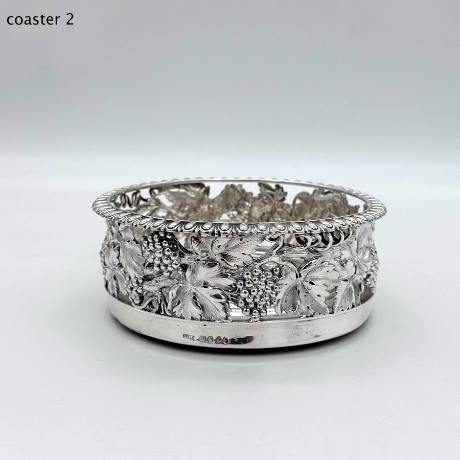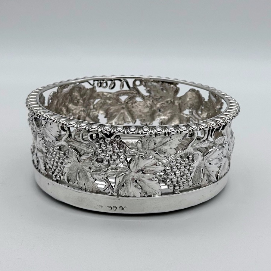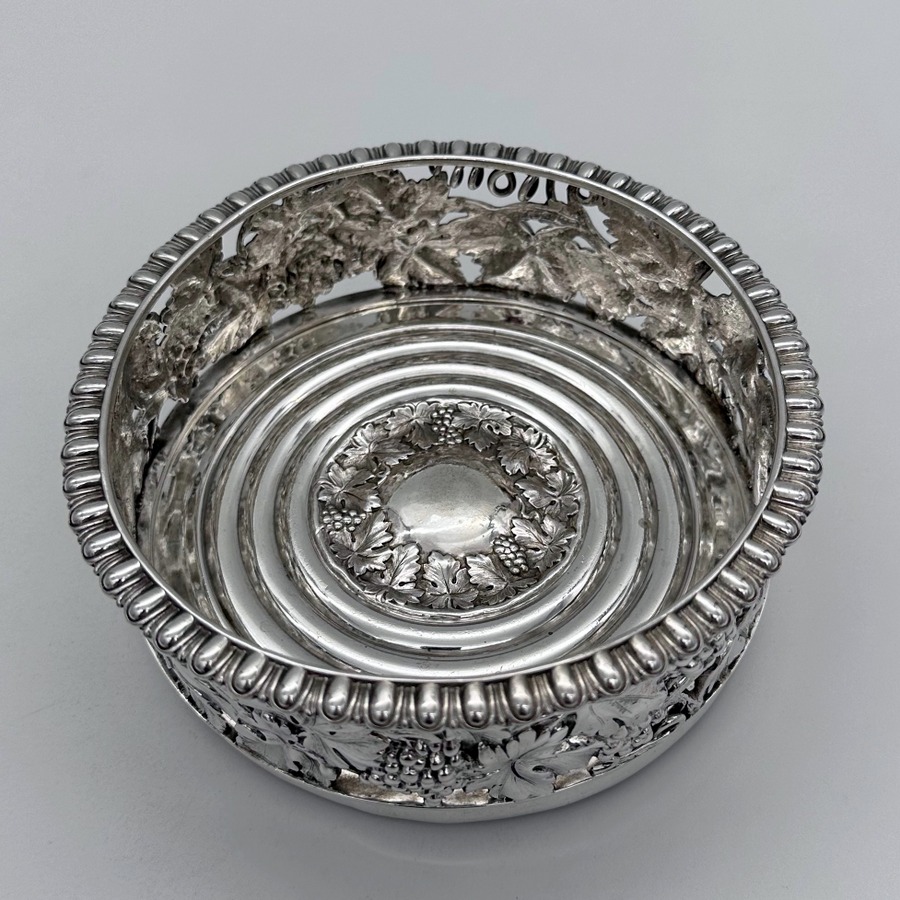 Incredibly fine pair of early 19th century cast sterling silver coasters decorated with elegant grape and vine walls and upper applied tongue borders. The inner circular wooden bases have been stylishly covered with a decorative silver sheets which has an additional grape and vine theme and beautiful outer turnings.