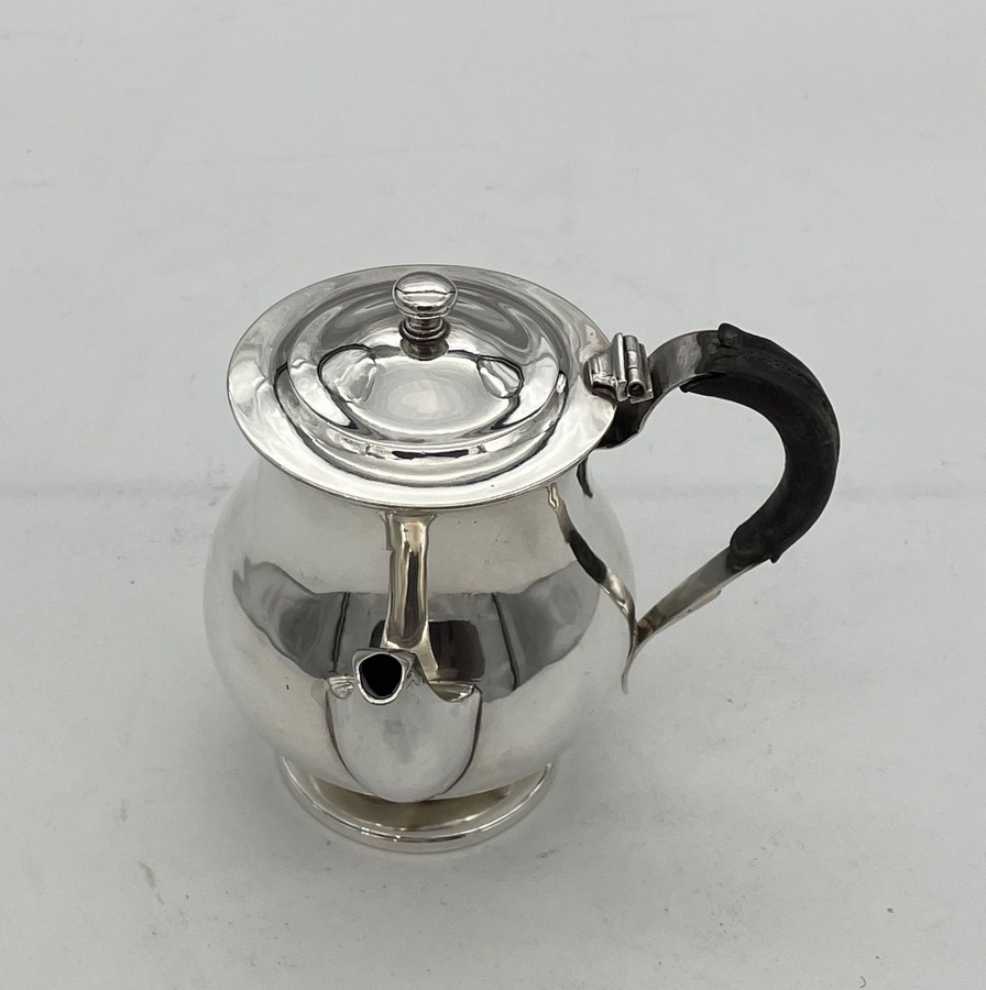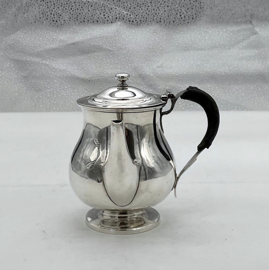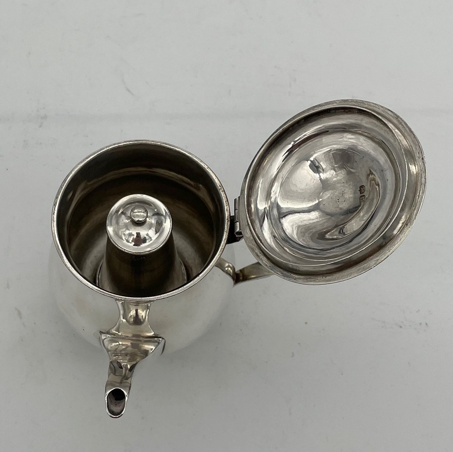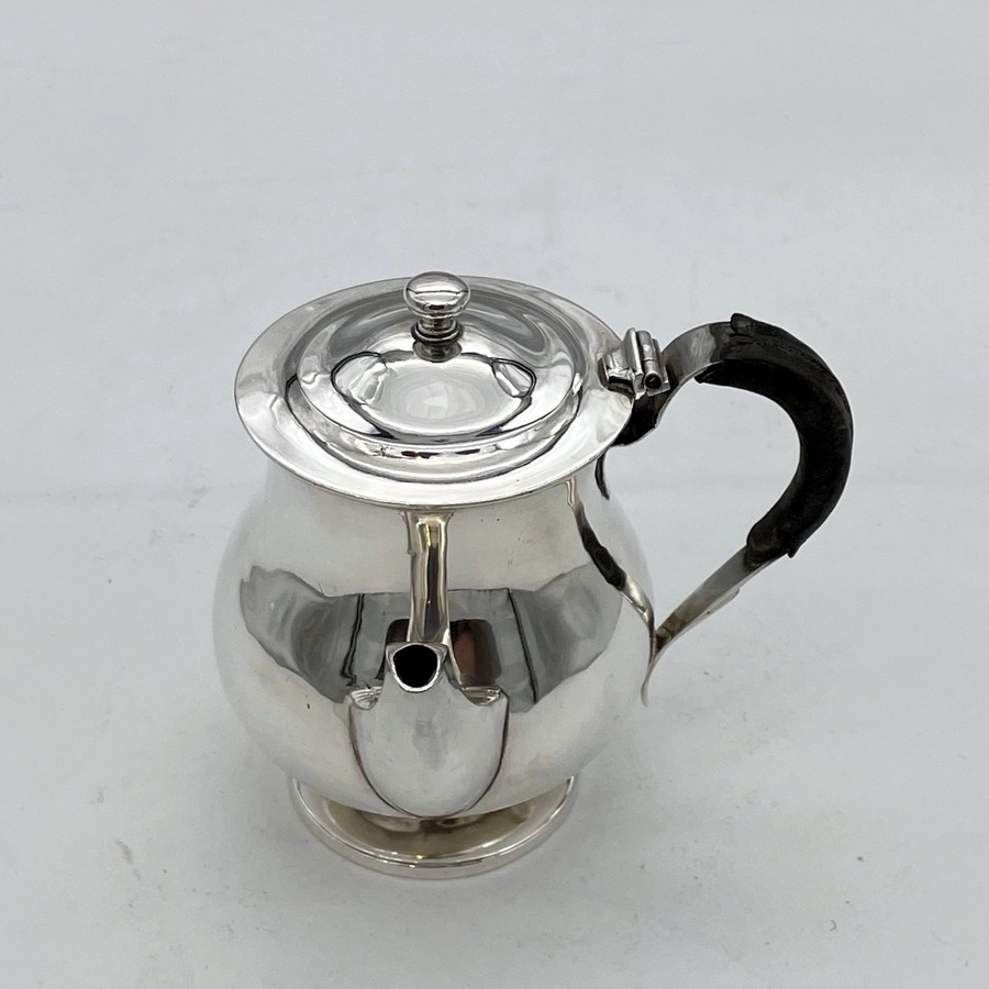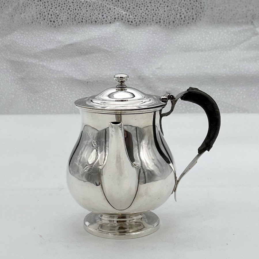 A sweet early 19th century baluster shaped silver gravy argyle designed with an elegant plain formed theme and stylish domed hinged lid. Â The scroll handle is leather bound for insulation and the detachable heat chamber has an iron insert.