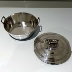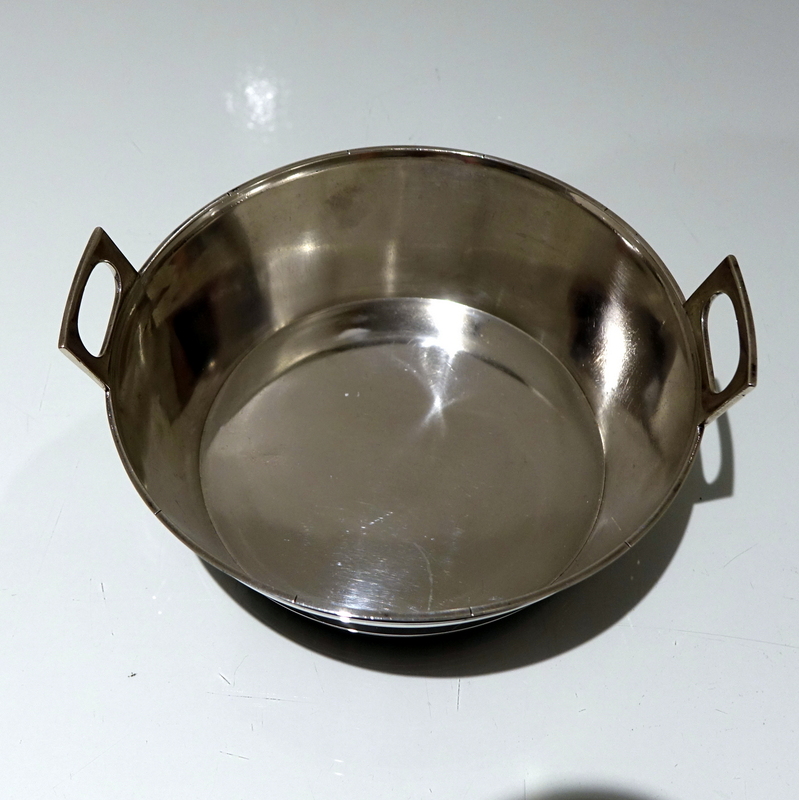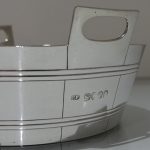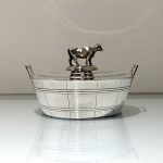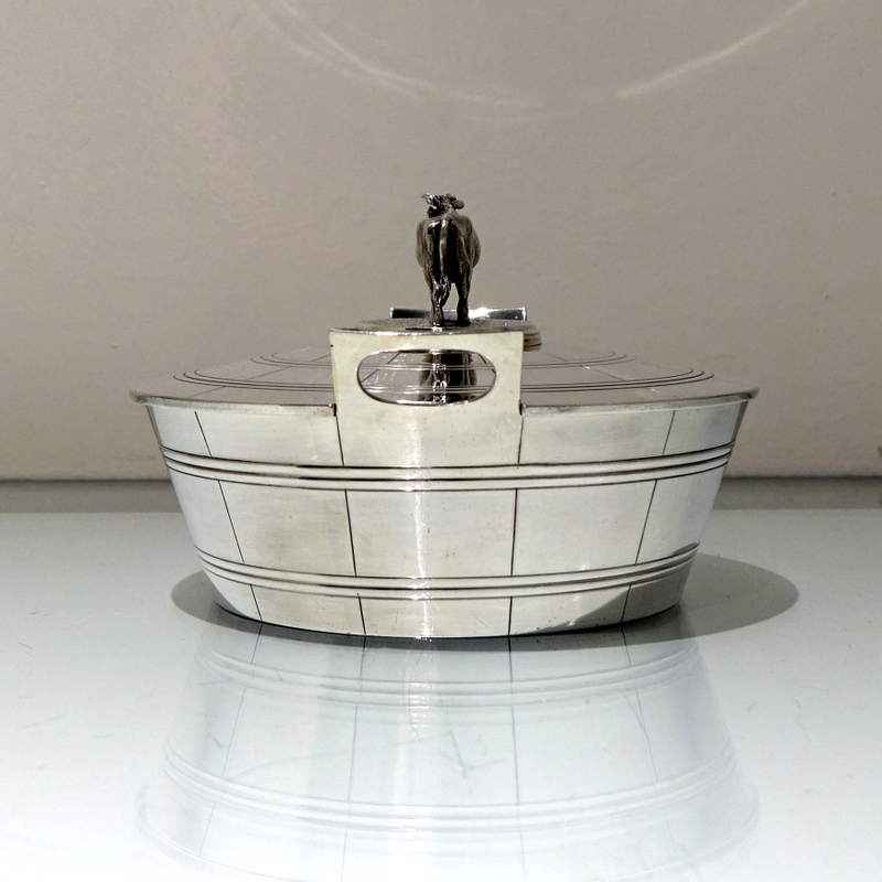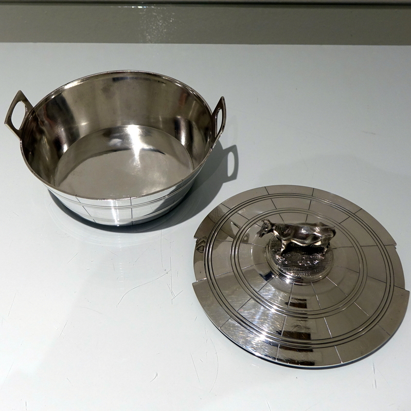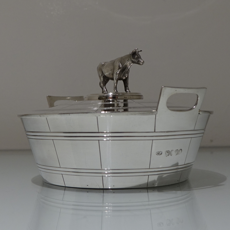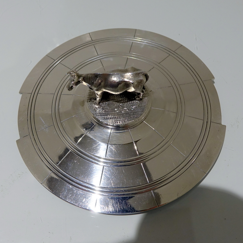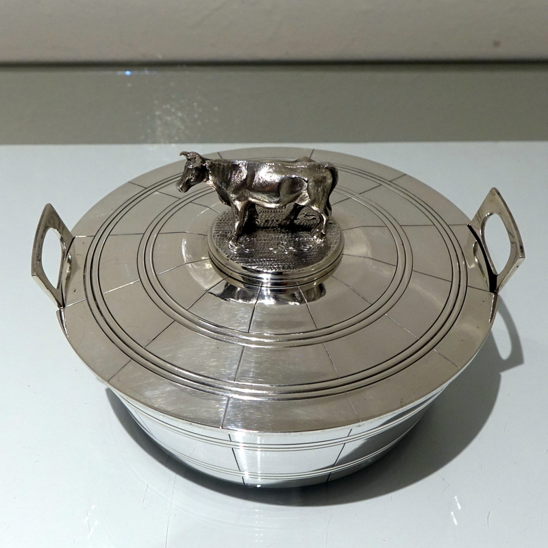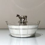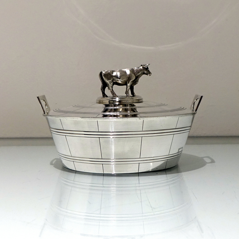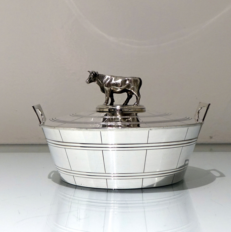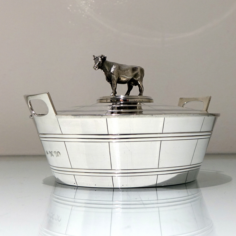 A very stylish butter dish designed by the highly renowned Charles T Fox. Â The body of the dish is modelled in the form of a milk pail and has elegant floating handles in which sits a push fit detachable lid. Â The lid is then mounted by a stunning cast “bull” finial.