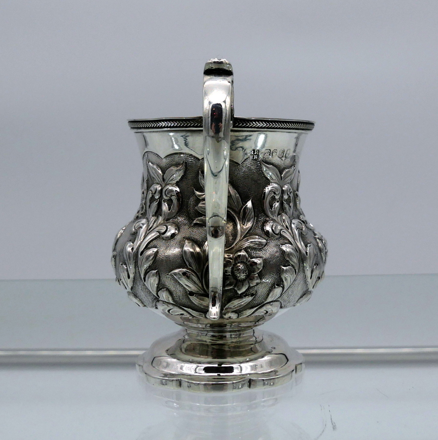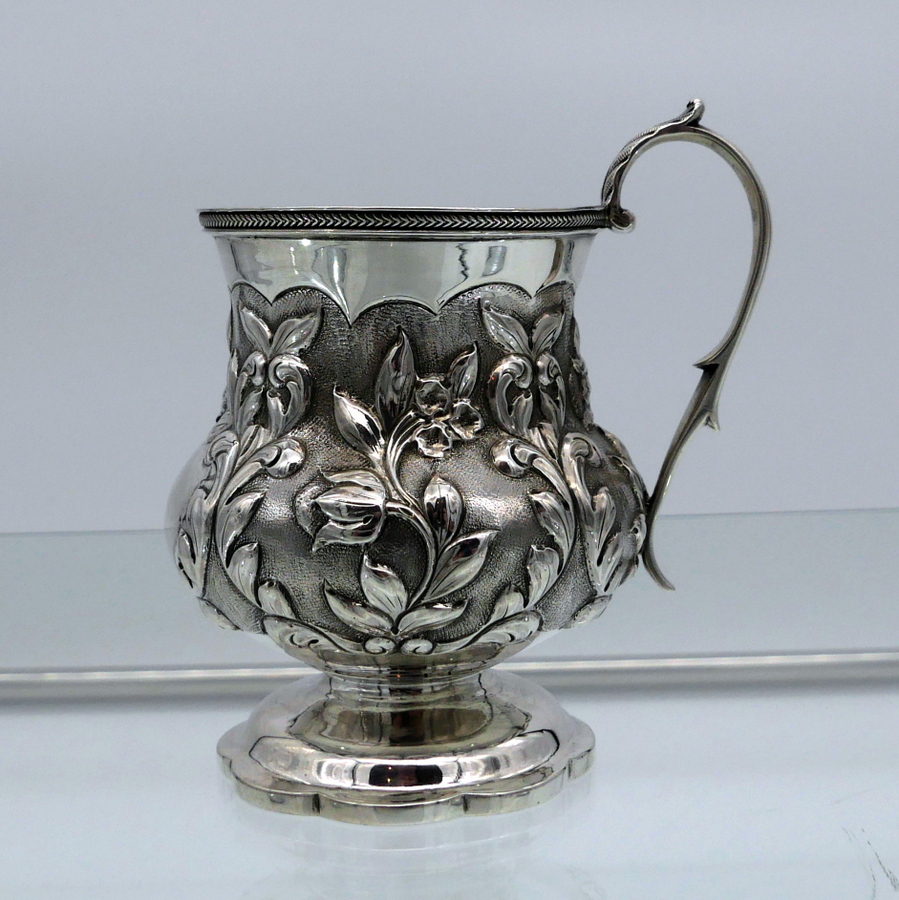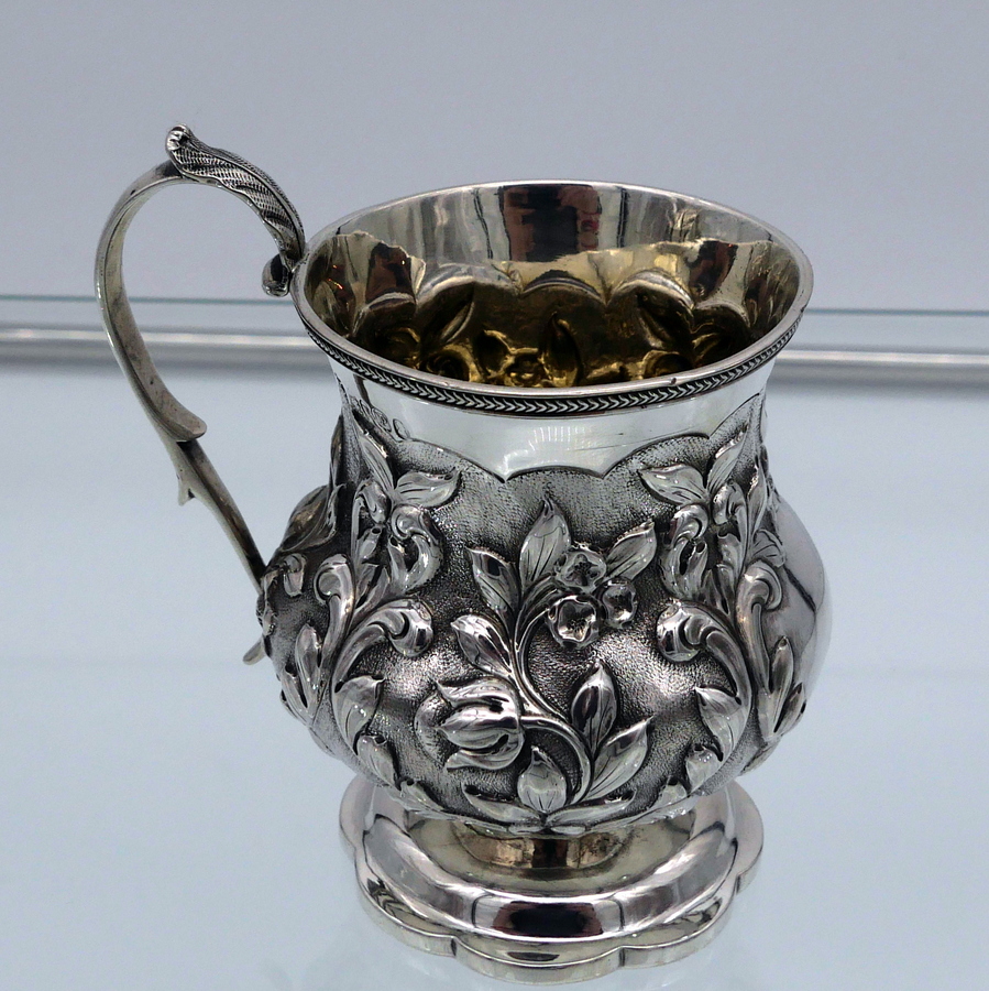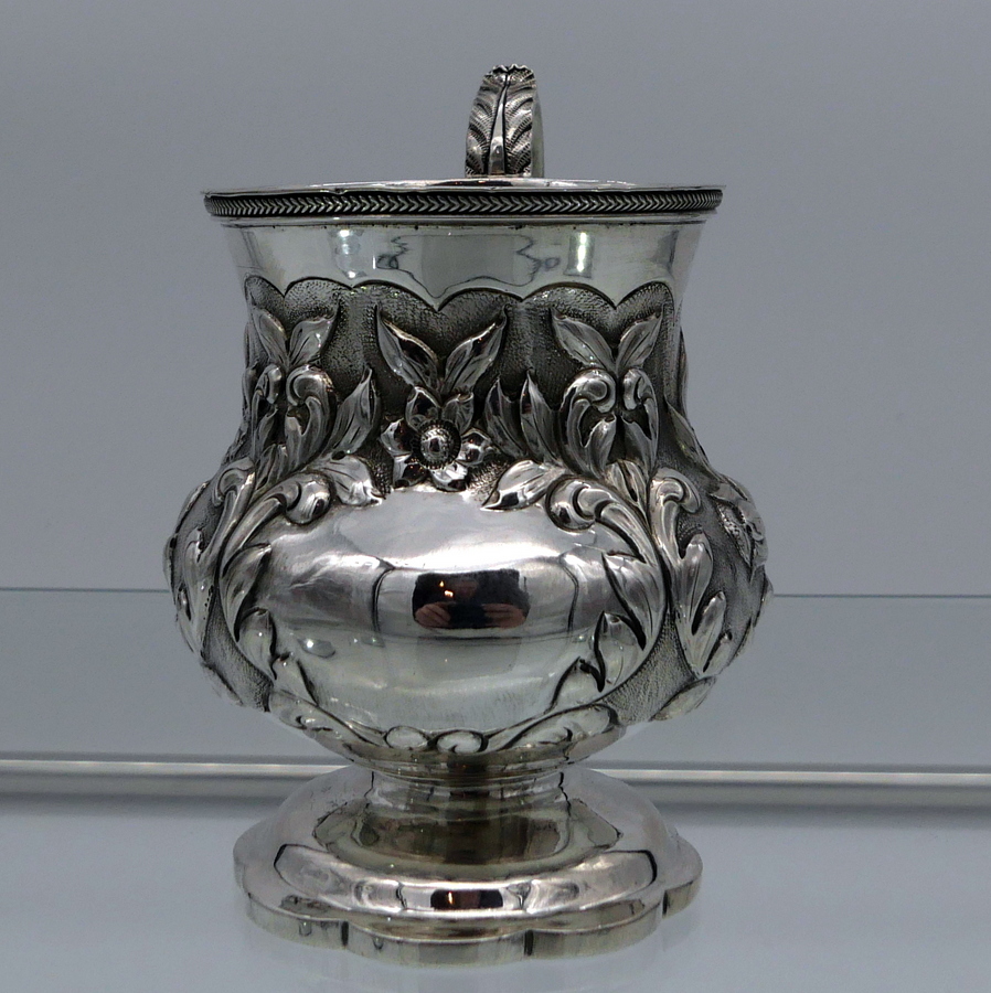 A very fine early 19th century baluster shaped christening mug decorated with sumptuous floral embellishing which is then set on a matt background for decorative contrast.