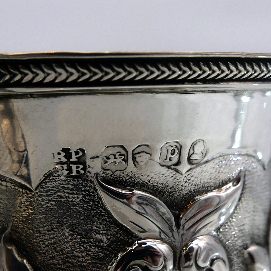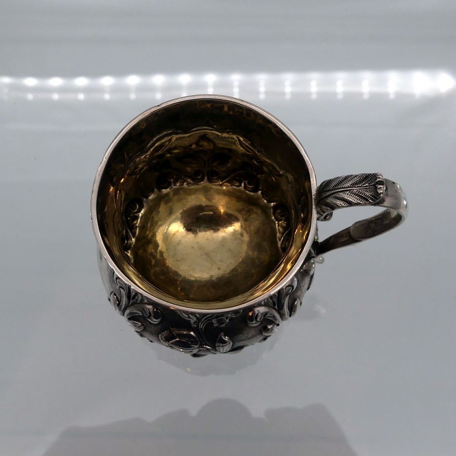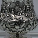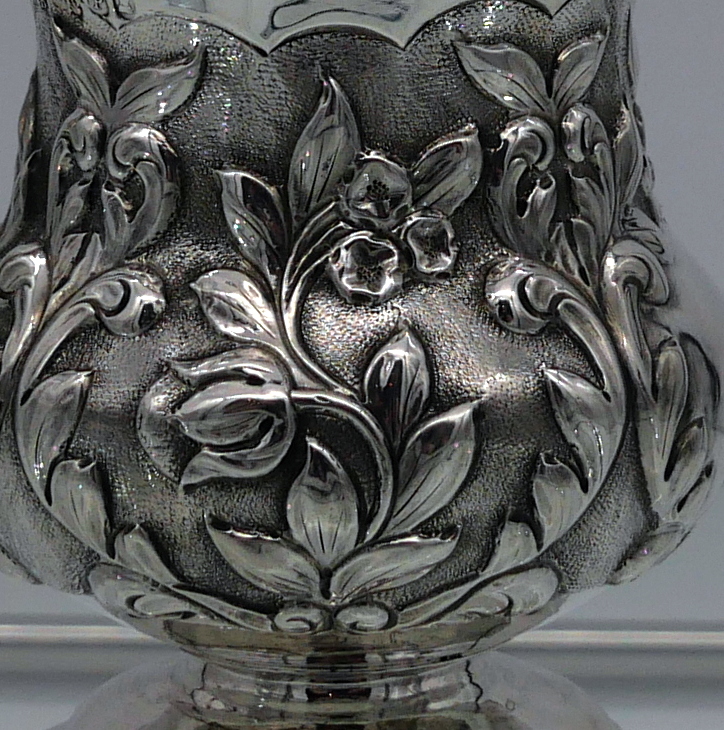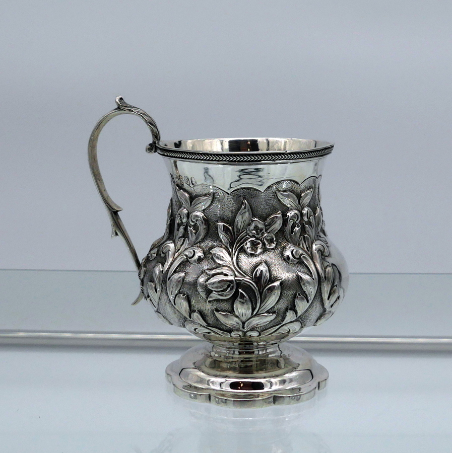 A very fine early 19th century baluster shaped christening mug decorated with sumptuous floral embellishing which is then set on a matt background for decorative contrast.