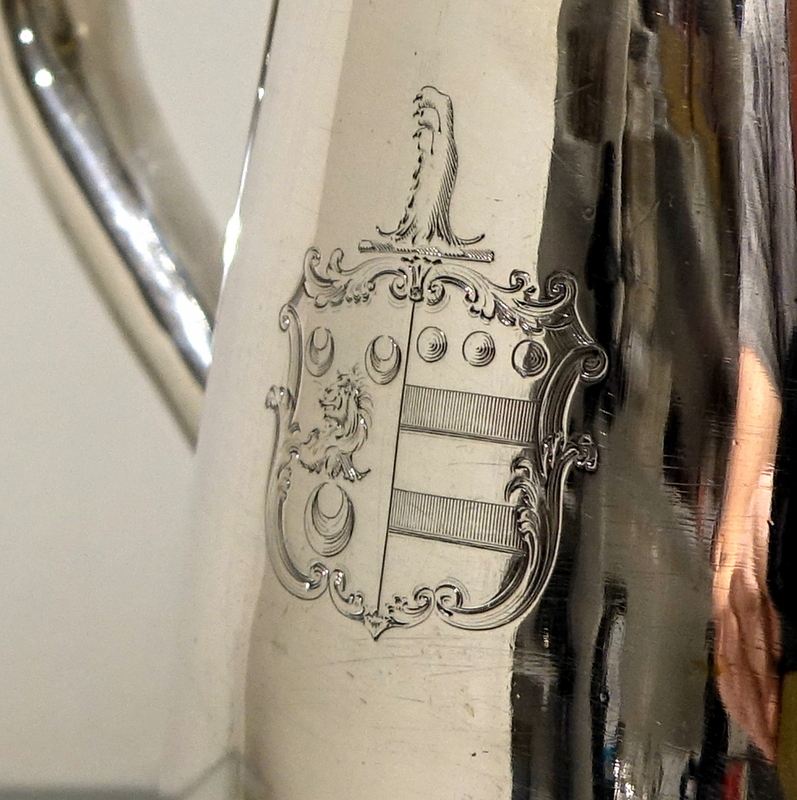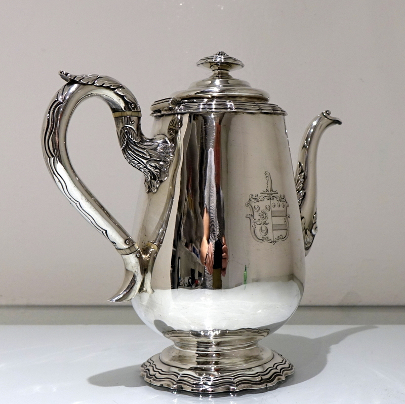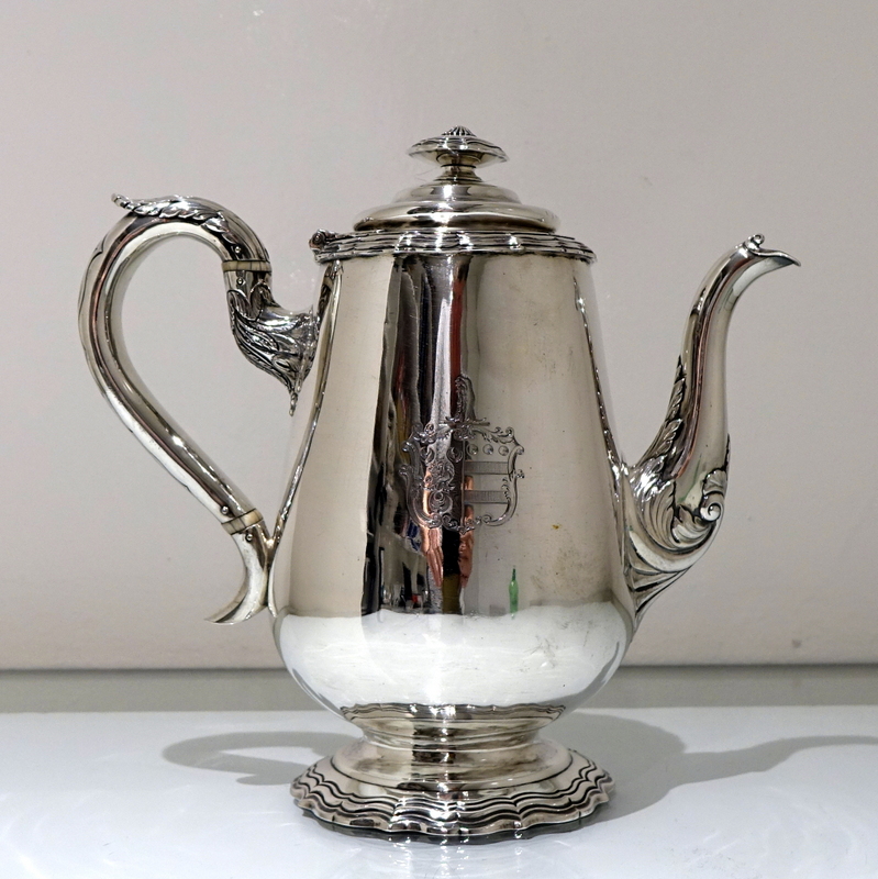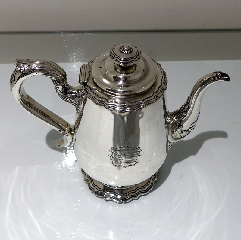A beautiful and incredibly rare William IV baluster coffee pot designed with an ornate floral spout and an upper socket which forms an elegant decorative contrast to the plain scroll handle.  There is a stylish contemporary armorial for importance.