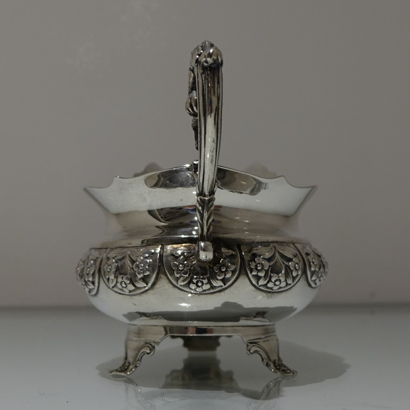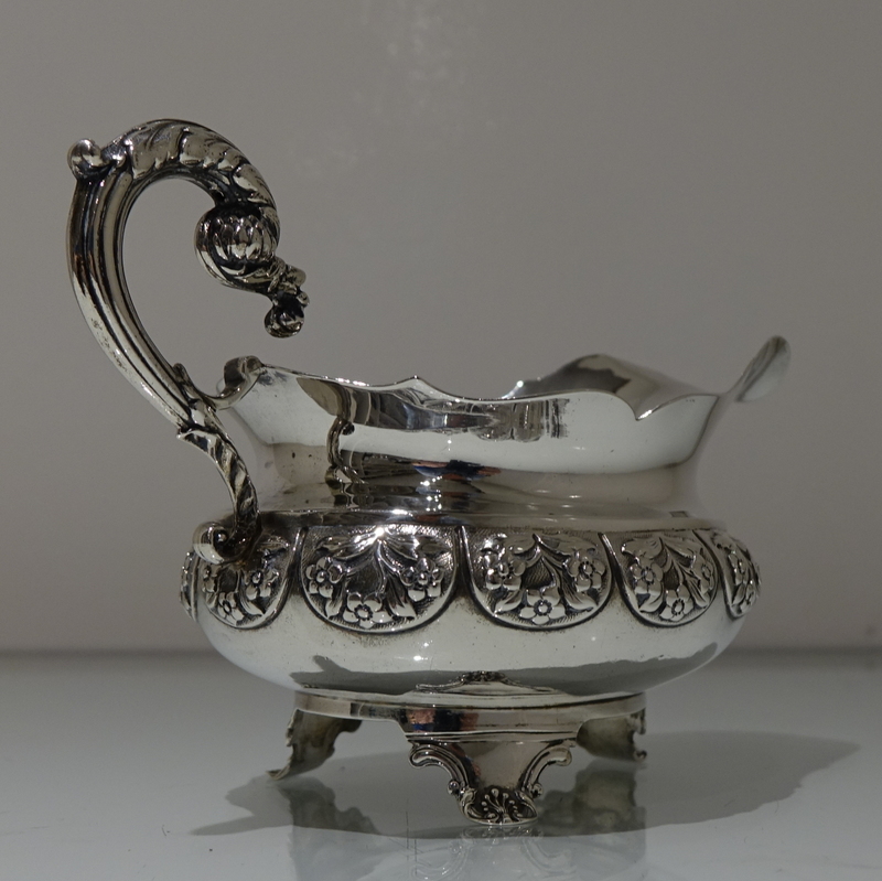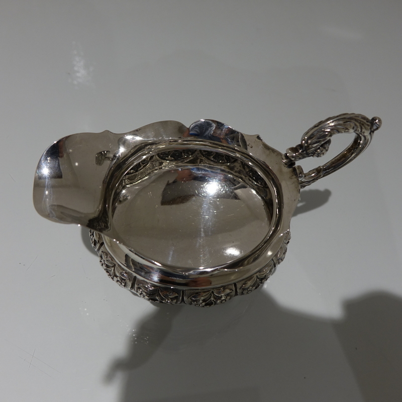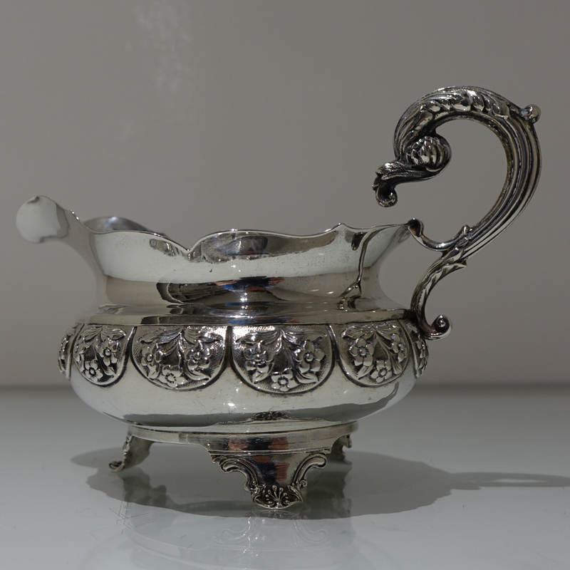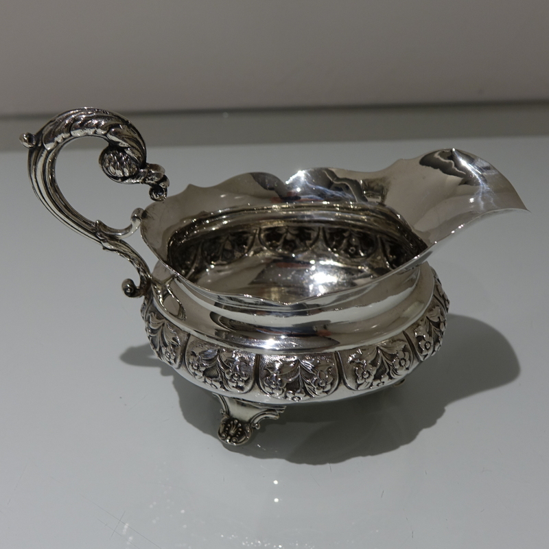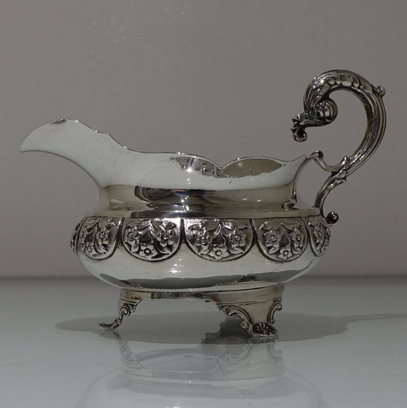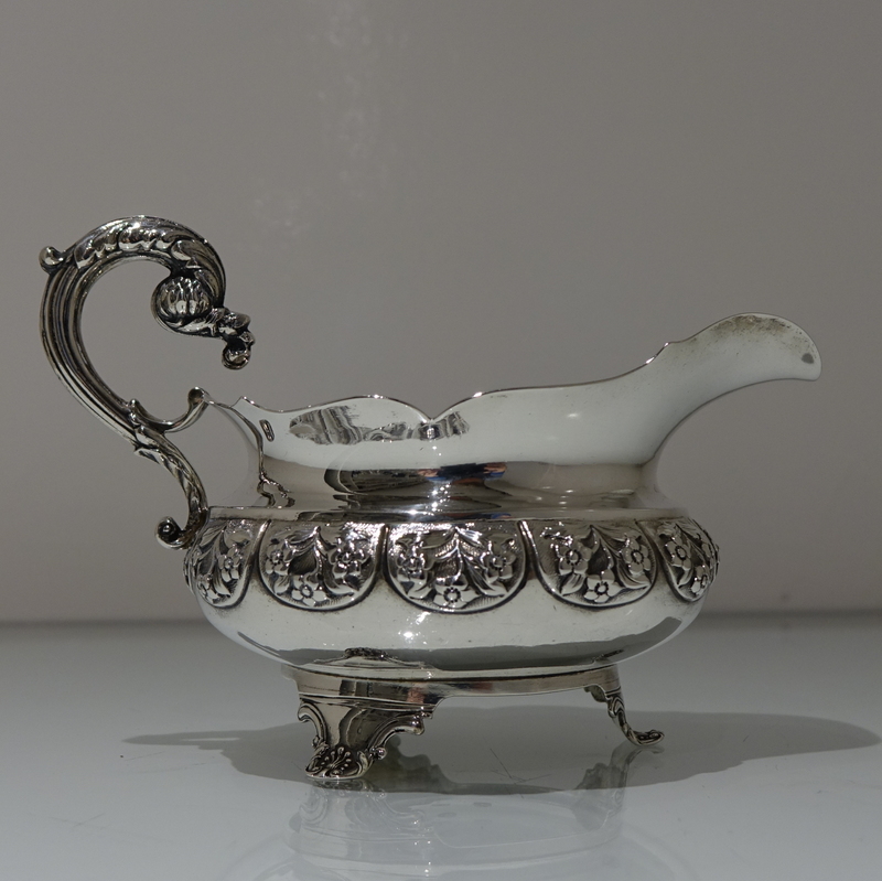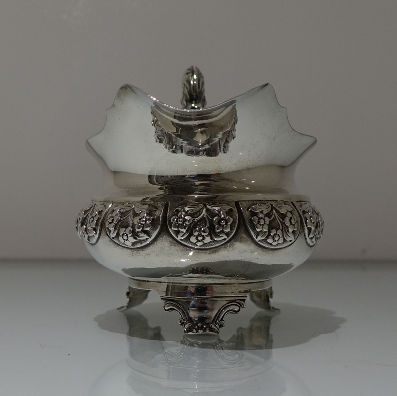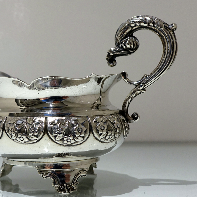 A beautiful and extremely unusual 19th century silver sauce boat decorated with a stunning mix of floral embossing on a plain formed background for decorative contrast. Â The stylish floating handle and decorative ornate feet greatly enhance an already superb design.