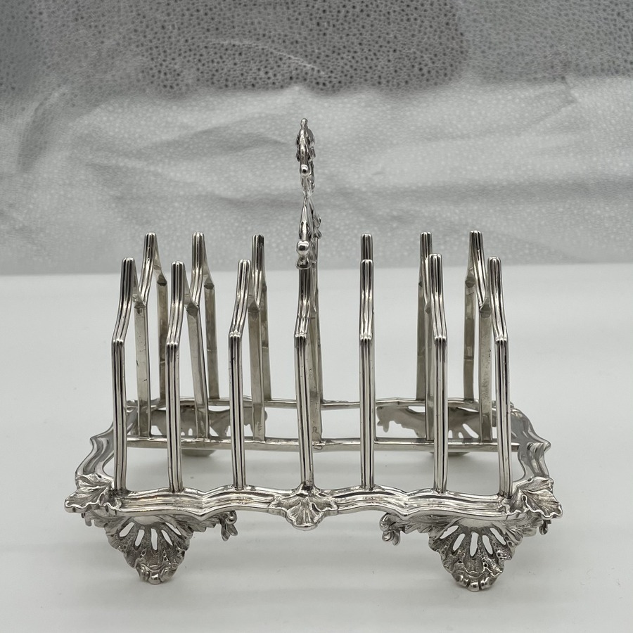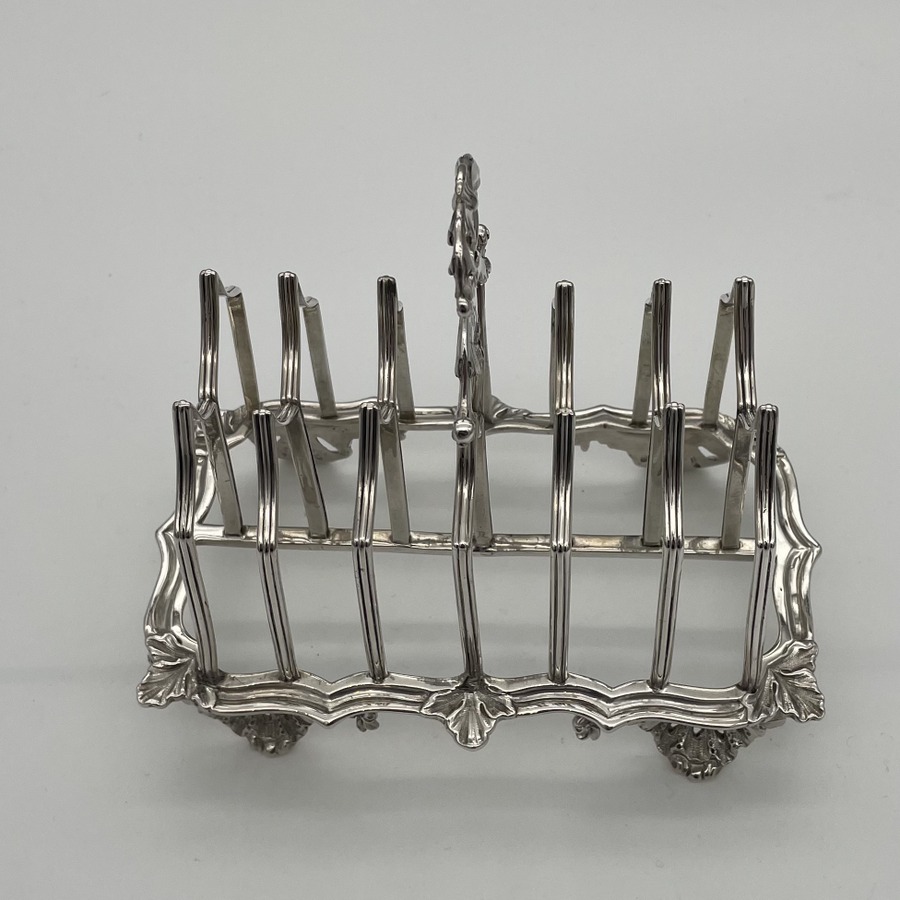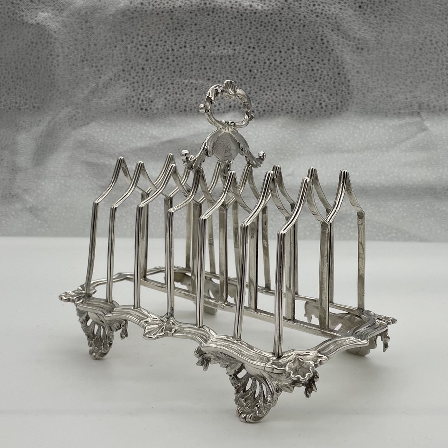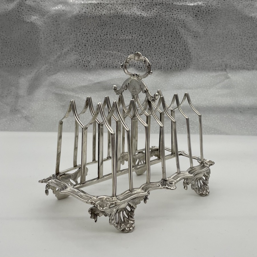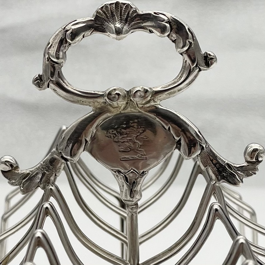 A truly stylish early 19th century sterling silver toast rack shaped with a stylish naturalistic body and a delightful acanthus capped mast handle. Â There are double hand engraved contemporary crests for importance.