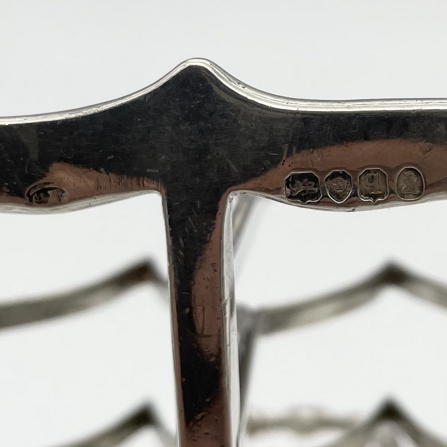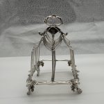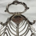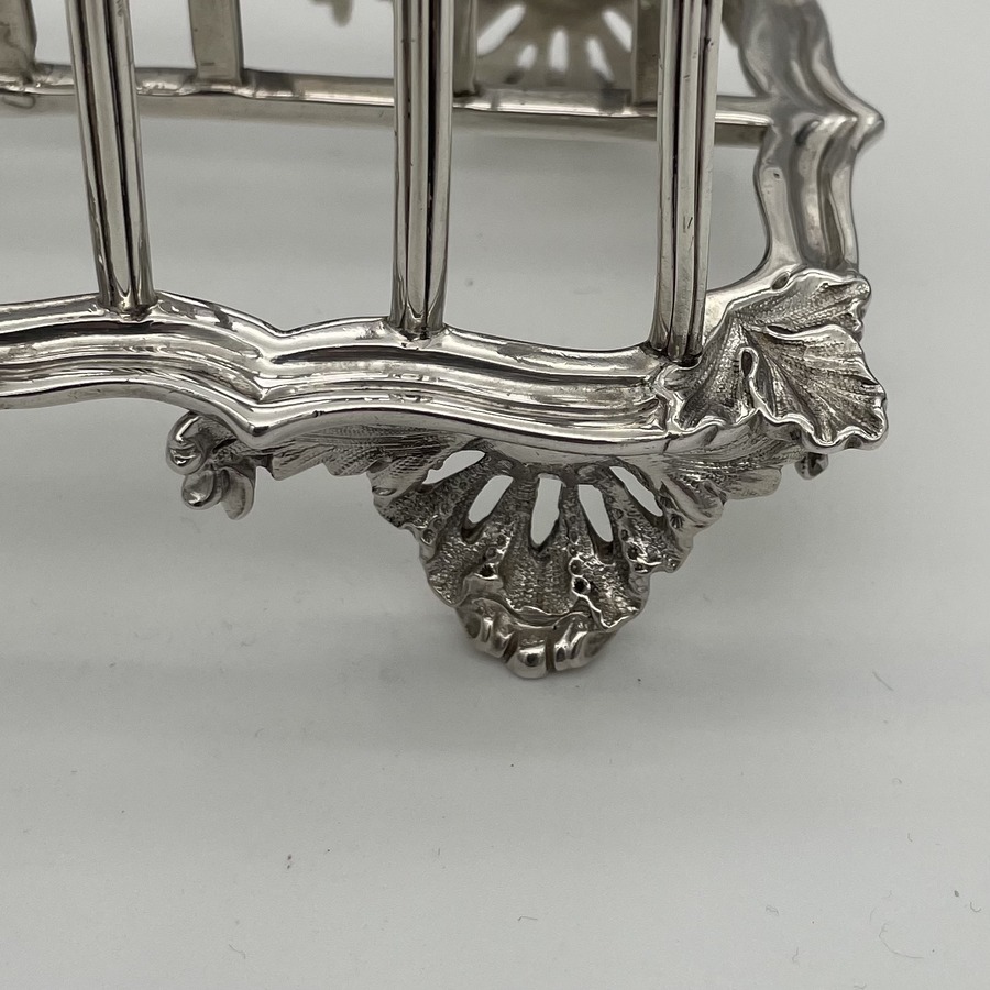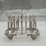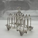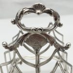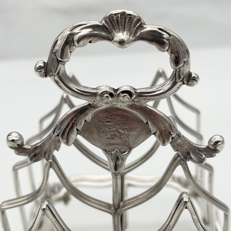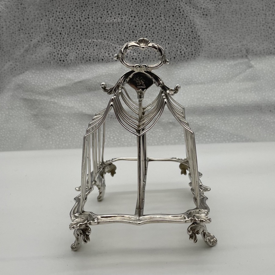 A truly stylish early 19th century sterling silver toast rack shaped with a stylish naturalistic body and a delightful acanthus capped mast handle. Â There are double hand engraved contemporary crests for importance.