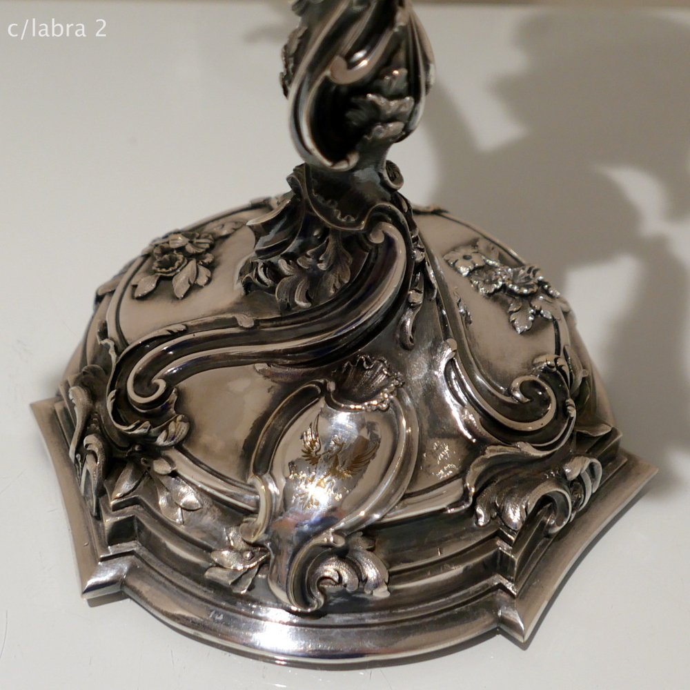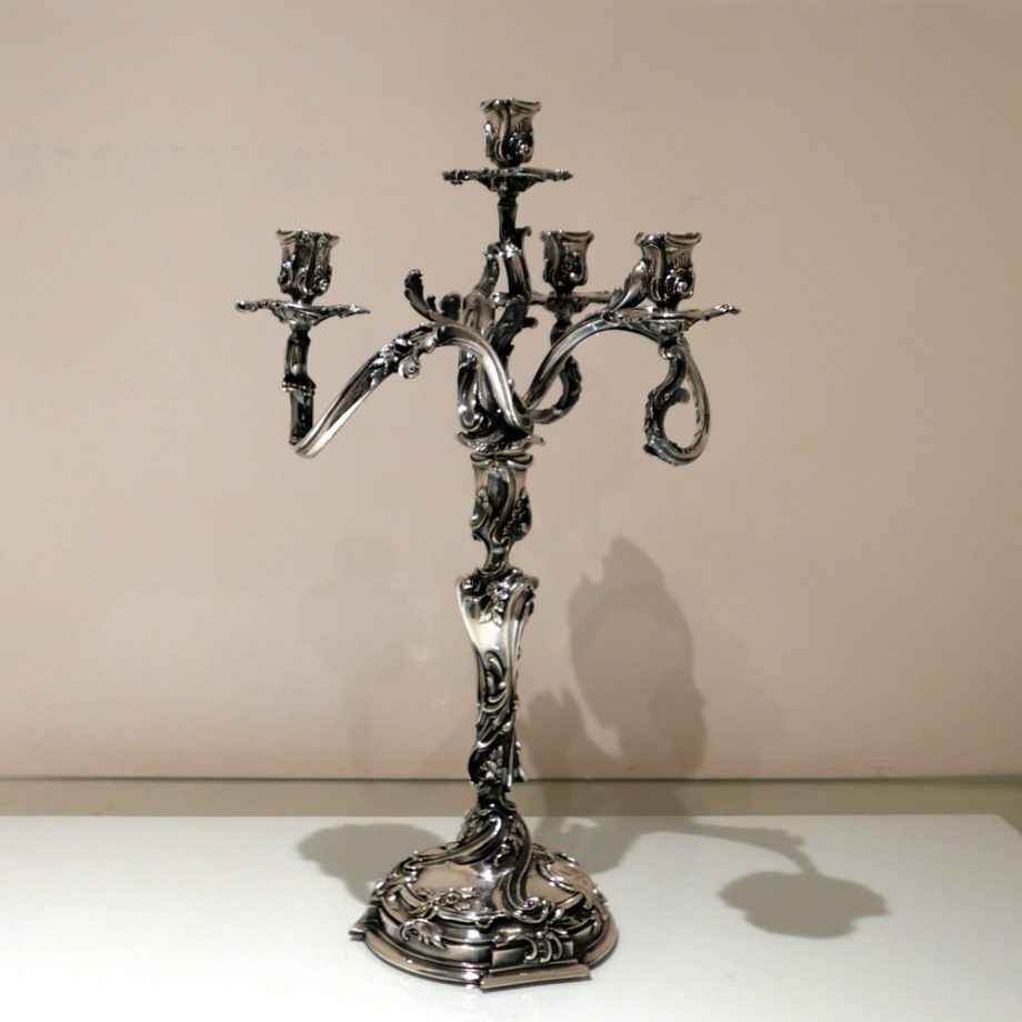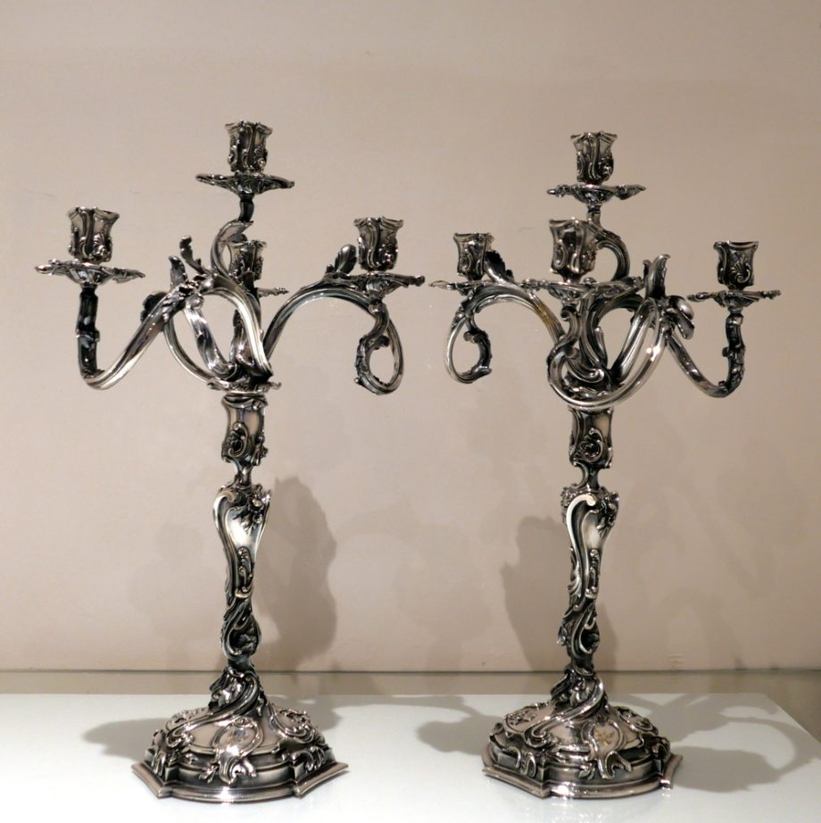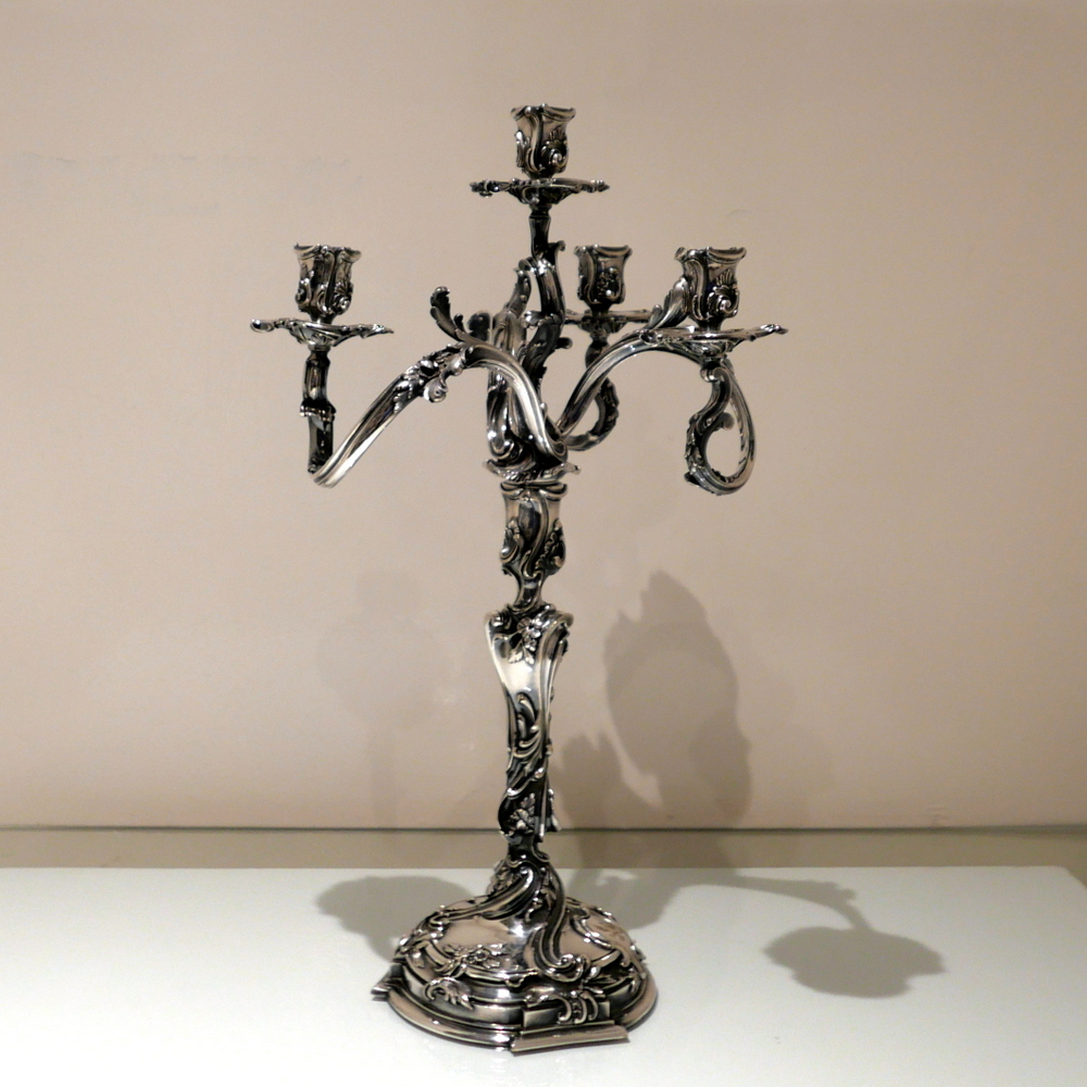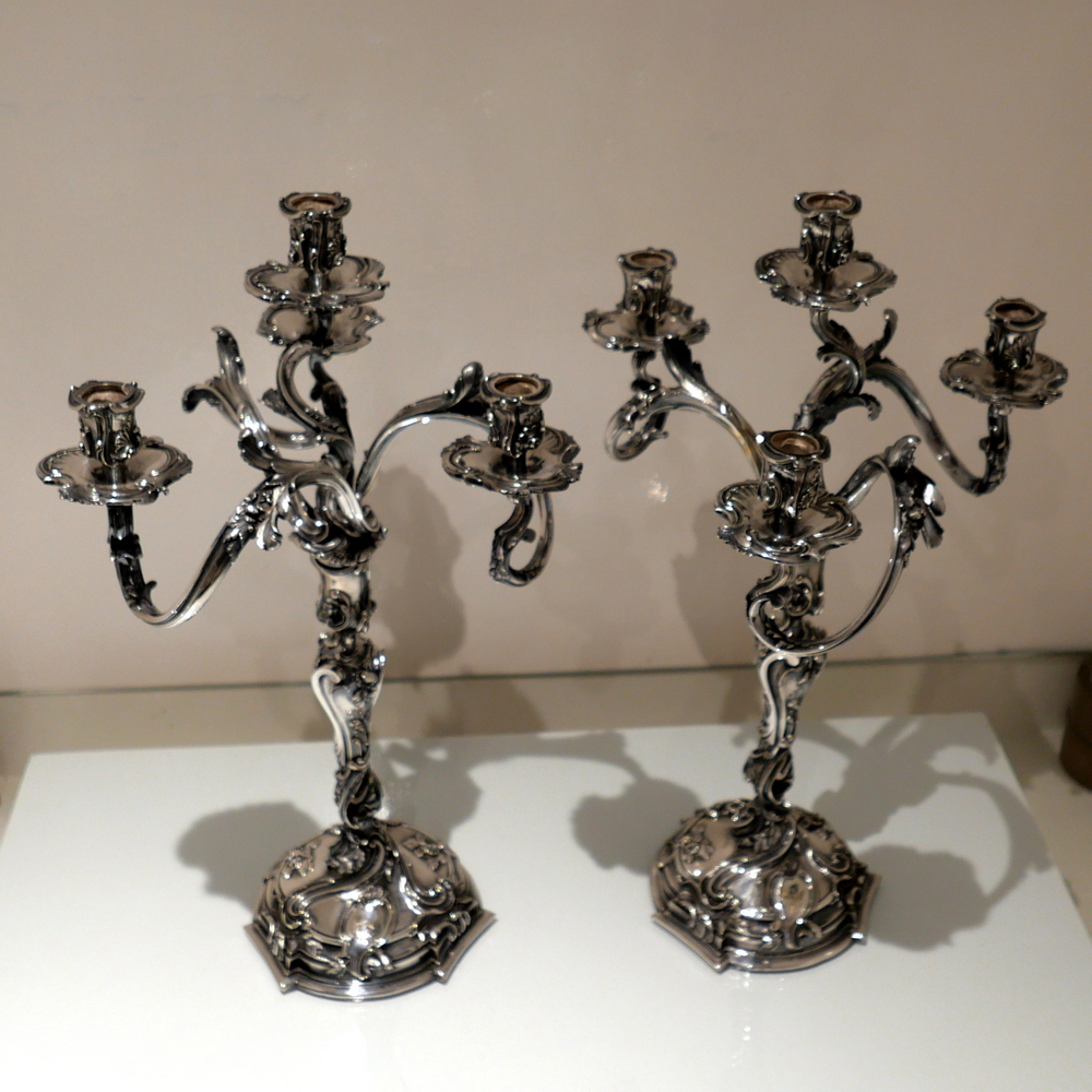 An incredibly important looking and exceptional quality pair of four light “rococo” style French made candelabra decorated with elegant floral and foliate designs. Â The detachable bases have stylish contemporary engraved crests for importance.
