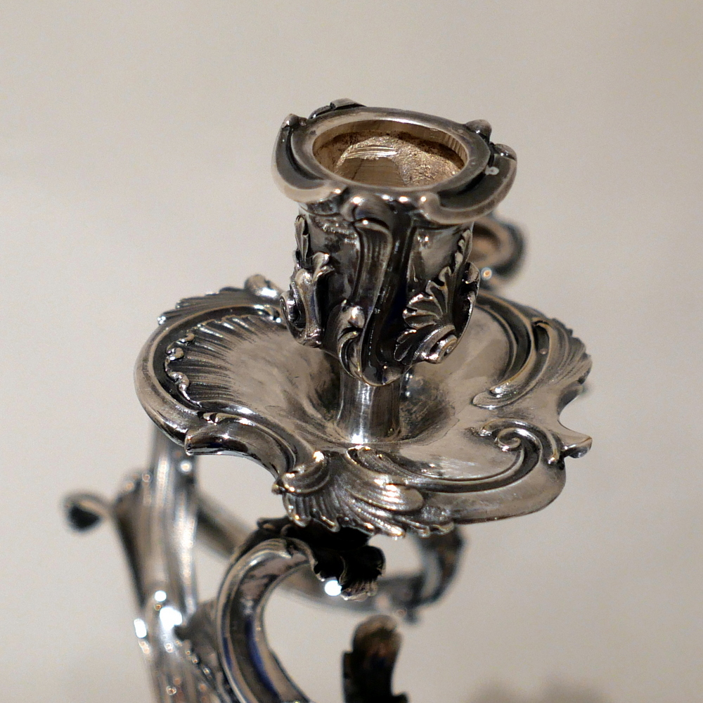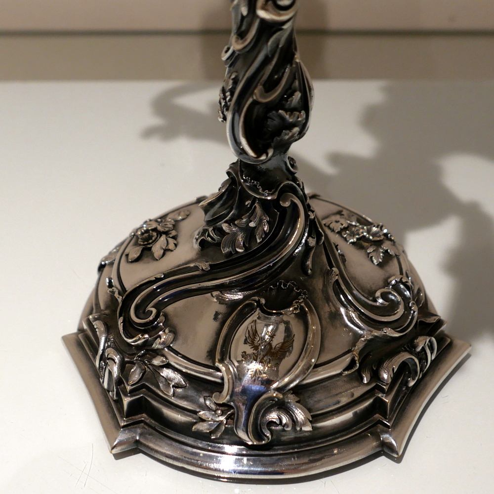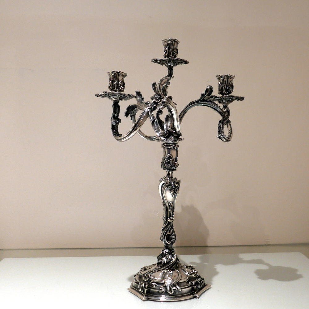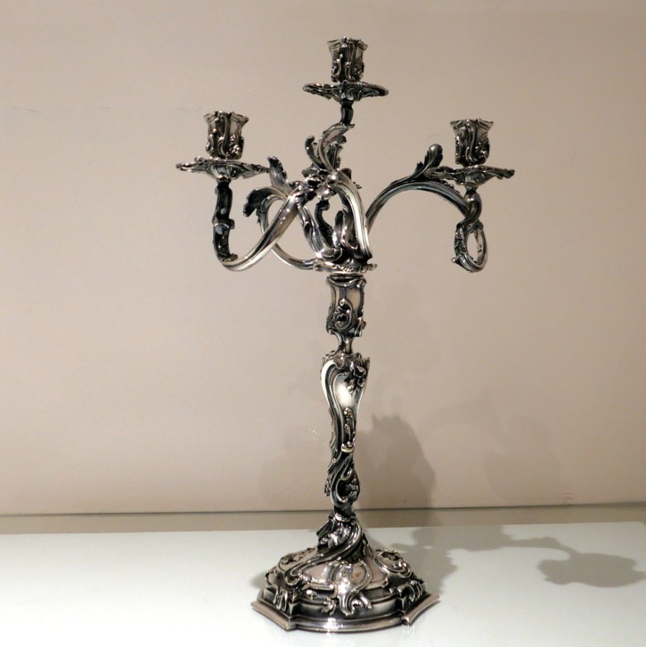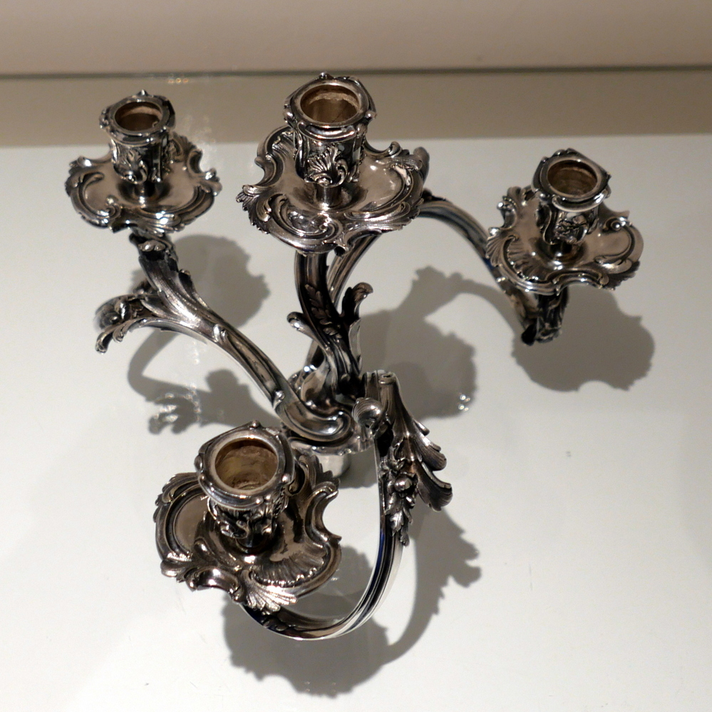 An incredibly important looking and exceptional quality pair of four light “rococo” style French made candelabra decorated with elegant floral and foliate designs. Â The detachable bases have stylish contemporary engraved crests for importance.