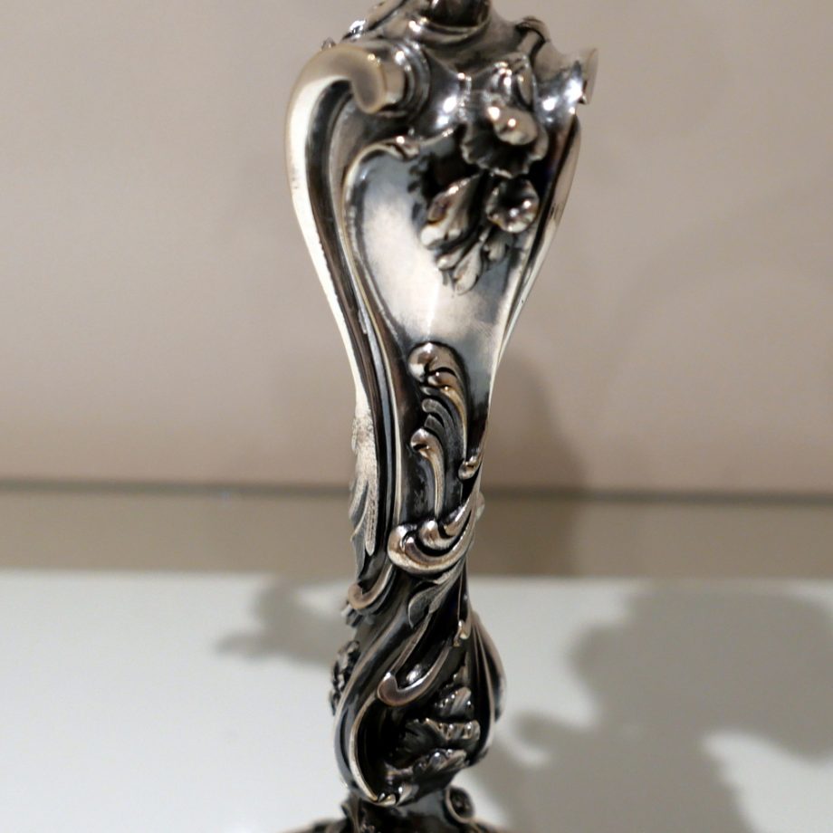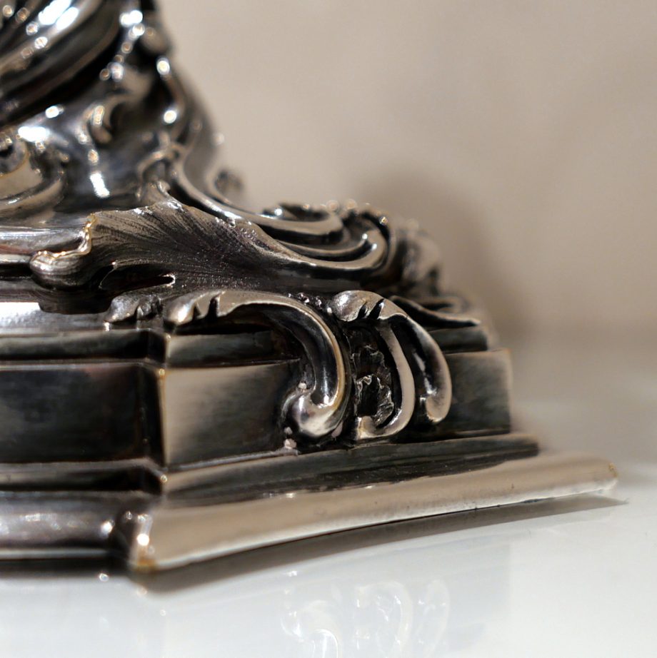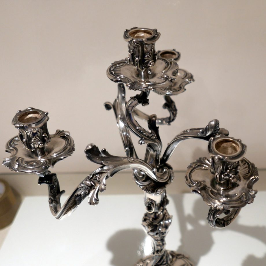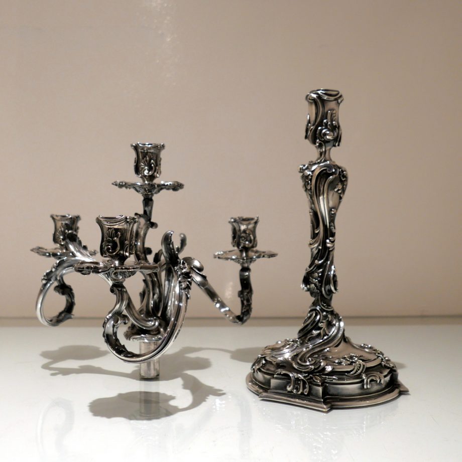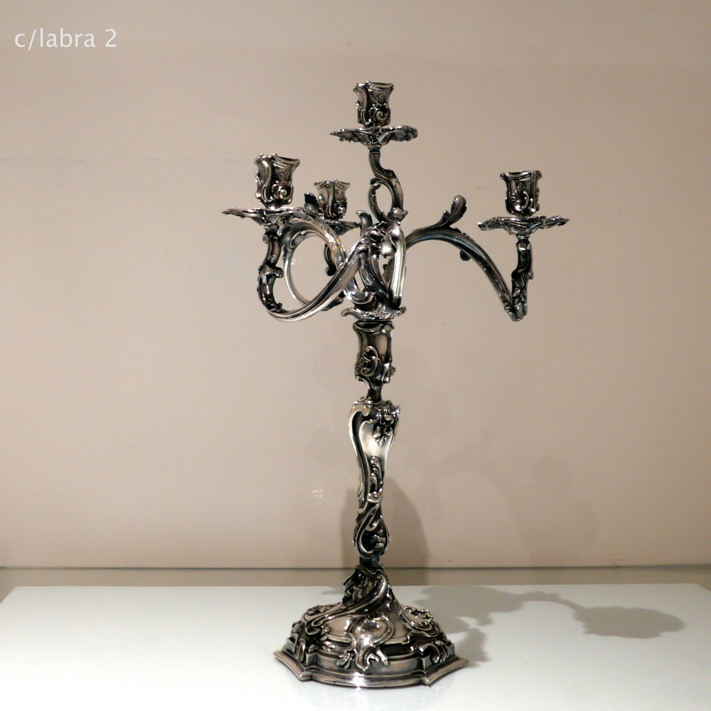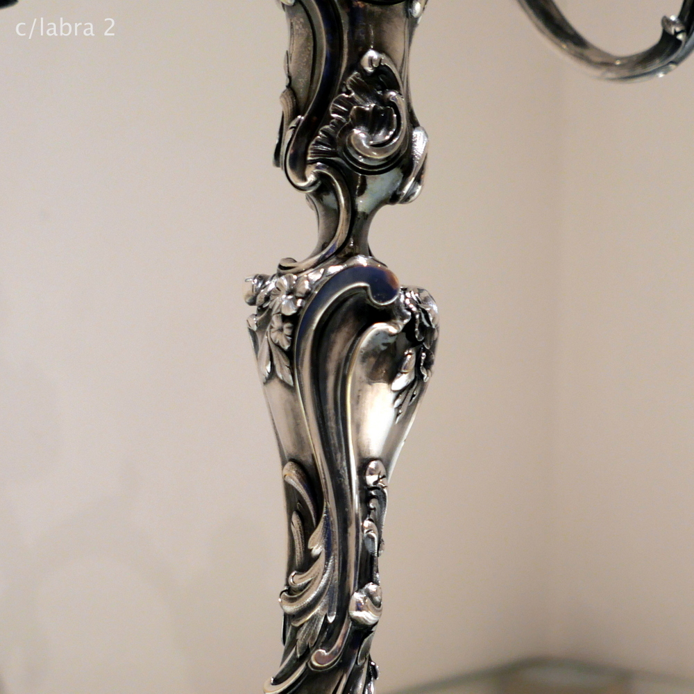 An incredibly important looking and exceptional quality pair of four light “rococo” style French made candelabra decorated with elegant floral and foliate designs. Â The detachable bases have stylish contemporary engraved crests for importance.