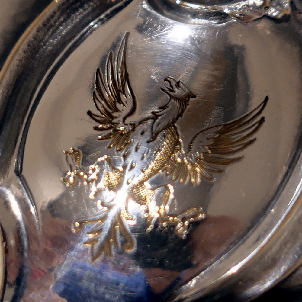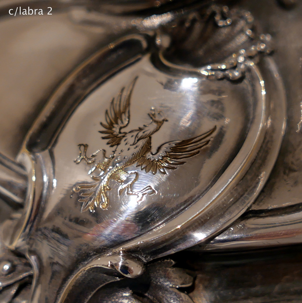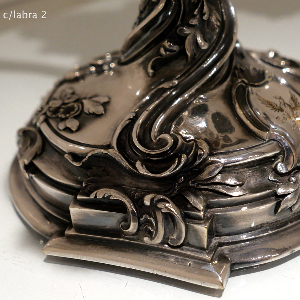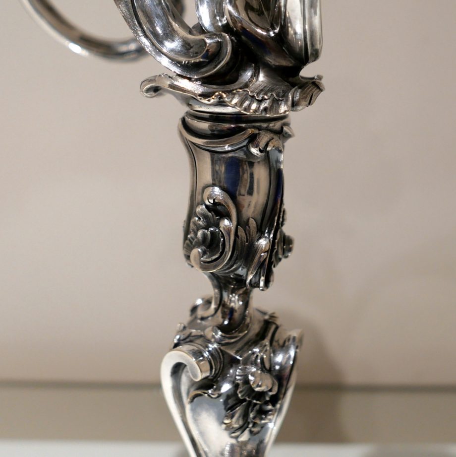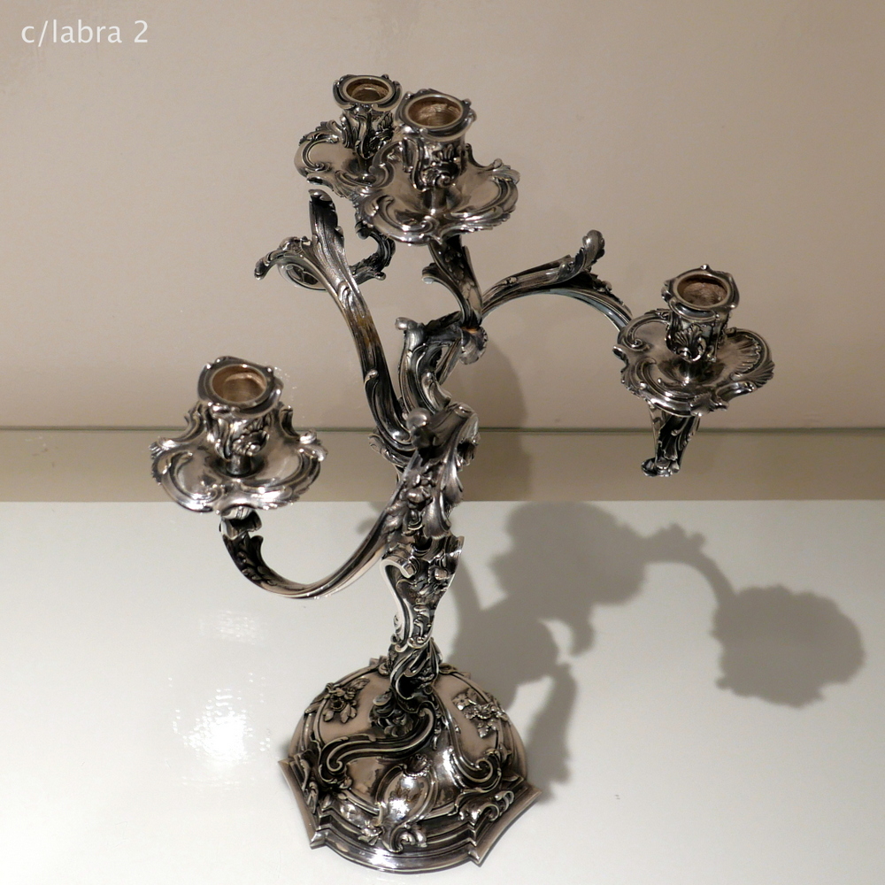 An incredibly important looking and exceptional quality pair of four light “rococo” style French made candelabra decorated with elegant floral and foliate designs. Â The detachable bases have stylish contemporary engraved crests for importance.