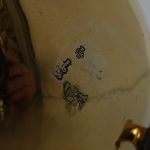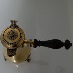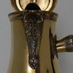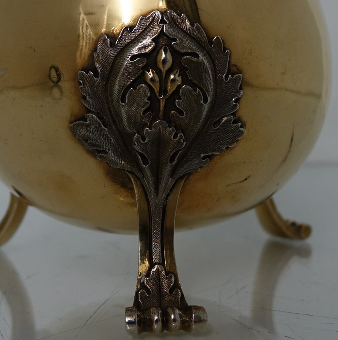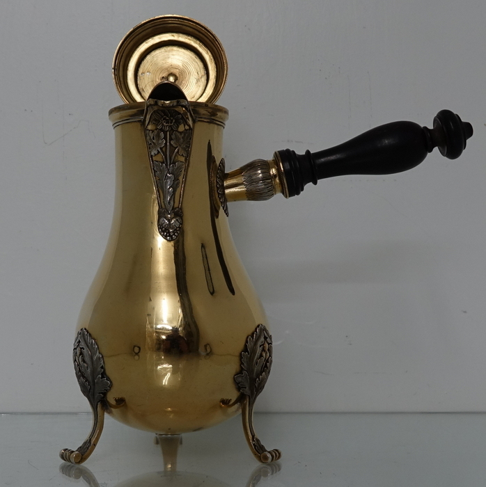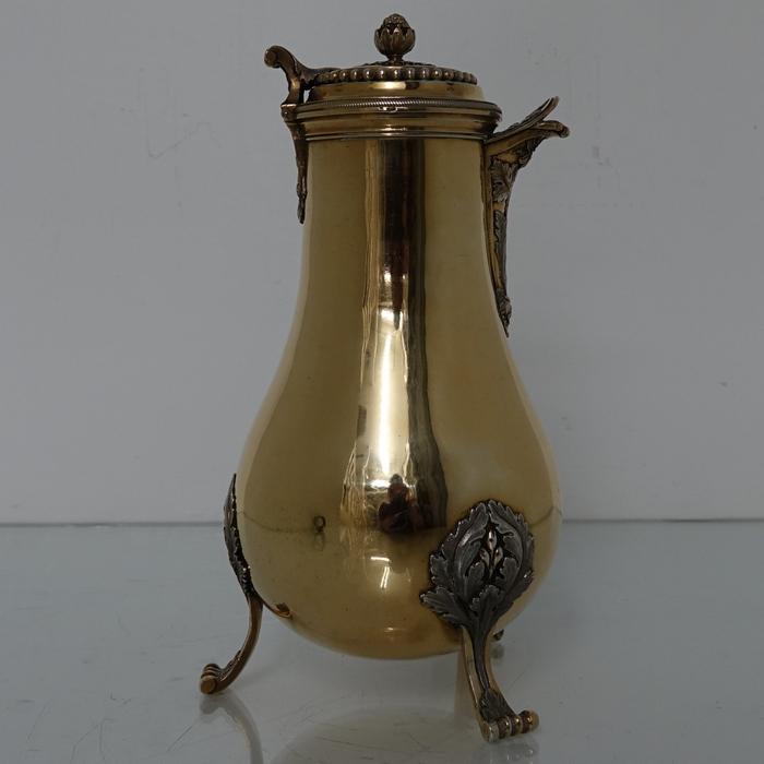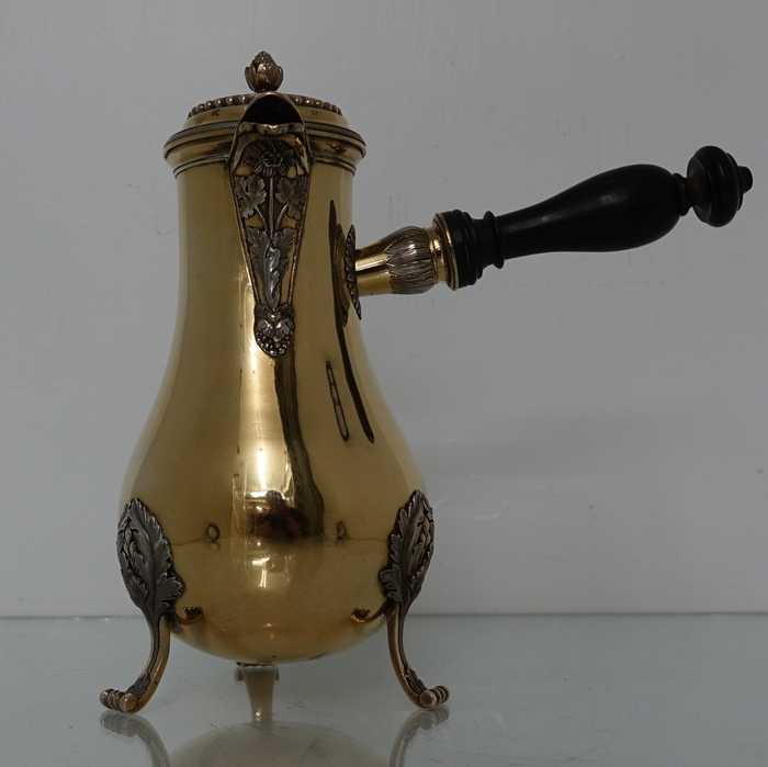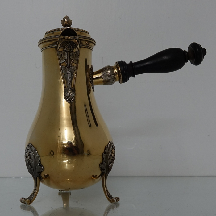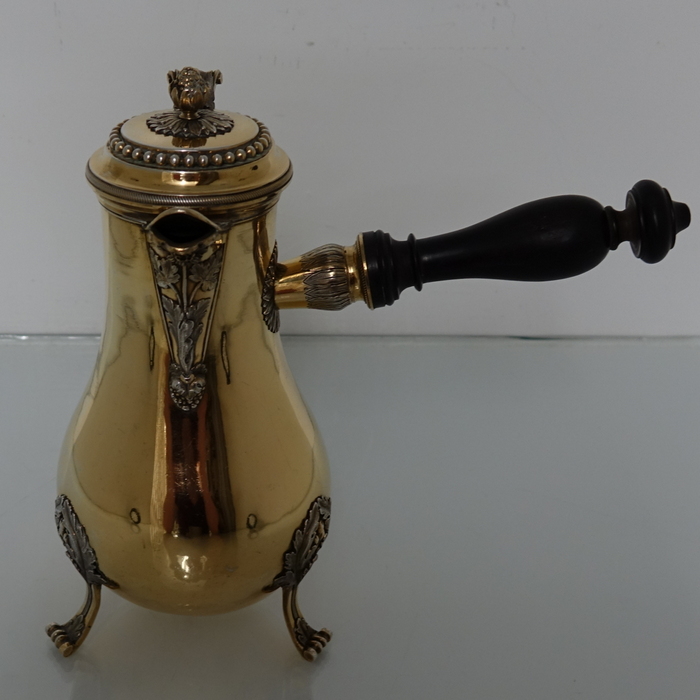 A very elegant nineteenth century silver gilt side handled coffee pot standing on three ornate feet. Â The lid is hinged with a gallery of bead decoration for highlights and is crowned with a stunning acorn finial. Â The handle is beautifully spun out of fruit wood and sits in a ornate hand chased socket with a foliate shield applied on the body.
