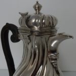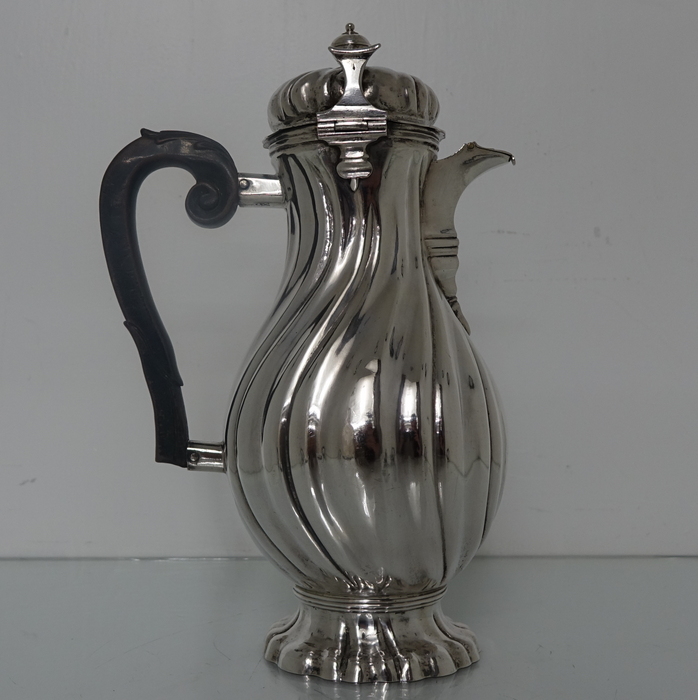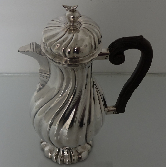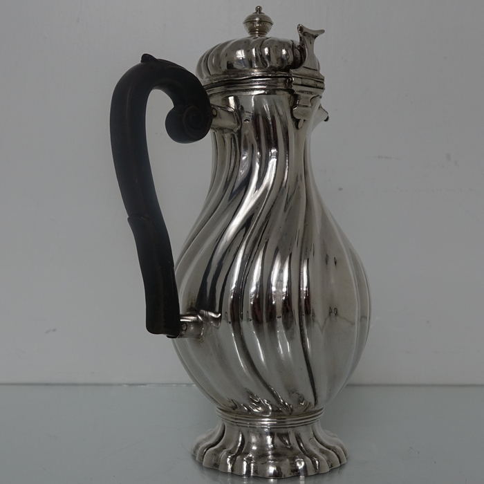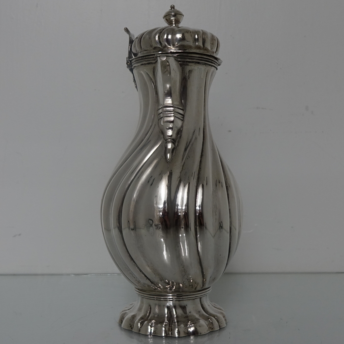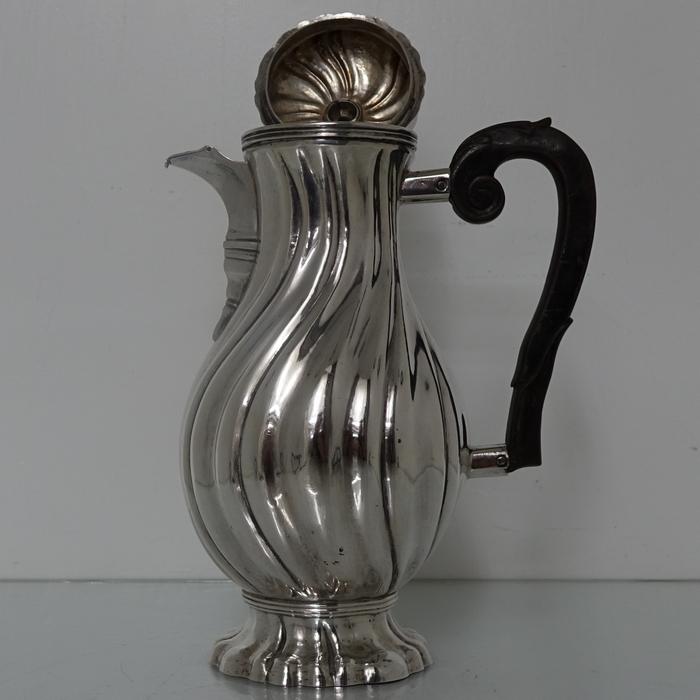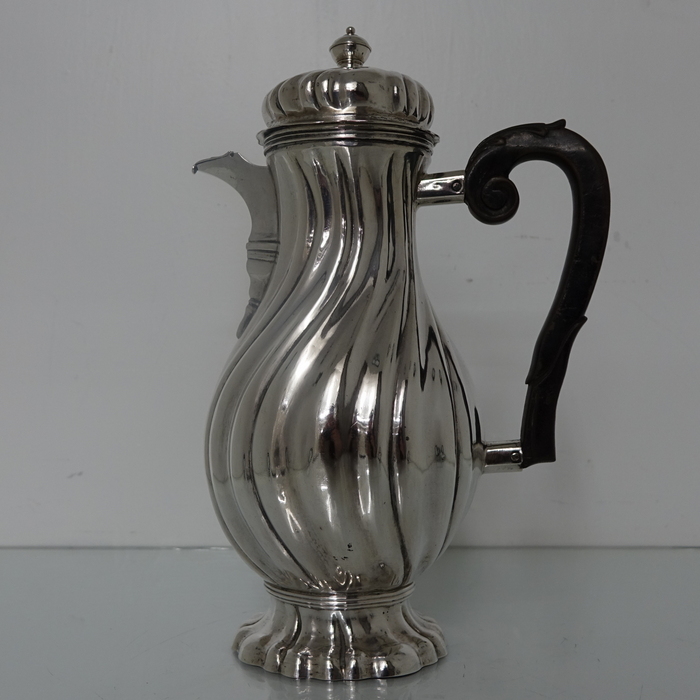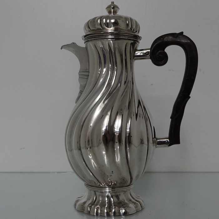 A very rare and highly collectable 18th century swirl fluted German coffee pot with elegant scroll handle. Â The pot sits on a raised pedestal foot and the lid is stylishly side hinged.