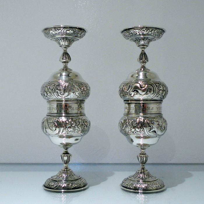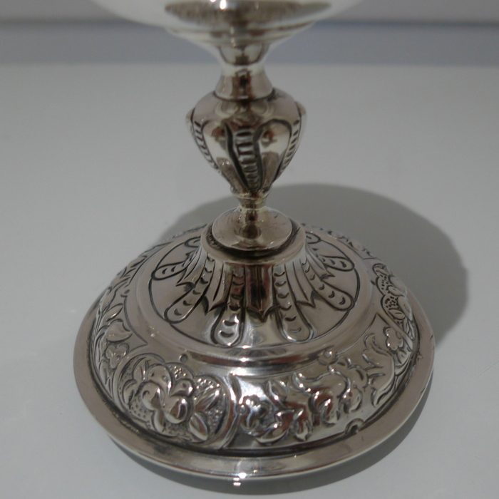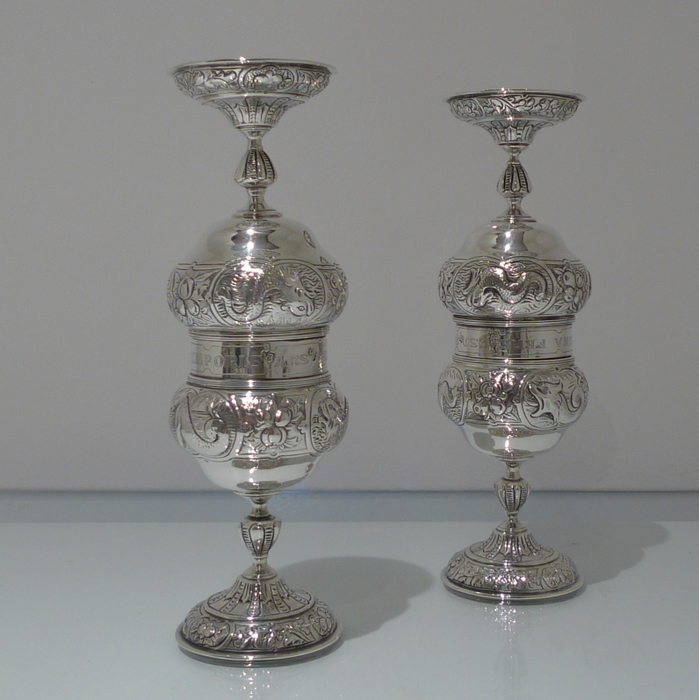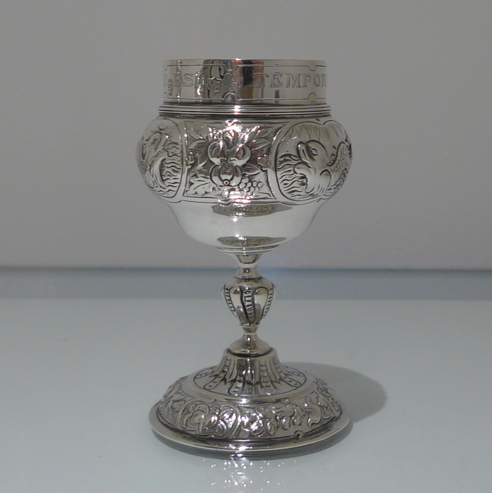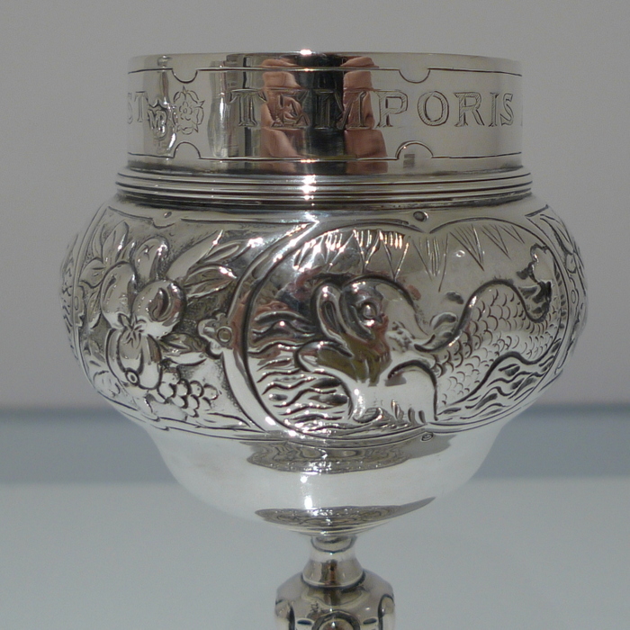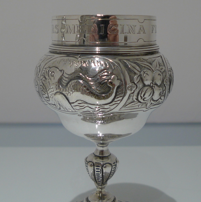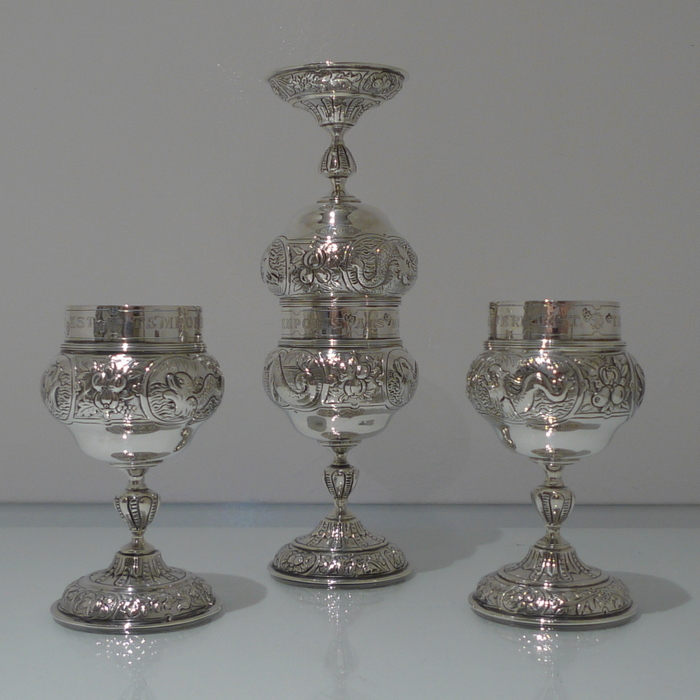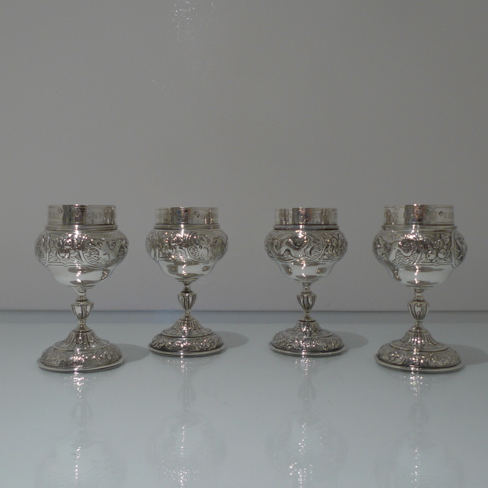 A very rare and stylish set of four double stacking German wine goblets elegantly embossed with floral and serpent motifs. Â The stems and feet have additional embossing for lowlights.