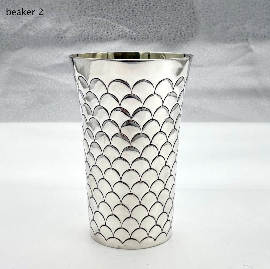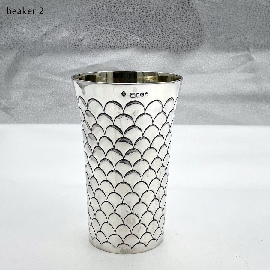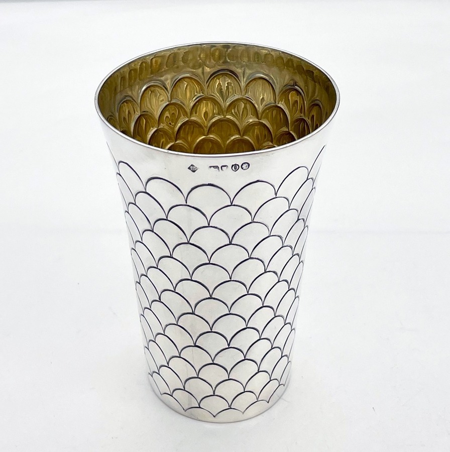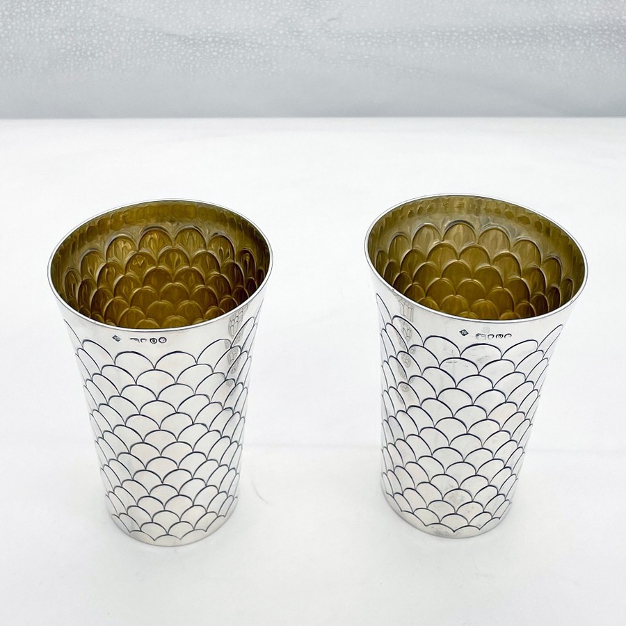 A very rare and incredibly stylish pair of Victorian silver tapering beakers decorated with sumptuous engraving and elegant gilt interiors.