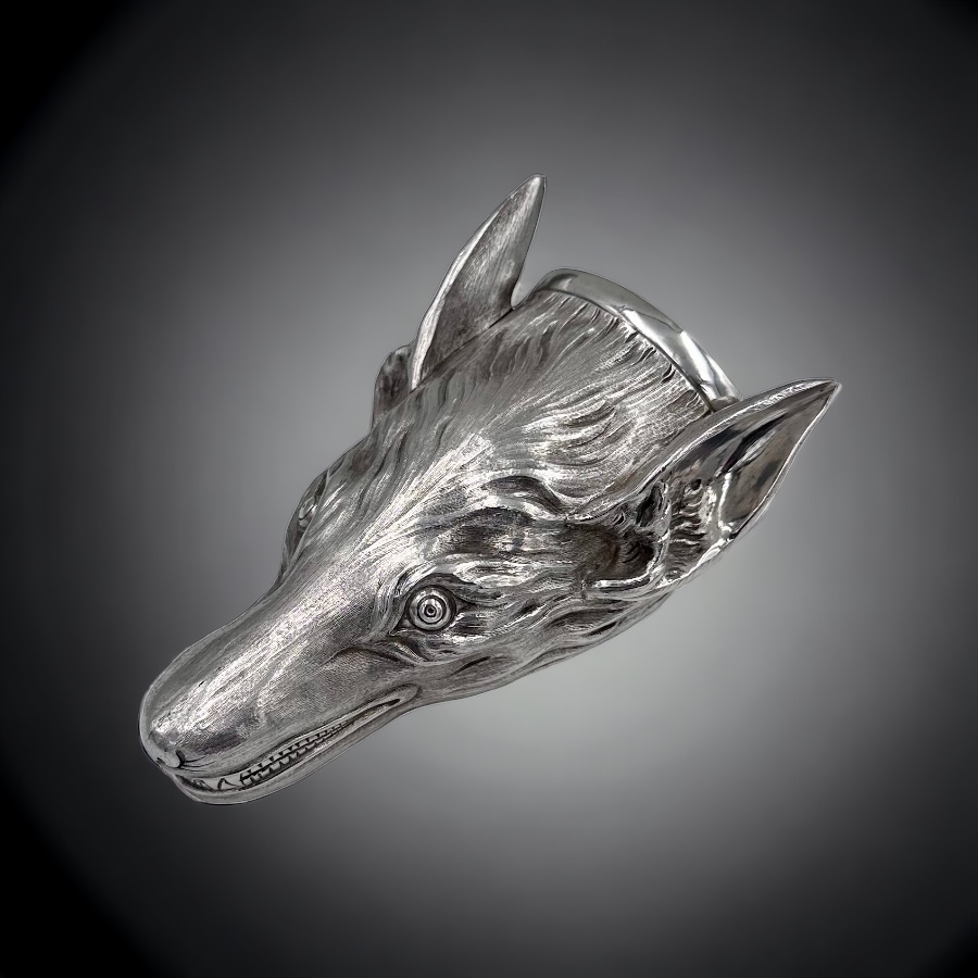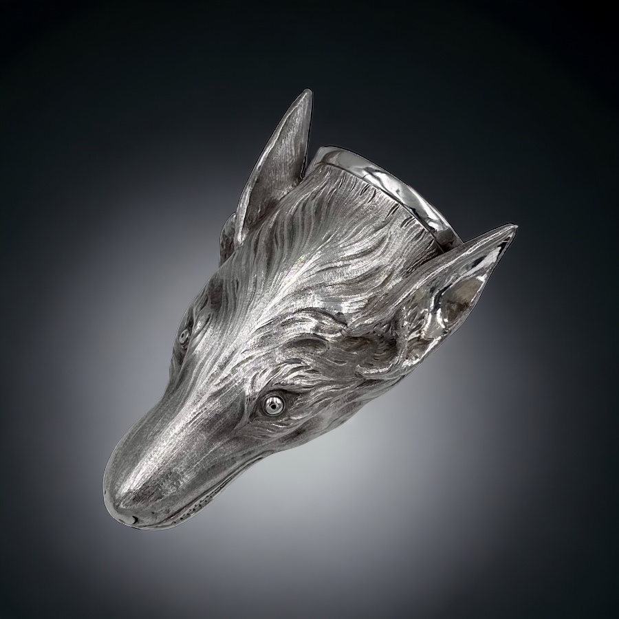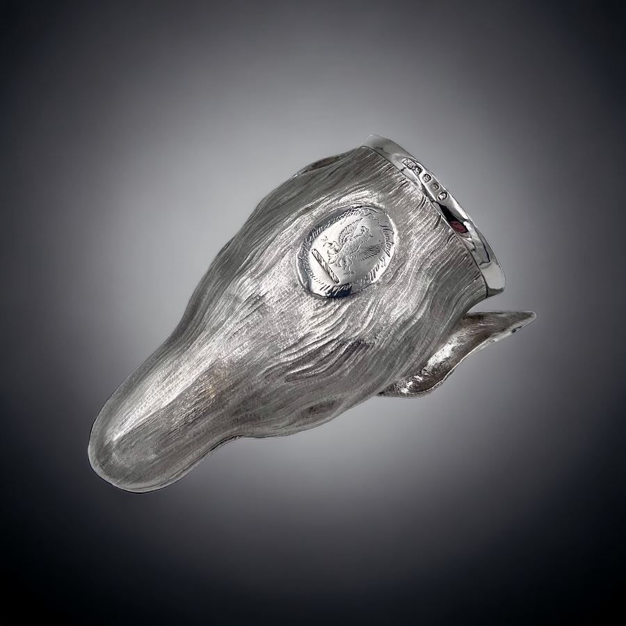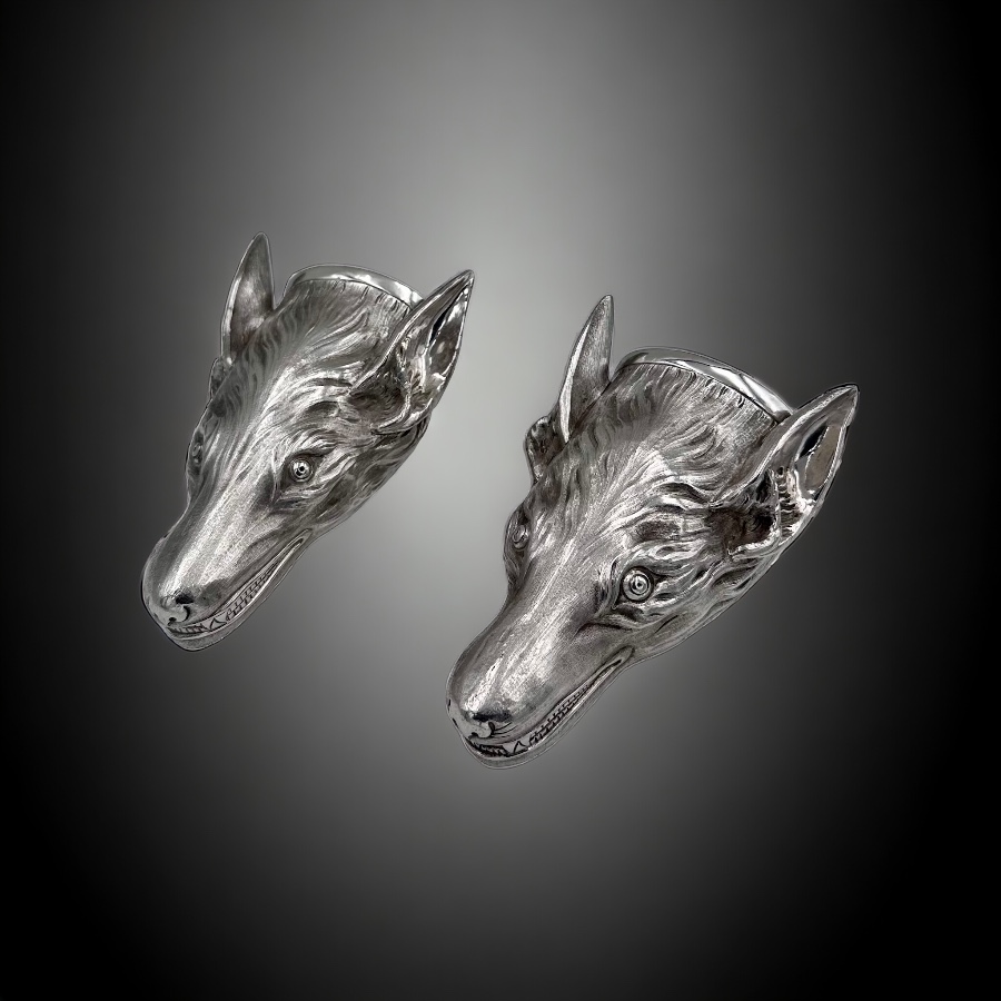 Truly rare and incredibly fine pair of cast fox head stirrup cups decorated with stunning life like features and eye catching gilt interiors. The quality of realism is sublime and on the undersides are beautiful orginial hand engraved crests set on oval cartouches.