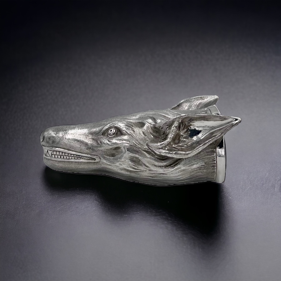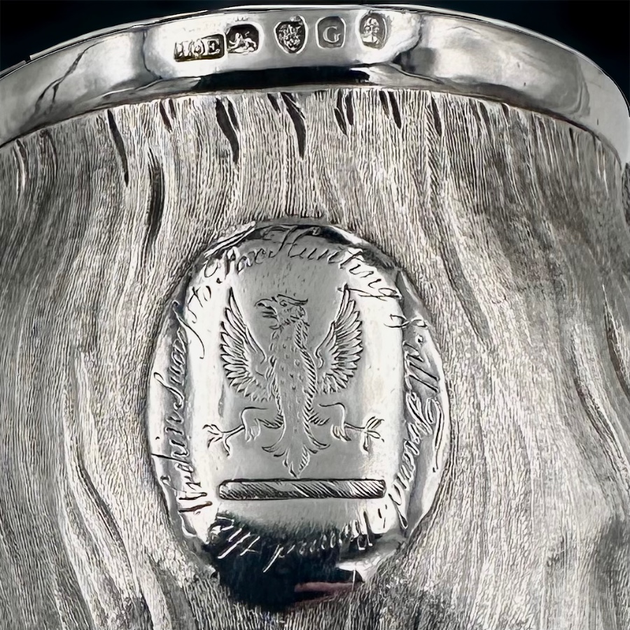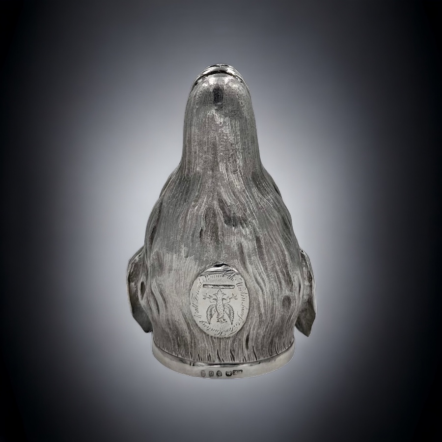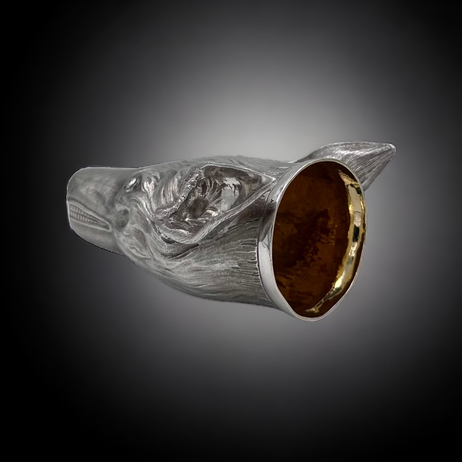 Truly rare and incredibly fine pair of cast fox head stirrup cups decorated with stunning life like features and eye catching gilt interiors. The quality of realism is sublime and on the undersides are beautiful orginial hand engraved crests set on oval cartouches.
