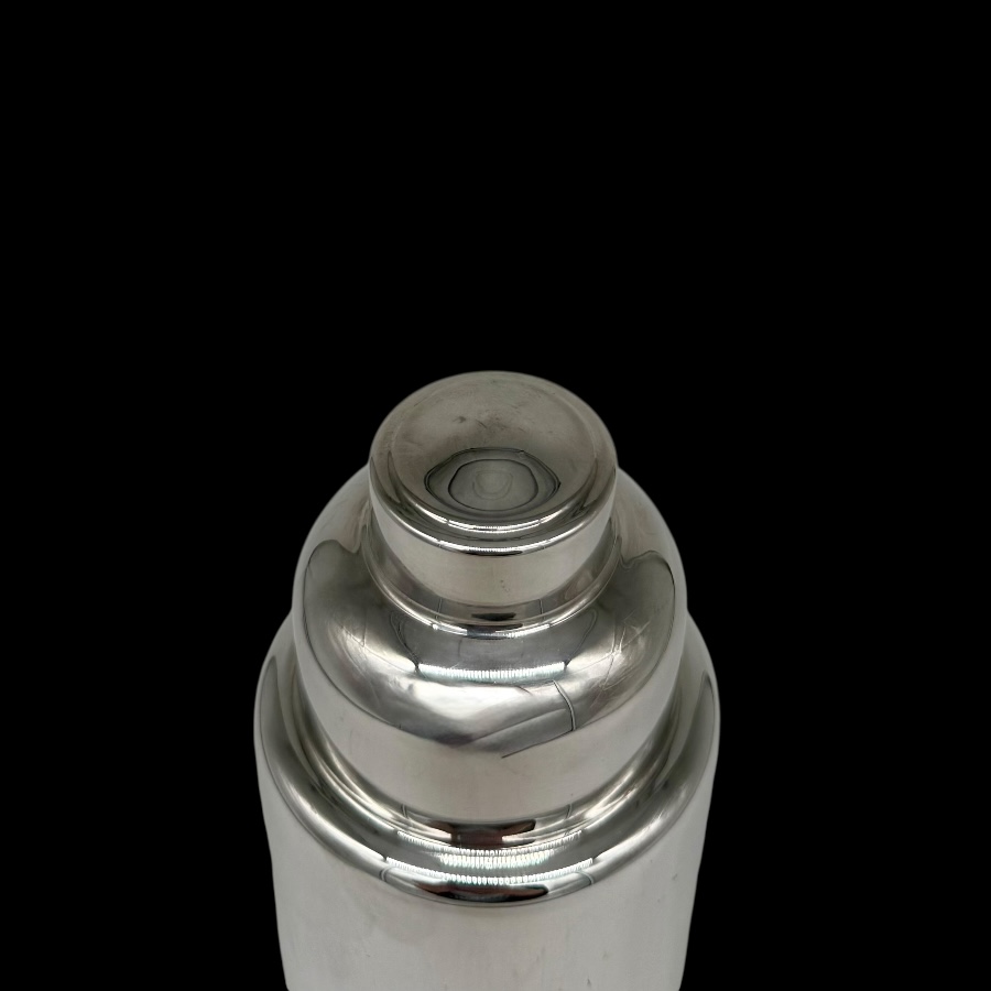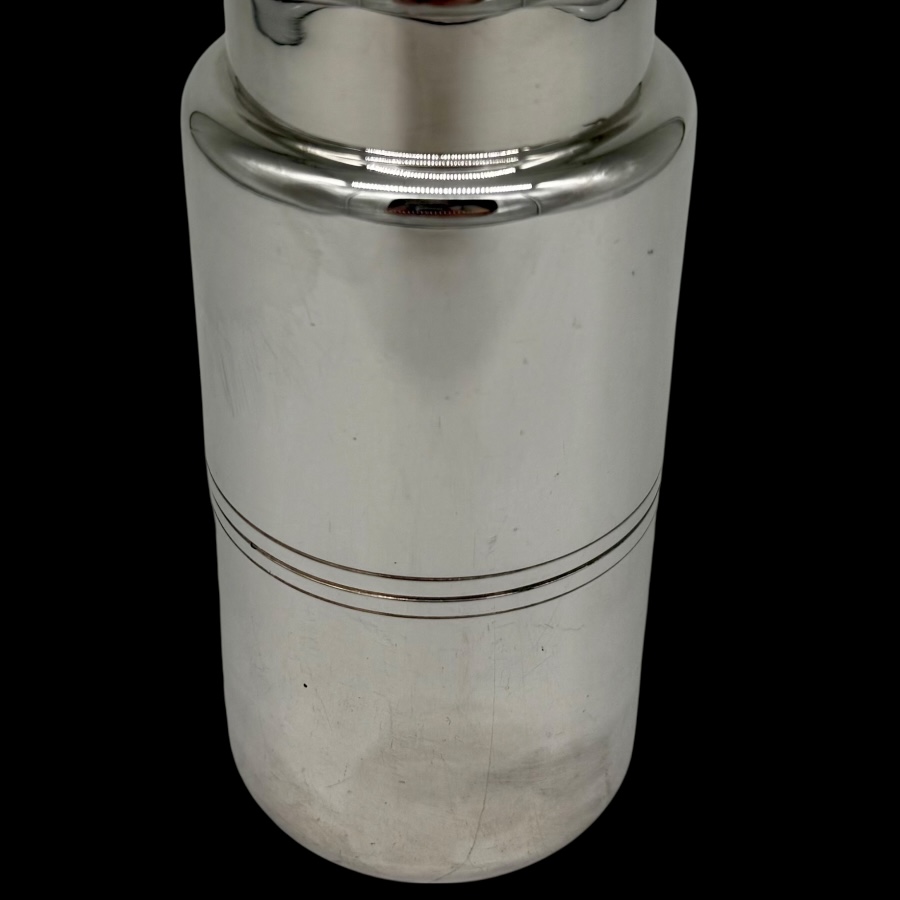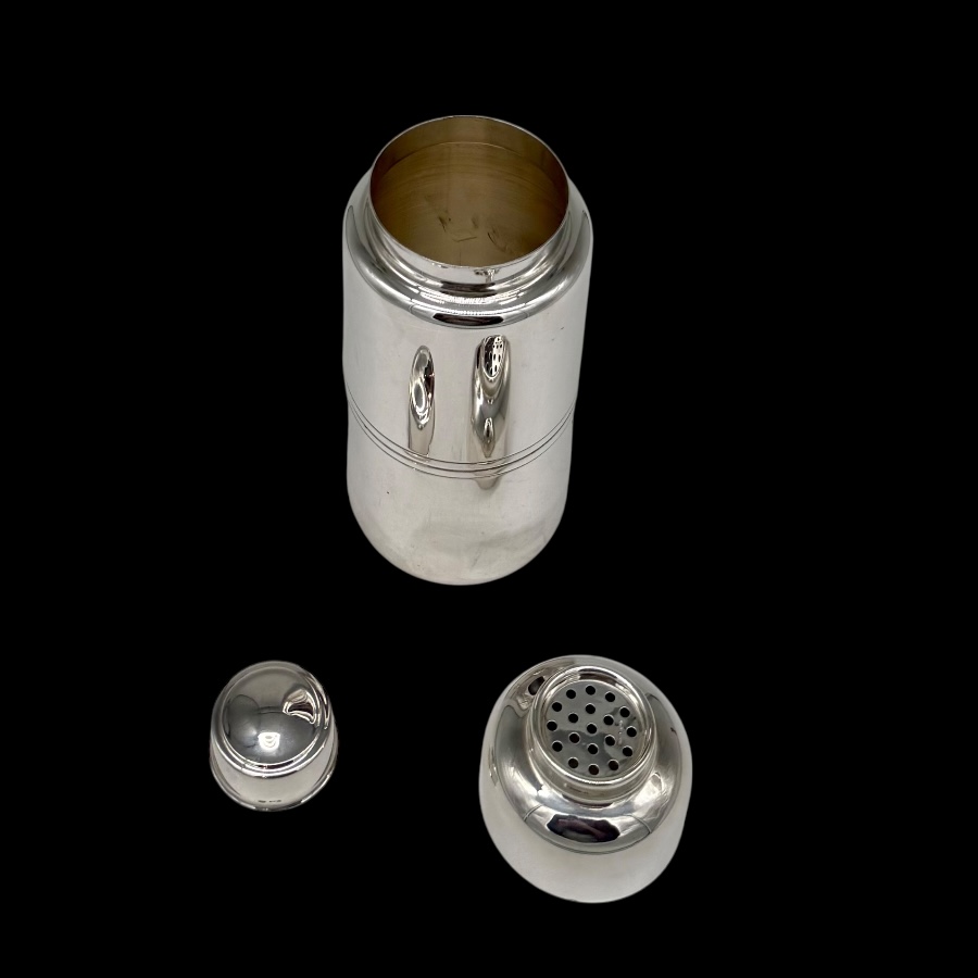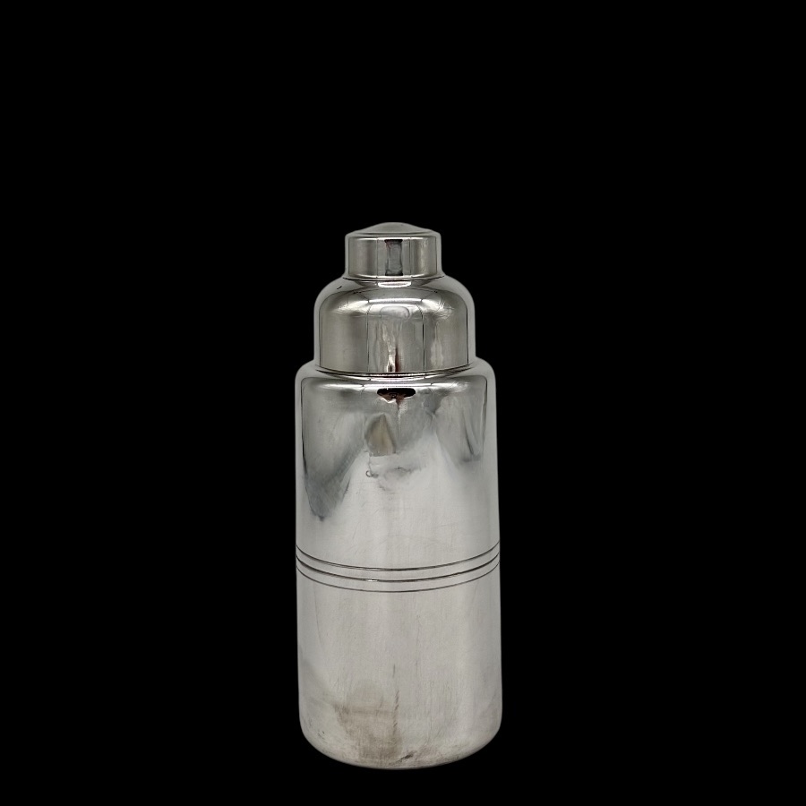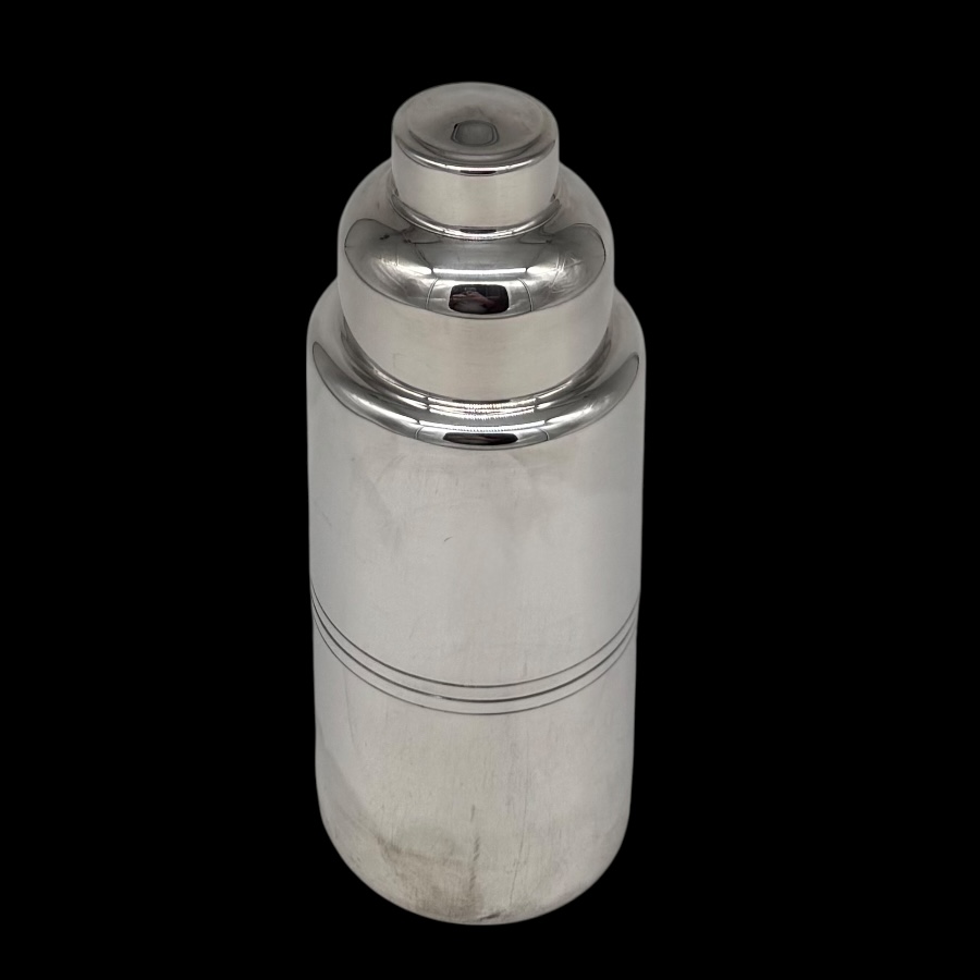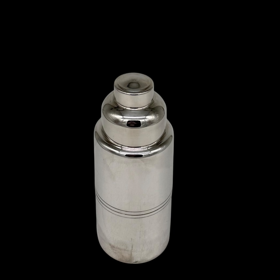 A beautifully designed plain form silver cocktail shaker decorated with elegant turnings to the body and a visually stylish detachable lid. The shaker detaches into three sections and the fiitngs are snug for confident usage.