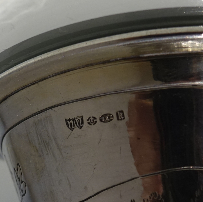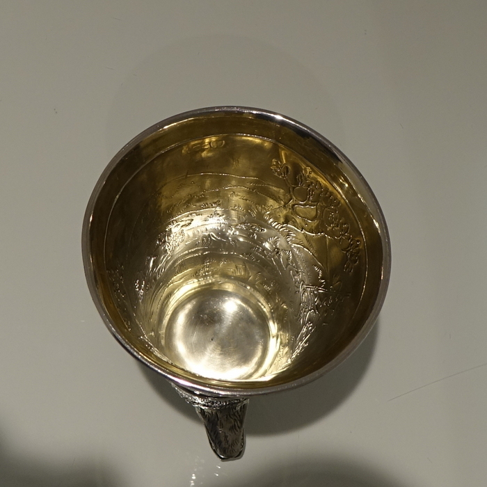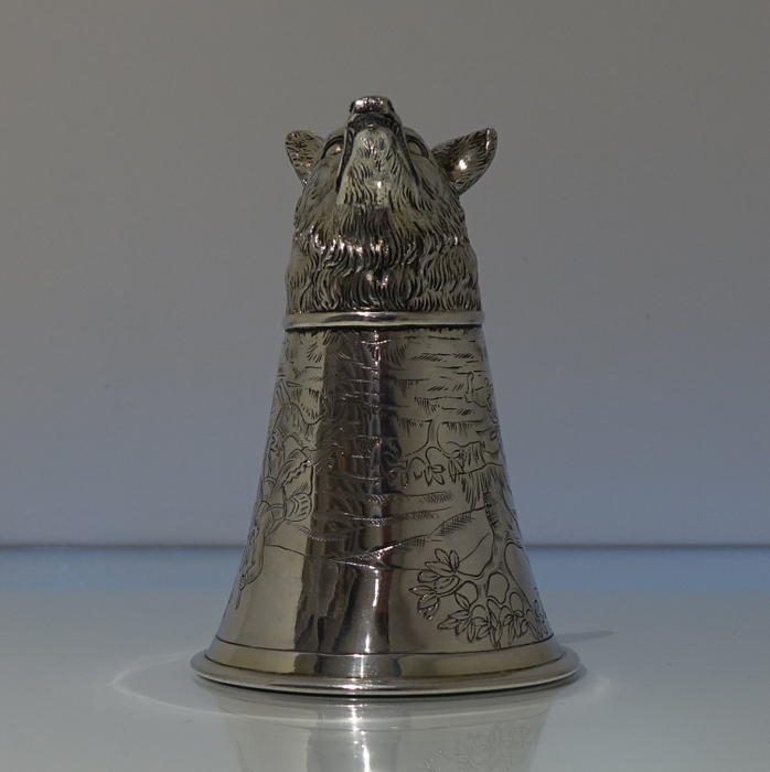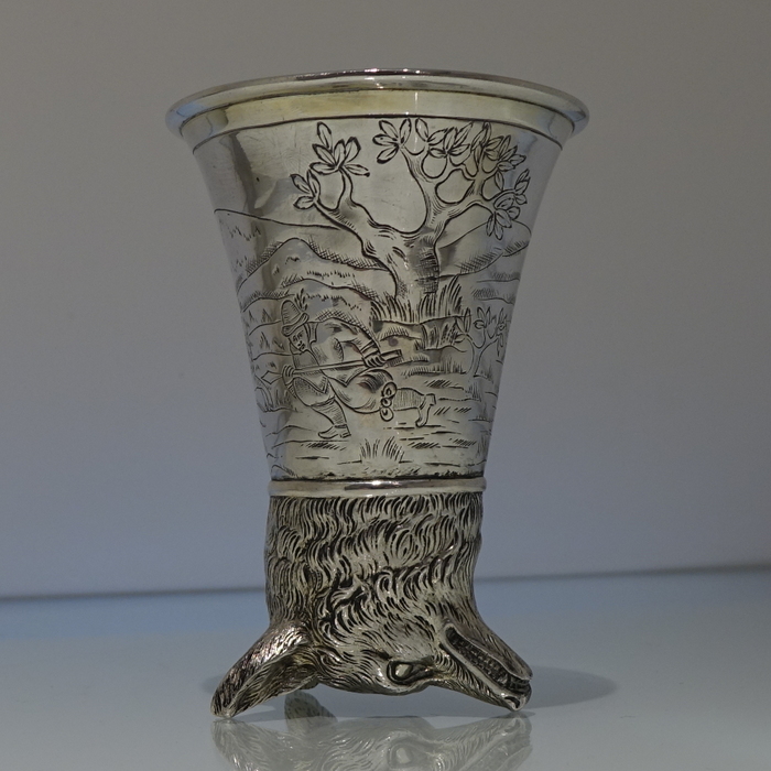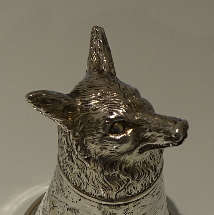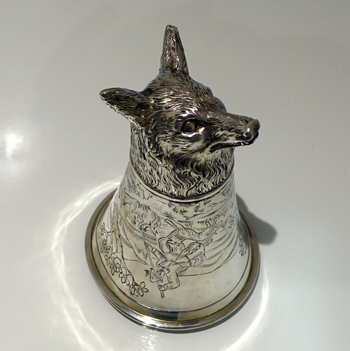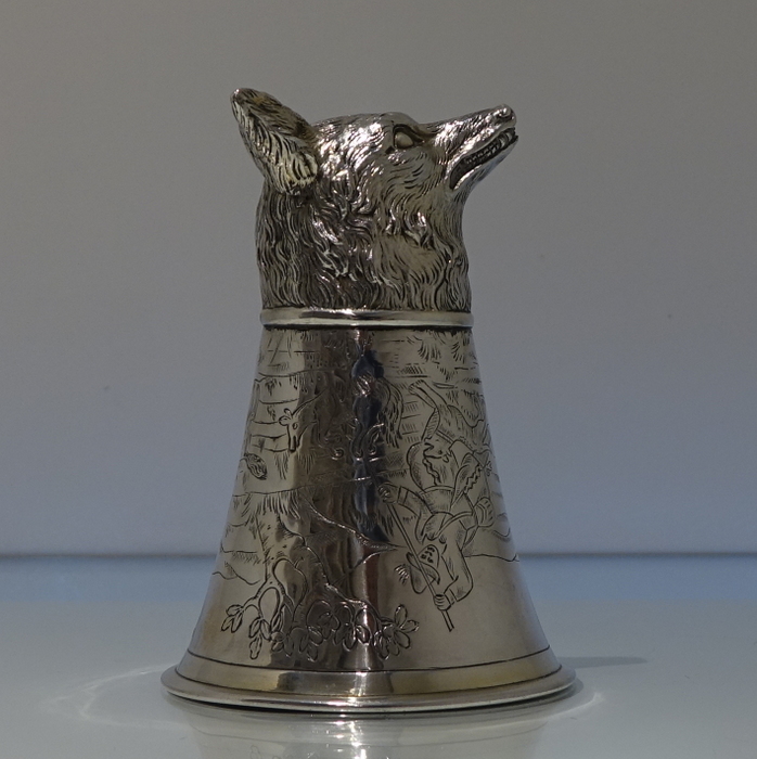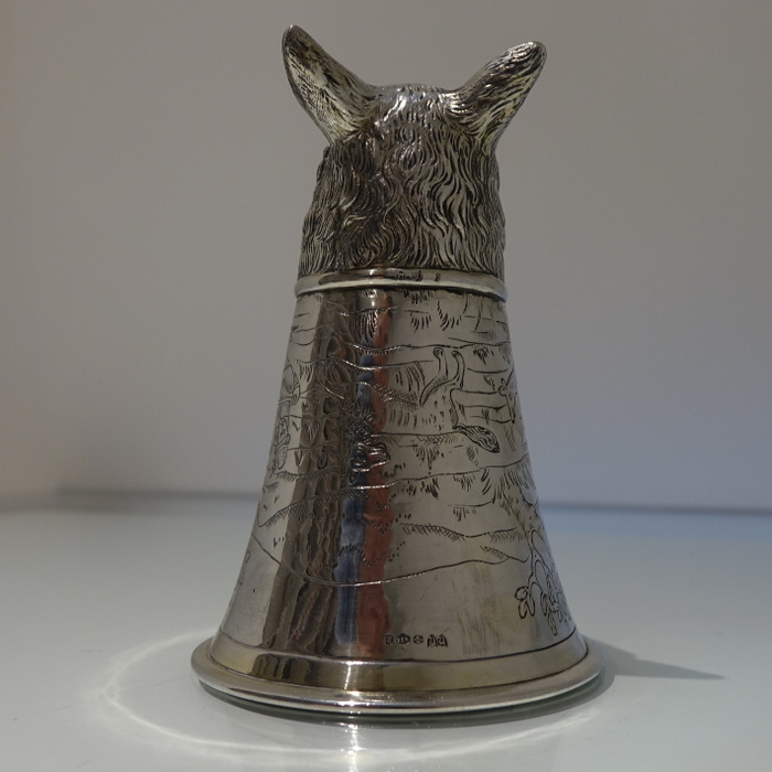A stylish early 20th century stirrup cup elegantly engraved with hunting scenes on the bowl. Â The mount is modelled on a ‘foxes head’ and is realistic in design.