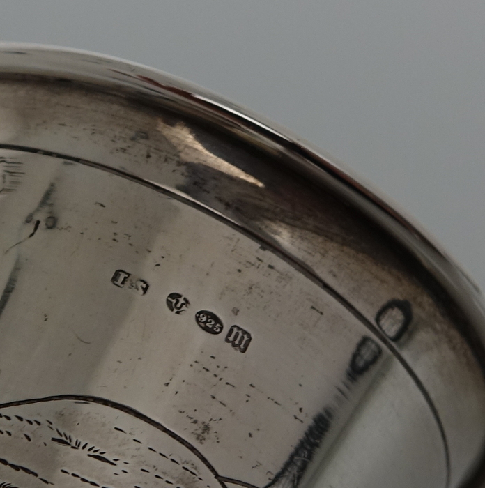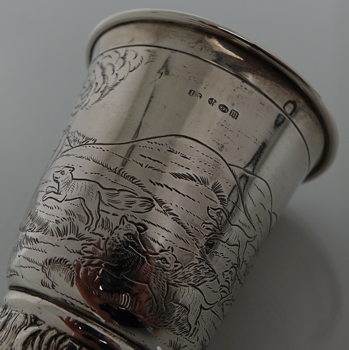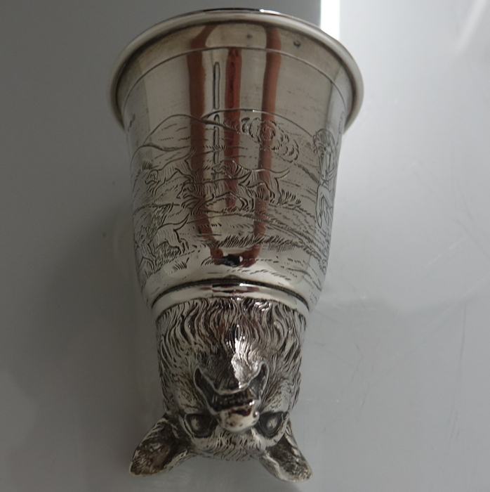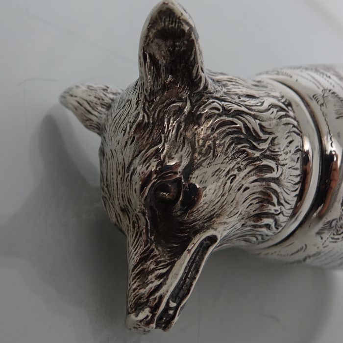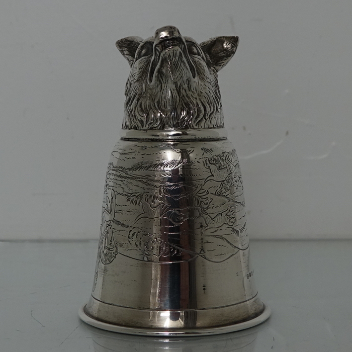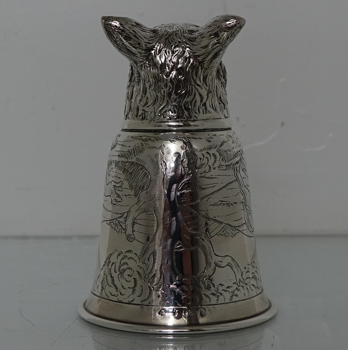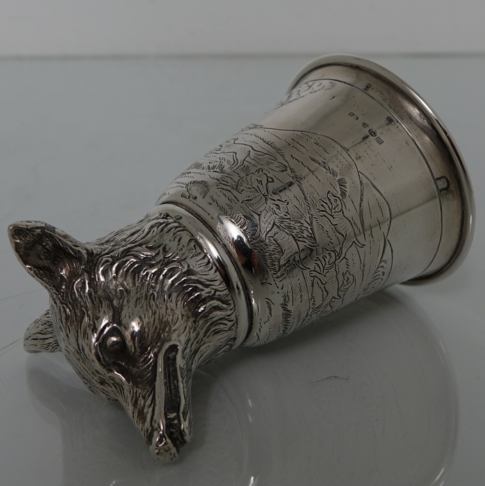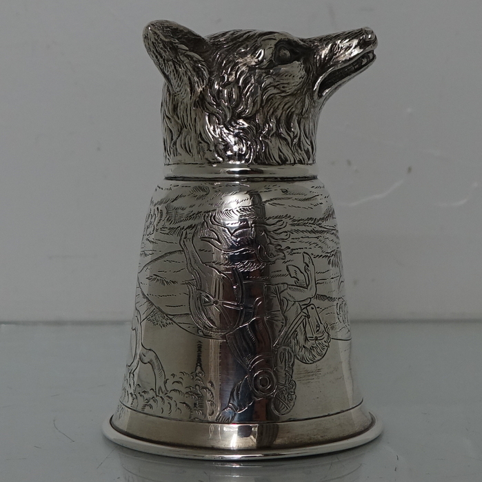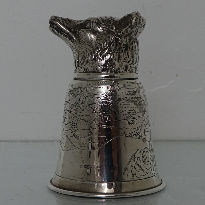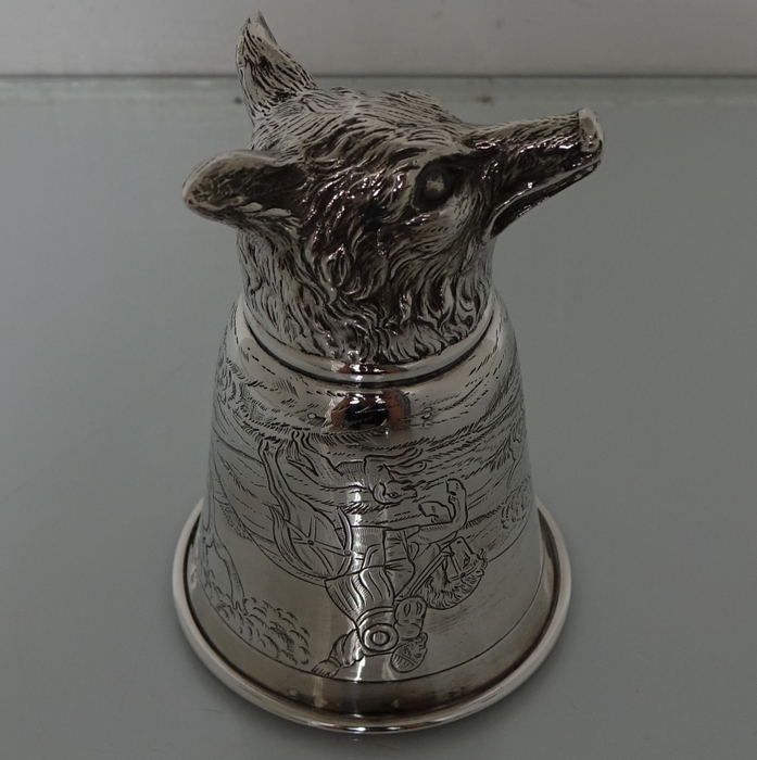 A very handsome looking and highly desirable fox model silver stirrup cup, realistic in design with attention to detail to life like features. Â The bowl of the cup is beautifully engraved with a fox hunt scene.