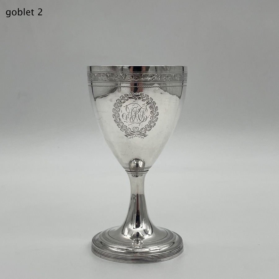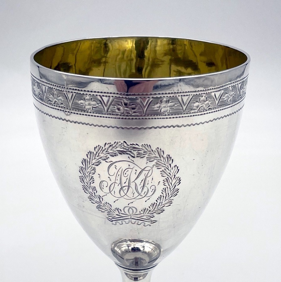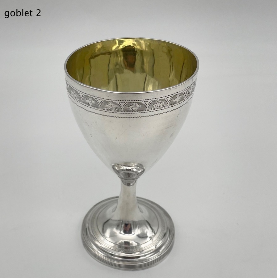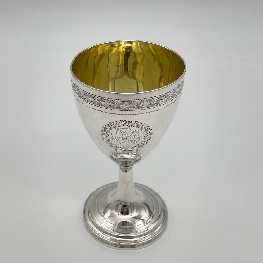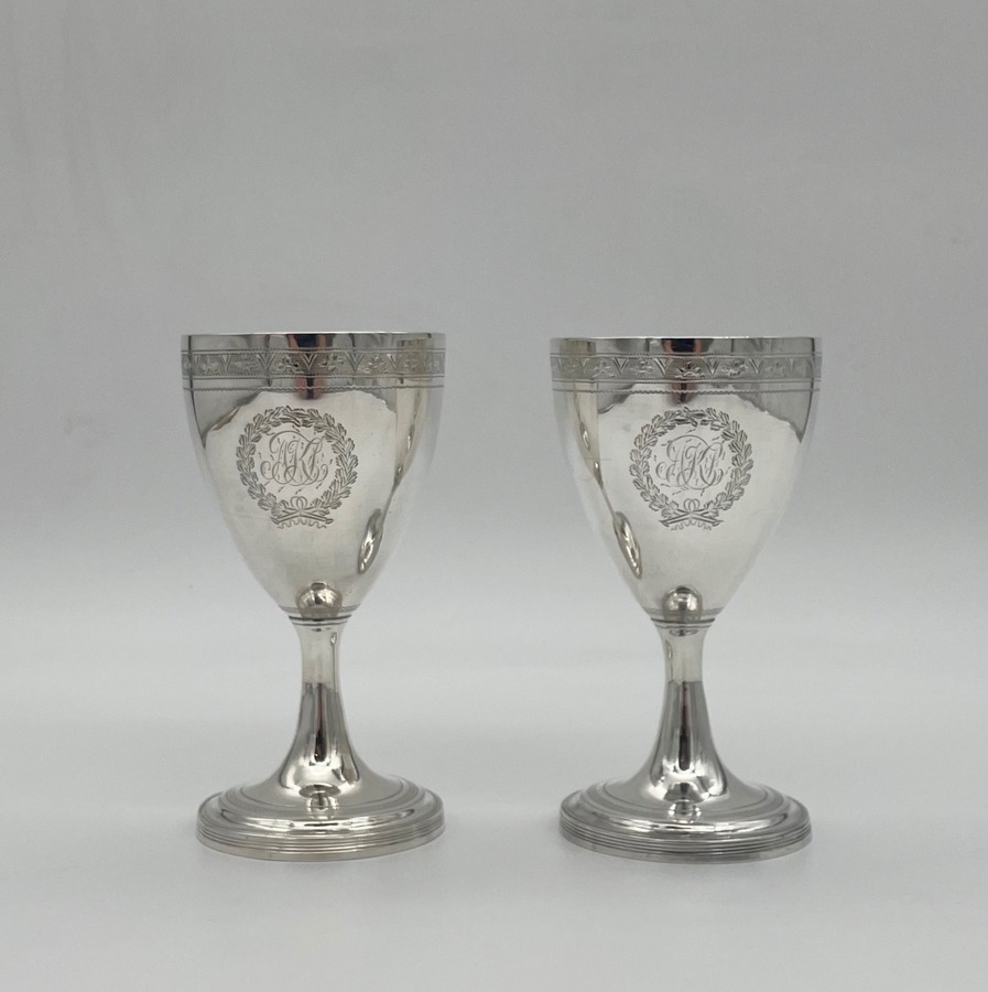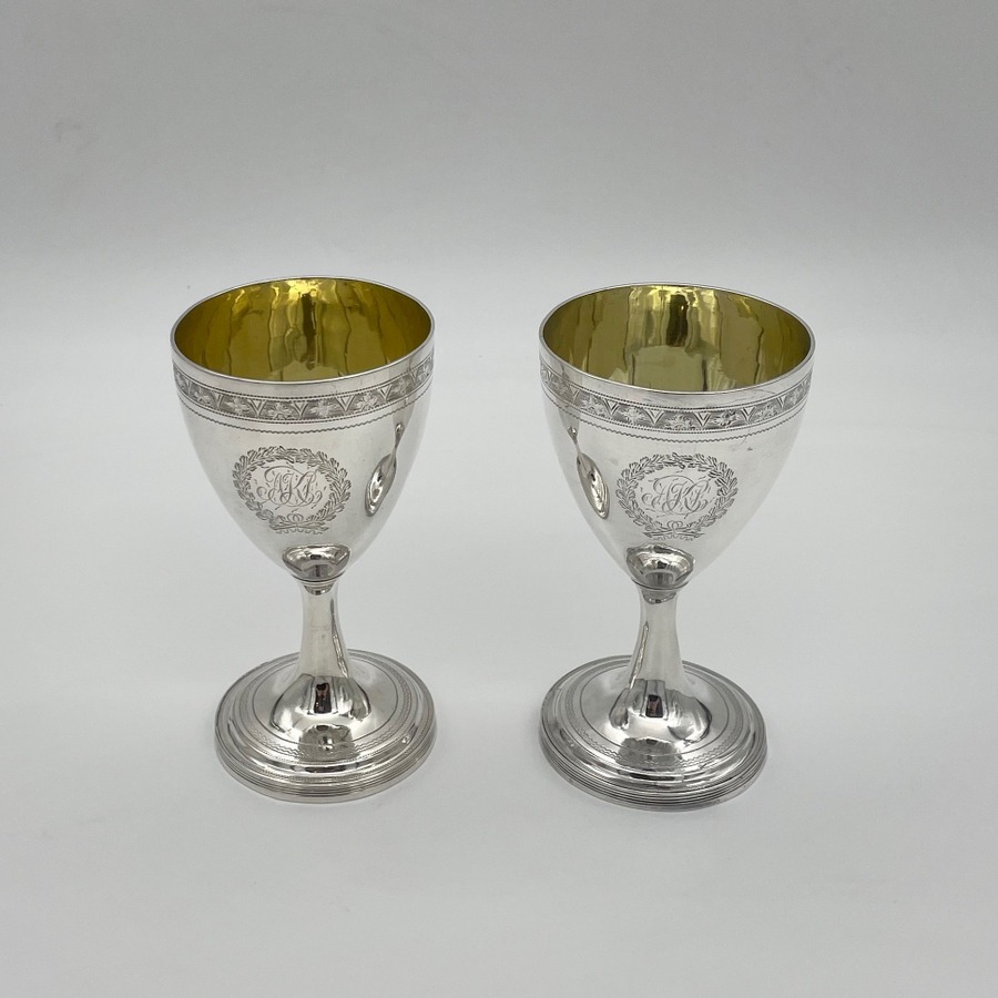 Wonderful pair of Georgian silver vase shaped pair of goblets decorated with a elegant upper bright cut engraved bands and a stylish wreath shaped cartouches in which sits contemporary hand engraved entwined initials.